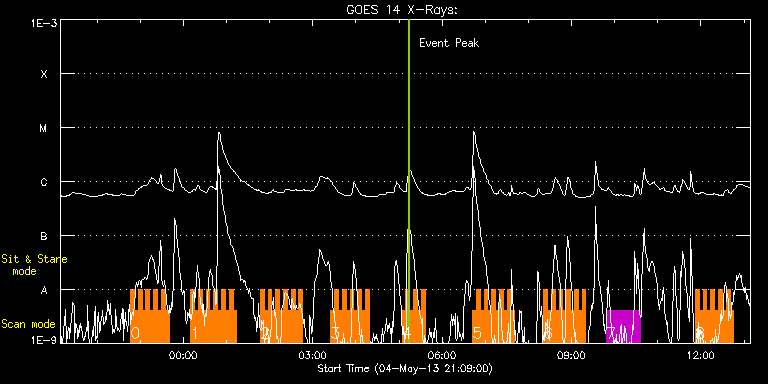 EIS Observation timeline overlay to GOES-Xray curve Code 1" 2" 40" 266" EIS Observations list for this event: STUDY ACRONYM ID DATE OBSERVED DESCRIPTION NOAA# TARGET 0 HH_Flare+AR_180x152H | 33479 | 2013/05/04 22:46:33 | Flare hunting. AR11731. | 1731 | Flare TIMELINE ID DATE OBSERVED FITS FILE XCEN (+W/-E) YCEN (+N/-S) DUR ----------------------------------------------------------------------------------------------------------------- 33479 | 2013/05/04 22:46:33.000 | eis_l0_20130504_224633.fits.gz | 772.17 | 191.10 | 5m18s 33479 | 2013/05/04 22:51:54.000 | eis_l0_20130504_225154.fits.gz | 772.55 | 191.10 | 5m18s 33479 | 2013/05/04 22:57:15.000 | eis_l0_20130504_225715.fits.gz | 773.09 | 190.94 | 5m17s 33479 | 2013/05/04 23:02:35.000 | eis_l0_20130504_230235.fits.gz | 773.40 | 191.02 | 5m19s 33479 | 2013/05/04 23:07:57.000 | eis_l0_20130504_230757.fits.gz | 773.87 | 190.94 | 5m18s 33479 | 2013/05/04 23:13:17.000 | eis_l0_20130504_231317.fits.gz | 774.33 | 190.87 | 5m18s 33479 | 2013/05/04 23:18:38.000 | eis_l0_20130504_231838.fits.gz | 774.72 | 190.94 | 5m18s 33479 | 2013/05/04 23:23:59.000 | eis_l0_20130504_232359.fits.gz | 775.26 | 190.94 | 5m17s 33479 | 2013/05/04 23:29:19.000 | eis_l0_20130504_232919.fits.gz | 775.64 | 190.87 | 5m18s 33479 | 2013/05/04 23:34:40.000 | eis_l0_20130504_233440.fits.gz | 776.18 | 190.71 | 5m18s 1 HH_Flare+AR_180x152H | 33480 | 2013/05/05 00:10:14 | Flare hunting. AR11731. | 1731 | Flare TIMELINE ID DATE OBSERVED FITS FILE XCEN (+W/-E) YCEN (+N/-S) DUR ----------------------------------------------------------------------------------------------------------------- 33480 | 2013/05/05 00:10:14.000 | eis_l0_20130505_001014.fits.gz | 779.12 | 190.48 | 5m18s 33480 | 2013/05/05 00:15:35.000 | eis_l0_20130505_001535.fits.gz | 779.51 | 190.40 | 5m18s 33480 | 2013/05/05 00:20:55.000 | eis_l0_20130505_002055.fits.gz | 780.05 | 190.25 | 5m18s 33480 | 2013/05/05 00:26:16.000 | eis_l0_20130505_002616.fits.gz | 780.51 | 190.32 | 5m18s 33480 | 2013/05/05 00:31:37.000 | eis_l0_20130505_003137.fits.gz | 780.97 | 190.25 | 5m18s 33480 | 2013/05/05 00:36:58.000 | eis_l0_20130505_003658.fits.gz | 781.36 | 190.09 | 5m18s 33480 | 2013/05/05 00:42:19.000 | eis_l0_20130505_004219.fits.gz | 781.90 | 190.09 | 5m18s 33480 | 2013/05/05 00:47:40.000 | eis_l0_20130505_004740.fits.gz | 782.21 | 190.09 | 5m18s 33480 | 2013/05/05 00:53:00.000 | eis_l0_20130505_005300.fits.gz | 782.67 | 190.09 | 5m19s 33480 | 2013/05/05 00:58:21.000 | eis_l0_20130505_005821.fits.gz | 783.14 | 189.94 | 5m19s 33480 | 2013/05/05 01:03:42.000 | eis_l0_20130505_010342.fits.gz | 783.68 | 189.94 | 5m19s 33480 | 2013/05/05 01:09:03.000 | eis_l0_20130505_010903.fits.gz | 784.14 | 189.71 | 5m18s 2 HH_Flare+AR_180x152H | 33481 | 2013/05/05 01:47:13 | Flare hunting. AR11731. | 1731 | Flare TIMELINE ID DATE OBSERVED FITS FILE XCEN (+W/-E) YCEN (+N/-S) DUR ----------------------------------------------------------------------------------------------------------------- 33481 | 2013/05/05 01:47:13.000 | eis_l0_20130505_014713.fits.gz | 787.15 | 189.48 | 5m18s 33481 | 2013/05/05 01:52:34.000 | eis_l0_20130505_015234.fits.gz | 787.54 | 189.63 | 5m17s 33481 | 2013/05/05 01:57:54.000 | eis_l0_20130505_015754.fits.gz | 788.00 | 189.55 | 5m18s 33481 | 2013/05/05 02:03:15.000 | eis_l0_20130505_020315.fits.gz | 788.47 | 189.24 | 5m18s 33481 | 2013/05/05 02:08:36.000 | eis_l0_20130505_020836.fits.gz | 788.93 | 189.24 | 5m19s 33481 | 2013/05/05 02:13:58.000 | eis_l0_20130505_021358.fits.gz | 789.39 | 189.17 | 5m18s 33481 | 2013/05/05 02:19:18.000 | eis_l0_20130505_021918.fits.gz | 789.78 | 189.09 | 5m18s 33481 | 2013/05/05 02:24:39.000 | eis_l0_20130505_022439.fits.gz | 790.24 | 189.17 | 5m18s 33481 | 2013/05/05 02:29:59.000 | eis_l0_20130505_022959.fits.gz | 790.55 | 189.09 | 5m19s 33481 | 2013/05/05 02:35:21.000 | eis_l0_20130505_023521.fits.gz | 791.02 | 189.01 | 5m17s 33481 | 2013/05/05 02:40:41.000 | eis_l0_20130505_024041.fits.gz | 791.48 | 189.17 | 5m19s 3 HH_Flare+AR_180x152H | 33482 | 2013/05/05 03:25:13 | Flare hunting. AR11731. | 1731 | Flare TIMELINE ID DATE OBSERVED FITS FILE XCEN (+W/-E) YCEN (+N/-S) DUR ----------------------------------------------------------------------------------------------------------------- 33482 | 2013/05/05 03:25:13.000 | eis_l0_20130505_032513.fits.gz | 795.03 | 188.70 | 5m19s 33482 | 2013/05/05 03:30:35.000 | eis_l0_20130505_033035.fits.gz | 795.50 | 188.70 | 5m18s 33482 | 2013/05/05 03:35:55.000 | eis_l0_20130505_033555.fits.gz | 795.88 | 188.63 | 5m19s 33482 | 2013/05/05 03:41:16.000 | eis_l0_20130505_034116.fits.gz | 796.35 | 188.47 | 5m19s 33482 | 2013/05/05 03:46:37.000 | eis_l0_20130505_034637.fits.gz | 796.73 | 188.32 | 5m18s 33482 | 2013/05/05 03:51:58.000 | eis_l0_20130505_035158.fits.gz | 797.12 | 188.39 | 5m19s 33482 | 2013/05/05 03:57:20.000 | eis_l0_20130505_035720.fits.gz | 797.58 | 188.16 | 5m17s 33482 | 2013/05/05 04:02:40.000 | eis_l0_20130505_040240.fits.gz | 797.97 | 188.24 | 5m17s 33482 | 2013/05/05 04:08:00.000 | eis_l0_20130505_040800.fits.gz | 798.43 | 188.32 | 5m18s 33482 | 2013/05/05 04:13:21.000 | eis_l0_20130505_041321.fits.gz | 798.82 | 188.24 | 5m18s 4 HH_Flare+AR_180x152H | 33483 | 2013/05/05 05:04:13 | Flare hunting. AR11731. | 1731 | Flare TIMELINE ID DATE OBSERVED FITS FILE XCEN (+W/-E) YCEN (+N/-S) DUR ----------------------------------------------------------------------------------------------------------------- 33483 | 2013/05/05 05:04:13.000 | eis_l0_20130505_050413.fits.gz | 802.84 | 187.62 | 5m18s 33483 | 2013/05/05 05:09:34.000 | eis_l0_20130505_050934.fits.gz | 803.22 | 187.62 | 5m18s 33483 | 2013/05/05 05:14:55.000 | eis_l0_20130505_051455.fits.gz | 803.68 | 187.62 | 5m17s 33483 | 2013/05/05 05:20:15.000 | eis_l0_20130505_052015.fits.gz | 804.07 | 187.54 | 5m18s 33483 | 2013/05/05 05:25:35.000 | eis_l0_20130505_052535.fits.gz | 804.53 | 187.47 | 5m19s 33483 | 2013/05/05 05:30:56.000 | eis_l0_20130505_053056.fits.gz | 804.84 | 187.31 | 5m18s 5 HH_
