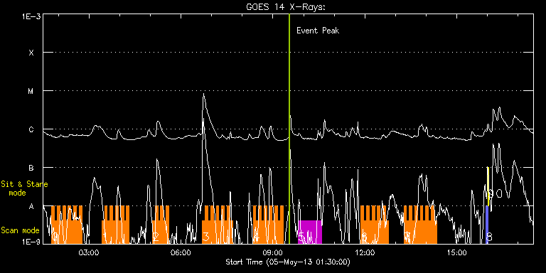EIS Observation timeline overlay to GOES-Xray curve Code 1" 2" 40" 266" EIS Observations list for this event: STUDY ACRONYM ID DATE OBSERVED DESCRIPTION NOAA# TARGET 0 HH_Flare+AR_180x152H | 33481 | 2013/05/05 01:47:13 | Flare hunting. AR11731. | 1731 | Flare TIMELINE ID DATE OBSERVED FITS FILE XCEN (+W/-E) YCEN (+N/-S) DUR ----------------------------------------------------------------------------------------------------------------- 33481 | 2013/05/05 01:47:13.000 | eis_l0_20130505_014713.fits.gz | 787.15 | 189.48 | 5m18s 33481 | 2013/05/05 01:52:34.000 | eis_l0_20130505_015234.fits.gz | 787.54 | 189.63 | 5m17s 33481 | 2013/05/05 01:57:54.000 | eis_l0_20130505_015754.fits.gz | 788.00 | 189.55 | 5m18s 33481 | 2013/05/05 02:03:15.000 | eis_l0_20130505_020315.fits.gz | 788.47 | 189.24 | 5m18s 33481 | 2013/05/05 02:08:36.000 | eis_l0_20130505_020836.fits.gz | 788.93 | 189.24 | 5m19s 33481 | 2013/05/05 02:13:58.000 | eis_l0_20130505_021358.fits.gz | 789.39 | 189.17 | 5m18s 33481 | 2013/05/05 02:19:18.000 | eis_l0_20130505_021918.fits.gz | 789.78 | 189.09 | 5m18s 33481 | 2013/05/05 02:24:39.000 | eis_l0_20130505_022439.fits.gz | 790.24 | 189.17 | 5m18s 33481 | 2013/05/05 02:29:59.000 | eis_l0_20130505_022959.fits.gz | 790.55 | 189.09 | 5m19s 33481 | 2013/05/05 02:35:21.000 | eis_l0_20130505_023521.fits.gz | 791.02 | 189.01 | 5m17s 33481 | 2013/05/05 02:40:41.000 | eis_l0_20130505_024041.fits.gz | 791.48 | 189.17 | 5m19s 1 HH_Flare+AR_180x152H | 33482 | 2013/05/05 03:25:13 | Flare hunting. AR11731. | 1731 | Flare TIMELINE ID DATE OBSERVED FITS FILE XCEN (+W/-E) YCEN (+N/-S) DUR ----------------------------------------------------------------------------------------------------------------- 33482 | 2013/05/05 03:25:13.000 | eis_l0_20130505_032513.fits.gz | 795.03 | 188.70 | 5m19s 33482 | 2013/05/05 03:30:35.000 | eis_l0_20130505_033035.fits.gz | 795.50 | 188.70 | 5m18s 33482 | 2013/05/05 03:35:55.000 | eis_l0_20130505_033555.fits.gz | 795.88 | 188.63 | 5m19s 33482 | 2013/05/05 03:41:16.000 | eis_l0_20130505_034116.fits.gz | 796.35 | 188.47 | 5m19s 33482 | 2013/05/05 03:46:37.000 | eis_l0_20130505_034637.fits.gz | 796.73 | 188.32 | 5m18s 33482 | 2013/05/05 03:51:58.000 | eis_l0_20130505_035158.fits.gz | 797.12 | 188.39 | 5m19s 33482 | 2013/05/05 03:57:20.000 | eis_l0_20130505_035720.fits.gz | 797.58 | 188.16 | 5m17s 33482 | 2013/05/05 04:02:40.000 | eis_l0_20130505_040240.fits.gz | 797.97 | 188.24 | 5m17s 33482 | 2013/05/05 04:08:00.000 | eis_l0_20130505_040800.fits.gz | 798.43 | 188.32 | 5m18s 33482 | 2013/05/05 04:13:21.000 | eis_l0_20130505_041321.fits.gz | 798.82 | 188.24 | 5m18s 2 HH_Flare+AR_180x152H | 33483 | 2013/05/05 05:04:13 | Flare hunting. AR11731. | 1731 | Flare TIMELINE ID DATE OBSERVED FITS FILE XCEN (+W/-E) YCEN (+N/-S) DUR ----------------------------------------------------------------------------------------------------------------- 33483 | 2013/05/05 05:04:13.000 | eis_l0_20130505_050413.fits.gz | 802.84 | 187.62 | 5m18s 33483 | 2013/05/05 05:09:34.000 | eis_l0_20130505_050934.fits.gz | 803.22 | 187.62 | 5m18s 33483 | 2013/05/05 05:14:55.000 | eis_l0_20130505_051455.fits.gz | 803.68 | 187.62 | 5m17s 33483 | 2013/05/05 05:20:15.000 | eis_l0_20130505_052015.fits.gz | 804.07 | 187.54 | 5m18s 33483 | 2013/05/05 05:25:35.000 | eis_l0_20130505_052535.fits.gz | 804.53 | 187.47 | 5m19s 33483 | 2013/05/05 05:30:56.000 | eis_l0_20130505_053056.fits.gz | 804.84 | 187.31 | 5m18s 3 HH_Flare+AR_180x152H | 33484 | 2013/05/05 06:42:14 | Flare hunting. AR11731. | 1731 | Flare TIMELINE ID DATE OBSERVED FITS FILE XCEN (+W/-E) YCEN (+N/-S) DUR ----------------------------------------------------------------------------------------------------------------- 33484 | 2013/05/05 06:42:14.000 | eis_l0_20130505_064214.fits.gz | 810.25 | 186.85 | 5m18s 33484 | 2013/05/05 06:47:35.000 | eis_l0_20130505_064735.fits.gz | 810.64 | 186.77 | 5m18s 33484 | 2013/05/05 06:52:56.000 | eis_l0_20130505_065256.fits.gz | 811.10 | 186.77 | 5m19s 33484 | 2013/05/05 06:58:17.000 | eis_l0_20130505_065817.fits.gz | 811.56 | 186.70 | 5m18s 33484 | 2013/05/05 07:03:38.000 | eis_l0_20130505_070338.fits.gz | 811.95 | 186.54 | 5m18s 33484 | 2013/05/05 07:08:58.000 | eis_l0_20130505_070858.fits.gz | 812.34 | 186.54 | 5m18s 33484 | 2013/05/05 07:14:19.000 | eis_l0_20130505_071419.fits.gz | 812.72 | 186.39 | 5m18s 33484 | 2013/05/05 07:19:39.000 | eis_l0_20130505_071939.fits.gz | 813.11 | 186.39 | 5m18s 33484 | 2013/05/05 07:25:00.000 | eis_l0_20130505_072500.fits.gz | 813.49 | 186.39 | 5m18s 33484 | 2013/05/05 07:30:21.000 | eis_l0_20130505_073021.fits.gz | 813.88 | 186.23 | 5m17s 33484 | 2013/05/05 07:35:41.000 | eis_l0_20130505_073541.fits.gz | 814.34 | 186.23 | 5m17s 4 HH_Flare+AR_180x152H | 33485 | 2013/05/05 08:21:13 | Flare hunting. AR11731. | 1731 | Flare TIMELINE ID DATE OBSERVED FITS FILE XCEN (+W/-E) YCEN (+N/-S) DUR ----------------------------------------------------------------------------------------------------------------- 33485 | 2013/05/05 08:21:13.000 | eis_l0_20130505_082113.fits.gz | 817.59 | 185.69 | 5m18s 33485 | 2013/05/05 08:26:34.000 | eis_l0_20130505_082634.fits.gz | 817.98 | 185.92 | 5m18s 33485 | 2013/05/05 08:31:55.000 | eis_l0_20130505_083155.fits.gz | 818.59 | 185.69 | 5m17s 33485 | 2013/05/05 08:37:15.000 | eis_l0_20130505_083715.fits.gz | 818.90 | 185.61 | 5m17s 33485 | 2013/05/05 08:42:35.000 | eis_l0_20130505_084235.fits.gz | 819.21 | 185.54 | 5m18s 33485 | 2013/05/05 08:47:56.000 | eis_l0_20130505_084756.fits.gz | 819.60 | 185.54 | 5m18s 33485 | 2013/05/05 08:53:17.000 | eis_l0_20130505_085317.fits.gz | 819.98 | 185.54 | 5m19s 33485 | 2013/05/05 08:58:38.000 | eis_l0_20130505_085838.fits.gz | 820.45 | 185.38 | 5m18s 33485 | 2013/05/05 09:03:59.000 | eis_l0_20130505_090359.fits.gz | 820.83 | 185.54 | 5m18s 33485 | 2013/05/05 09:09:20.000 | eis_l0_20130505_090920.fits.gz | 821.14 | 185.30 | 5m18s 33485 | 2013/05/05 09:14:41.000 | eis_l0_20130505_091441.fits.gz | 821.61 | 185.30 | 5m18s 5 HPW