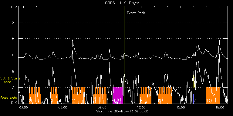 EIS Observation timeline overlay to GOES-Xray curve Code 1" 2" 40" 266" EIS Observations list for this event: STUDY ACRONYM ID DATE OBSERVED DESCRIPTION NOAA# TARGET 0 HH_Flare+AR_180x152H | 33482 | 2013/05/05 03:25:13 | Flare hunting. AR11731. | 1731 | Flare TIMELINE ID DATE OBSERVED FITS FILE XCEN (+W/-E) YCEN (+N/-S) DUR ----------------------------------------------------------------------------------------------------------------- 33482 | 2013/05/05 03:25:13.000 | eis_l0_20130505_032513.fits.gz | 795.03 | 188.70 | 5m19s 33482 | 2013/05/05 03:30:35.000 | eis_l0_20130505_033035.fits.gz | 795.50 | 188.70 | 5m18s 33482 | 2013/05/05 03:35:55.000 | eis_l0_20130505_033555.fits.gz | 795.88 | 188.63 | 5m19s 33482 | 2013/05/05 03:41:16.000 | eis_l0_20130505_034116.fits.gz | 796.35 | 188.47 | 5m19s 33482 | 2013/05/05 03:46:37.000 | eis_l0_20130505_034637.fits.gz | 796.73 | 188.32 | 5m18s 33482 | 2013/05/05 03:51:58.000 | eis_l0_20130505_035158.fits.gz | 797.12 | 188.39 | 5m19s 33482 | 2013/05/05 03:57:20.000 | eis_l0_20130505_035720.fits.gz | 797.58 | 188.16 | 5m17s 33482 | 2013/05/05 04:02:40.000 | eis_l0_20130505_040240.fits.gz | 797.97 | 188.24 | 5m17s 33482 | 2013/05/05 04:08:00.000 | eis_l0_20130505_040800.fits.gz | 798.43 | 188.32 | 5m18s 33482 | 2013/05/05 04:13:21.000 | eis_l0_20130505_041321.fits.gz | 798.82 | 188.24 | 5m18s 1 HH_Flare+AR_180x152H | 33483 | 2013/05/05 05:04:13 | Flare hunting. AR11731. | 1731 | Flare TIMELINE ID DATE OBSERVED FITS FILE XCEN (+W/-E) YCEN (+N/-S) DUR ----------------------------------------------------------------------------------------------------------------- 33483 | 2013/05/05 05:04:13.000 | eis_l0_20130505_050413.fits.gz | 802.84 | 187.62 | 5m18s 33483 | 2013/05/05 05:09:34.000 | eis_l0_20130505_050934.fits.gz | 803.22 | 187.62 | 5m18s 33483 | 2013/05/05 05:14:55.000 | eis_l0_20130505_051455.fits.gz | 803.68 | 187.62 | 5m17s 33483 | 2013/05/05 05:20:15.000 | eis_l0_20130505_052015.fits.gz | 804.07 | 187.54 | 5m18s 33483 | 2013/05/05 05:25:35.000 | eis_l0_20130505_052535.fits.gz | 804.53 | 187.47 | 5m19s 33483 | 2013/05/05 05:30:56.000 | eis_l0_20130505_053056.fits.gz | 804.84 | 187.31 | 5m18s 2 HH_Flare+AR_180x152H | 33484 | 2013/05/05 06:42:14 | Flare hunting. AR11731. | 1731 | Flare TIMELINE ID DATE OBSERVED FITS FILE XCEN (+W/-E) YCEN (+N/-S) DUR ----------------------------------------------------------------------------------------------------------------- 33484 | 2013/05/05 06:42:14.000 | eis_l0_20130505_064214.fits.gz | 810.25 | 186.85 | 5m18s 33484 | 2013/05/05 06:47:35.000 | eis_l0_20130505_064735.fits.gz | 810.64 | 186.77 | 5m18s 33484 | 2013/05/05 06:52:56.000 | eis_l0_20130505_065256.fits.gz | 811.10 | 186.77 | 5m19s 33484 | 2013/05/05 06:58:17.000 | eis_l0_20130505_065817.fits.gz | 811.56 | 186.70 | 5m18s 33484 | 2013/05/05 07:03:38.000 | eis_l0_20130505_070338.fits.gz | 811.95 | 186.54 | 5m18s 33484 | 2013/05/05 07:08:58.000 | eis_l0_20130505_070858.fits.gz | 812.34 | 186.54 | 5m18s 33484 | 2013/05/05 07:14:19.000 | eis_l0_20130505_071419.fits.gz | 812.72 | 186.39 | 5m18s 33484 | 2013/05/05 07:19:39.000 | eis_l0_20130505_071939.fits.gz | 813.11 | 186.39 | 5m18s 33484 | 2013/05/05 07:25:00.000 | eis_l0_20130505_072500.fits.gz | 813.49 | 186.39 | 5m18s 33484 | 2013/05/05 07:30:21.000 | eis_l0_20130505_073021.fits.gz | 813.88 | 186.23 | 5m17s 33484 | 2013/05/05 07:35:41.000 | eis_l0_20130505_073541.fits.gz | 814.34 | 186.23 | 5m17s 3 HH_Flare+AR_180x152H | 33485 | 2013/05/05 08:21:13 | Flare hunting. AR11731. | 1731 | Flare TIMELINE ID DATE OBSERVED FITS FILE XCEN (+W/-E) YCEN (+N/-S) DUR ----------------------------------------------------------------------------------------------------------------- 33485 | 2013/05/05 08:21:13.000 | eis_l0_20130505_082113.fits.gz | 817.59 | 185.69 | 5m18s 33485 | 2013/05/05 08:26:34.000 | eis_l0_20130505_082634.fits.gz | 817.98 | 185.92 | 5m18s 33485 | 2013/05/05 08:31:55.000 | eis_l0_20130505_083155.fits.gz | 818.59 | 185.69 | 5m17s 33485 | 2013/05/05 08:37:15.000 | eis_l0_20130505_083715.fits.gz | 818.90 | 185.61 | 5m17s 33485 | 2013/05/05 08:42:35.000 | eis_l0_20130505_084235.fits.gz | 819.21 | 185.54 | 5m18s 33485 | 2013/05/05 08:47:56.000 | eis_l0_20130505_084756.fits.gz | 819.60 | 185.54 | 5m18s 33485 | 2013/05/05 08:53:17.000 | eis_l0_20130505_085317.fits.gz | 819.98 | 185.54 | 5m19s 33485 | 2013/05/05 08:58:38.000 | eis_l0_20130505_085838.fits.gz | 820.45 | 185.38 | 5m18s 33485 | 2013/05/05 09:03:59.000 | eis_l0_20130505_090359.fits.gz | 820.83 | 185.54 | 5m18s 33485 | 2013/05/05 09:09:20.000 | eis_l0_20130505_090920.fits.gz | 821.14 | 185.30 | 5m18s 33485 | 2013/05/05 09:14:41.000 | eis_l0_20130505_091441.fits.gz | 821.61 | 185.30 | 5m18s 4 HPW021_VEL_120x512v2 | 33498 | 2013/05/05 09:48:56 | Active region studies. Scan. AR11731. | 1728 | Active Region TIMELINE ID DATE OBSERVED FITS FILE XCEN (+W/-E) YCEN (+N/-S) DUR ----------------------------------------------------------------------------------------------------------------- 33498 | 2013/05/05 09:48:56.000 | eis_l0_20130505_094856.fits.gz | 832.47 | 129.92 | 46m53s 5 HH_Flare+AR_180x152H | 33487 | 2013/05/05 11:52:26 | Flare hunting. AR11731. | 1731 | Flare TIMELINE ID DATE OBSERVED FITS FILE XCEN (+W/-E) YCEN (+N/-S) DUR ----------------------------------------------------------------------------------------------------------------- 33487 | 2013/05/05 11:52:26.000 | eis_l0_20130505_115226.fits.gz | 832.65 | 183.68 | 5m18s 33487 | 2013/05/05 11:57:47.000 | eis_l0_20130505_115747.fits.gz | 832.96 | 183.91 | 5m18s 33487 | 2013/05/05 12:03:08.000 | eis_l0_20130505_120308.fits.gz | 833.35 | 183.68 | 5m17s 33487 | 2013/05/05 12:08:28.000 | eis_l0_20130505_120828.fits.gz | 833.66 | 183.60 | 5m17s 33487 | 2013/05/05 12:13:48.000 | eis_l0_20130505_121348.fits.gz | 834.04 | 183.68 | 5m19s 33487 | 2013/05/05 12:19:09.000 | eis_l0_20130505_121909.fits.gz | 834.51 | 183.45 | 5m18s 33487 | 2013/05/05 12:24:30.000 | eis_l0_20130505_122430.fits.gz | 834.8