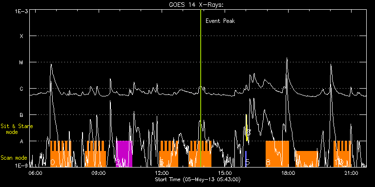 EIS Observation timeline overlay to GOES-Xray curve Code 1" 2" 40" 266" EIS Observations list for this event: STUDY ACRONYM ID DATE OBSERVED DESCRIPTION NOAA# TARGET 0 HH_Flare+AR_180x152H | 33484 | 2013/05/05 06:42:14 | Flare hunting. AR11731. | 1731 | Flare TIMELINE ID DATE OBSERVED FITS FILE XCEN (+W/-E) YCEN (+N/-S) DUR ----------------------------------------------------------------------------------------------------------------- 33484 | 2013/05/05 06:42:14.000 | eis_l0_20130505_064214.fits.gz | 810.25 | 186.85 | 5m18s 33484 | 2013/05/05 06:47:35.000 | eis_l0_20130505_064735.fits.gz | 810.64 | 186.77 | 5m18s 33484 | 2013/05/05 06:52:56.000 | eis_l0_20130505_065256.fits.gz | 811.10 | 186.77 | 5m19s 33484 | 2013/05/05 06:58:17.000 | eis_l0_20130505_065817.fits.gz | 811.56 | 186.70 | 5m18s 33484 | 2013/05/05 07:03:38.000 | eis_l0_20130505_070338.fits.gz | 811.95 | 186.54 | 5m18s 33484 | 2013/05/05 07:08:58.000 | eis_l0_20130505_070858.fits.gz | 812.34 | 186.54 | 5m18s 33484 | 2013/05/05 07:14:19.000 | eis_l0_20130505_071419.fits.gz | 812.72 | 186.39 | 5m18s 33484 | 2013/05/05 07:19:39.000 | eis_l0_20130505_071939.fits.gz | 813.11 | 186.39 | 5m18s 33484 | 2013/05/05 07:25:00.000 | eis_l0_20130505_072500.fits.gz | 813.49 | 186.39 | 5m18s 33484 | 2013/05/05 07:30:21.000 | eis_l0_20130505_073021.fits.gz | 813.88 | 186.23 | 5m17s 33484 | 2013/05/05 07:35:41.000 | eis_l0_20130505_073541.fits.gz | 814.34 | 186.23 | 5m17s 1 HH_Flare+AR_180x152H | 33485 | 2013/05/05 08:21:13 | Flare hunting. AR11731. | 1731 | Flare TIMELINE ID DATE OBSERVED FITS FILE XCEN (+W/-E) YCEN (+N/-S) DUR ----------------------------------------------------------------------------------------------------------------- 33485 | 2013/05/05 08:21:13.000 | eis_l0_20130505_082113.fits.gz | 817.59 | 185.69 | 5m18s 33485 | 2013/05/05 08:26:34.000 | eis_l0_20130505_082634.fits.gz | 817.98 | 185.92 | 5m18s 33485 | 2013/05/05 08:31:55.000 | eis_l0_20130505_083155.fits.gz | 818.59 | 185.69 | 5m17s 33485 | 2013/05/05 08:37:15.000 | eis_l0_20130505_083715.fits.gz | 818.90 | 185.61 | 5m17s 33485 | 2013/05/05 08:42:35.000 | eis_l0_20130505_084235.fits.gz | 819.21 | 185.54 | 5m18s 33485 | 2013/05/05 08:47:56.000 | eis_l0_20130505_084756.fits.gz | 819.60 | 185.54 | 5m18s 33485 | 2013/05/05 08:53:17.000 | eis_l0_20130505_085317.fits.gz | 819.98 | 185.54 | 5m19s 33485 | 2013/05/05 08:58:38.000 | eis_l0_20130505_085838.fits.gz | 820.45 | 185.38 | 5m18s 33485 | 2013/05/05 09:03:59.000 | eis_l0_20130505_090359.fits.gz | 820.83 | 185.54 | 5m18s 33485 | 2013/05/05 09:09:20.000 | eis_l0_20130505_090920.fits.gz | 821.14 | 185.30 | 5m18s 33485 | 2013/05/05 09:14:41.000 | eis_l0_20130505_091441.fits.gz | 821.61 | 185.30 | 5m18s 2 HPW021_VEL_120x512v2 | 33498 | 2013/05/05 09:48:56 | Active region studies. Scan. AR11731. | 1728 | Active Region TIMELINE ID DATE OBSERVED FITS FILE XCEN (+W/-E) YCEN (+N/-S) DUR ----------------------------------------------------------------------------------------------------------------- 33498 | 2013/05/05 09:48:56.000 | eis_l0_20130505_094856.fits.gz | 832.47 | 129.92 | 46m53s 3 HH_Flare+AR_180x152H | 33487 | 2013/05/05 11:52:26 | Flare hunting. AR11731. | 1731 | Flare TIMELINE ID DATE OBSERVED FITS FILE XCEN (+W/-E) YCEN (+N/-S) DUR ----------------------------------------------------------------------------------------------------------------- 33487 | 2013/05/05 11:52:26.000 | eis_l0_20130505_115226.fits.gz | 832.65 | 183.68 | 5m18s 33487 | 2013/05/05 11:57:47.000 | eis_l0_20130505_115747.fits.gz | 832.96 | 183.91 | 5m18s 33487 | 2013/05/05 12:03:08.000 | eis_l0_20130505_120308.fits.gz | 833.35 | 183.68 | 5m17s 33487 | 2013/05/05 12:08:28.000 | eis_l0_20130505_120828.fits.gz | 833.66 | 183.60 | 5m17s 33487 | 2013/05/05 12:13:48.000 | eis_l0_20130505_121348.fits.gz | 834.04 | 183.68 | 5m19s 33487 | 2013/05/05 12:19:09.000 | eis_l0_20130505_121909.fits.gz | 834.51 | 183.45 | 5m18s 33487 | 2013/05/05 12:24:30.000 | eis_l0_20130505_122430.fits.gz | 834.82 | 183.45 | 5m17s 33487 | 2013/05/05 12:29:50.000 | eis_l0_20130505_122950.fits.gz | 835.20 | 183.45 | 5m18s 33487 | 2013/05/05 12:35:11.000 | eis_l0_20130505_123511.fits.gz | 835.59 | 183.30 | 5m18s 33487 | 2013/05/05 12:40:31.000 | eis_l0_20130505_124031.fits.gz | 836.05 | 183.22 | 5m18s 4 HH_Flare+AR_180x152H | 33488 | 2013/05/05 13:16:14 | Flare hunting. AR11731. | 1731 | Flare TIMELINE ID DATE OBSERVED FITS FILE XCEN (+W/-E) YCEN (+N/-S) DUR ----------------------------------------------------------------------------------------------------------------- 33488 | 2013/05/05 13:16:14.000 | eis_l0_20130505_131614.fits.gz | 838.22 | 183.22 | 5m18s 33488 | 2013/05/05 13:21:35.000 | eis_l0_20130505_132135.fits.gz | 838.68 | 182.99 | 5m17s 33488 | 2013/05/05 13:26:55.000 | eis_l0_20130505_132655.fits.gz | 839.06 | 182.91 | 5m19s 33488 | 2013/05/05 13:32:16.000 | eis_l0_20130505_133216.fits.gz | 839.30 | 182.91 | 5m18s 33488 | 2013/05/05 13:37:37.000 | eis_l0_20130505_133737.fits.gz | 839.76 | 182.76 | 5m18s 33488 | 2013/05/05 13:42:58.000 | eis_l0_20130505_134258.fits.gz | 840.07 | 182.76 | 5m18s 33488 | 2013/05/05 13:48:19.000 | eis_l0_20130505_134819.fits.gz | 840.46 | 182.68 | 5m18s 33488 | 2013/05/05 13:53:40.000 | eis_l0_20130505_135340.fits.gz | 840.84 | 182.83 | 5m18s 33488 | 2013/05/05 13:59:01.000 | eis_l0_20130505_135901.fits.gz | 841.15 | 182.52 | 5m17s 33488 | 2013/05/05 14:04:21.000 | eis_l0_20130505_140421.fits.gz | 841.54 | 182.52 | 5m18s 33488 | 2013/05/05 14:09:42.000 | eis_l0_20130505_140942.fits.gz | 841.84 | 182.45 | 5m18s 33488 | 2013/05/05 14:15:03.000 | eis_l0_20130505_141503.fits.gz | 842.23 | 182.45 | 5m18s 5 PRY_slot_contextLITE | 33510 | 2013/05/05 15:57:19 | EIS-AIA coalignment | 1734 | Active Region TIMELINE ID DATE OBSERVED FITS FILE XCEN (+W/-E) YCEN (+N/-S) DUR ----------------------------------------------------------------------------------------------------------------- 33510 | 2013/05/05 15:57:19.000 | eis_l0_20130505_155719.fits.gz | -