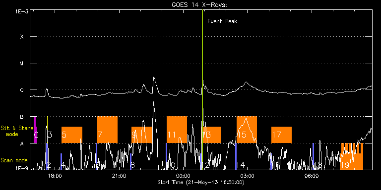 EIS Observation timeline overlay to GOES-Xray curve Code 1" 2" 40" 266" EIS Observations list for this event: STUDY ACRONYM ID DATE OBSERVED DESCRIPTION NOAA# TARGET 0 regcal071 | 33807 | 2013/05/21 17:01:23 | Dark exposures, CCD bottom rows (100s | | Engineering TIMELINE ID DATE OBSERVED FITS FILE XCEN (+W/-E) YCEN (+N/-S) DUR ----------------------------------------------------------------------------------------------------------------- 33807 | 2013/05/21 17:01:23.000 | eis_l0_20130521_170123.fits.gz | 400.83 | -128.99 | 3m22s 1 regcal072 | 33808 | 2013/05/21 17:05:12 | Dark exposures, top CCD rows (100s exp | | Engineering TIMELINE ID DATE OBSERVED FITS FILE XCEN (+W/-E) YCEN (+N/-S) DUR ----------------------------------------------------------------------------------------------------------------- 33808 | 2013/05/21 17:05:12.000 | eis_l0_20130521_170512.fits.gz | 401.37 | 382.09 | 3m22s 2 PRY_slot_contextLITE | 33799 | 2013/05/21 17:35:51 | EIS-AIA alignment | | Active Region TIMELINE ID DATE OBSERVED FITS FILE XCEN (+W/-E) YCEN (+N/-S) DUR ----------------------------------------------------------------------------------------------------------------- 33799 | 2013/05/21 17:35:51.000 | eis_l0_20130521_173551.fits.gz | -15.29 | -0.58 | 2m57s 3 XRT_synop_AIA | 33800 | 2013/05/21 17:39:06 | EIS-AIA alignment | | Quiet Sun TIMELINE ID DATE OBSERVED FITS FILE XCEN (+W/-E) YCEN (+N/-S) DUR ----------------------------------------------------------------------------------------------------------------- 33800 | 2013/05/21 17:39:06.000 | eis_l0_20130521_173906.fits.gz | -132.49 | -0.42 | 10s 4 PRY_slot_context_v3 | 33820 | 2013/05/21 18:16:11 | Flare Sit-And-Stare (Context) | 1748 | Active Region TIMELINE ID DATE OBSERVED FITS FILE XCEN (+W/-E) YCEN (+N/-S) DUR ----------------------------------------------------------------------------------------------------------------- 33820 | 2013/05/21 18:16:11.000 | eis_l0_20130521_181611.fits.gz | 381.38 | 175.70 | 2m56s 5 FLAREDOP_EIS | 33821 | 2013/05/21 18:19:32 | Flare Sit-And-Stare | | Flare TIMELINE ID DATE OBSERVED FITS FILE XCEN (+W/-E) YCEN (+N/-S) DUR ----------------------------------------------------------------------------------------------------------------- 33821 | 2013/05/21 18:19:32.000 | eis_l0_20130521_181932.fits.gz | 396.58 | 175.86 | 55m52s 6 PRY_slot_context_v3 | 33822 | 2013/05/21 19:55:34 | Flare Sit-And-Stare (Context) | 1748 | Active Region TIMELINE ID DATE OBSERVED FITS FILE XCEN (+W/-E) YCEN (+N/-S) DUR ----------------------------------------------------------------------------------------------------------------- 33822 | 2013/05/21 19:55:34.000 | eis_l0_20130521_195534.fits.gz | 394.89 | 175.47 | 2m56s 7 FLAREDOP_EIS | 33823 | 2013/05/21 19:58:56 | Flare Sit-And-Stare | | Flare TIMELINE ID DATE OBSERVED FITS FILE XCEN (+W/-E) YCEN (+N/-S) DUR ----------------------------------------------------------------------------------------------------------------- 33823 | 2013/05/21 19:58:56.000 | eis_l0_20130521_195856.fits.gz | 410.02 | 175.47 | 55m51s 8 PRY_slot_context_v3 | 33824 | 2013/05/21 21:31:26 | Flare Sit-And-Stare (Context) | 1748 | Active Region TIMELINE ID DATE OBSERVED FITS FILE XCEN (+W/-E) YCEN (+N/-S) DUR ----------------------------------------------------------------------------------------------------------------- 33824 | 2013/05/21 21:31:26.000 | eis_l0_20130521_213126.fits.gz | 407.87 | 175.24 | 2m56s 9 FLAREDOP_EIS | 33825 | 2013/05/21 21:34:47 | Flare Sit-And-Stare | | Flare TIMELINE ID DATE OBSERVED FITS FILE XCEN (+W/-E) YCEN (+N/-S) DUR ----------------------------------------------------------------------------------------------------------------- 33825 | 2013/05/21 21:34:47.000 | eis_l0_20130521_213447.fits.gz | 423.07 | 175.24 | 55m51s 10 PRY_slot_context_v3 | 33826 | 2013/05/21 23:10:56 | Flare Sit-And-Stare (Context) | 1748 | Active Region TIMELINE ID DATE OBSERVED FITS FILE XCEN (+W/-E) YCEN (+N/-S) DUR ----------------------------------------------------------------------------------------------------------------- 33826 | 2013/05/21 23:10:56.000 | eis_l0_20130521_231056.fits.gz | 421.31 | 174.93 | 2m57s 11 FLAREDOP_EIS | 33827 | 2013/05/21 23:14:18 | Flare Sit-And-Stare | | Flare TIMELINE ID DATE OBSERVED FITS FILE XCEN (+W/-E) YCEN (+N/-S) DUR ----------------------------------------------------------------------------------------------------------------- 33827 | 2013/05/21 23:14:18.000 | eis_l0_20130521_231418.fits.gz | 436.52 | 174.85 | 55m51s 12 PRY_slot_context_v3 | 33828 | 2013/05/22 00:46:48 | Flare Sit-And-Stare (Context) | 1748 | Active Region TIMELINE ID DATE OBSERVED FITS FILE XCEN (+W/-E) YCEN (+N/-S) DUR ----------------------------------------------------------------------------------------------------------------- 33828 | 2013/05/22 00:46:48.000 | eis_l0_20130522_004648.fits.gz | 433.98 | 174.62 | 2m56s 13 FLAREDOP_EIS | 33829 | 2013/05/22 00:50:10 | Flare Sit-And-Stare | | Flare TIMELINE ID DATE OBSERVED FITS FILE XCEN (+W/-E) YCEN (+N/-S) DUR ----------------------------------------------------------------------------------------------------------------- 33829 | 2013/05/22 00:50:10.000 | eis_l0_20130522_005010.fits.gz | 449.26 | 174.39 | 55m52s 14 PRY_slot_context_v3 | 33830 | 2013/05/22 02:26:18 | Flare Sit-And-Stare (Context) | 1748 | Active Region TIMELINE ID DATE OBSERVED FITS FILE XCEN (+W/-E) YCEN (+N/-S) DUR ----------------------------------------------------------------------------------------------------------------- 33830 | 2013/05/22 02:26:18.000 | eis_l0_20130522_022618.fits.gz | 447.19 | 174.16 | 2m56s 15 FLAREDOP_EIS | 33831 | 2013/05/22 02:29:40 | Flare Sit-And-Stare | 1748 | Flare TIMELINE ID DATE OBSERVED FITS FILE XCEN (+W/-E) YCEN (+N/-S) DUR ----------------------------------------------------------------------------------------------------------------- 33831 | 2013/05/22 02:29:40.000 | eis_l0_20130522_022940.fits.gz | 462.39 | 174.08 | 55m51s 16 PRY_slot