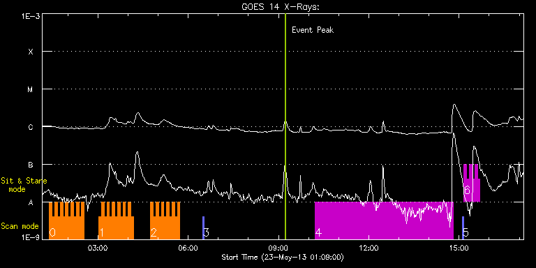 EIS Observation timeline overlay to GOES-Xray curve Code 1" 2" 40" 266" EIS Observations list for this event: STUDY ACRONYM ID DATE OBSERVED DESCRIPTION NOAA# TARGET 0 HH_Flare+AR_180x152 | 33841 | 2013/05/23 01:23:27 | Flare Observations of AR | 1748 | Flare TIMELINE ID DATE OBSERVED FITS FILE XCEN (+W/-E) YCEN (+N/-S) DUR ----------------------------------------------------------------------------------------------------------------- 33841 | 2013/05/23 01:23:27.000 | eis_l0_20130523_012327.fits.gz | 628.43 | 168.60 | 5m18s 33841 | 2013/05/23 01:28:48.000 | eis_l0_20130523_012848.fits.gz | 629.12 | 168.44 | 5m17s 33841 | 2013/05/23 01:34:08.000 | eis_l0_20130523_013408.fits.gz | 629.66 | 168.67 | 5m17s 33841 | 2013/05/23 01:39:28.000 | eis_l0_20130523_013928.fits.gz | 630.36 | 168.44 | 5m17s 33841 | 2013/05/23 01:44:48.000 | eis_l0_20130523_014448.fits.gz | 630.90 | 168.52 | 5m17s 33841 | 2013/05/23 01:50:08.000 | eis_l0_20130523_015008.fits.gz | 631.52 | 168.29 | 4m14s 33841 | 2013/05/23 01:55:29.000 | eis_l0_20130523_015529.fits.gz | 632.06 | 168.36 | 5m17s 33841 | 2013/05/23 02:00:49.000 | eis_l0_20130523_020049.fits.gz | 632.76 | 168.36 | 5m17s 33841 | 2013/05/23 02:06:09.000 | eis_l0_20130523_020609.fits.gz | 633.29 | 168.21 | 5m18s 33841 | 2013/05/23 02:11:30.000 | eis_l0_20130523_021130.fits.gz | 633.84 | 168.21 | 5m19s 33841 | 2013/05/23 02:16:51.000 | eis_l0_20130523_021651.fits.gz | 634.53 | 168.21 | 5m18s 33841 | 2013/05/23 02:22:12.000 | eis_l0_20130523_022212.fits.gz | 635.07 | 168.29 | 5m18s 33841 | 2013/05/23 02:27:33.000 | eis_l0_20130523_022733.fits.gz | 635.61 | 168.21 | 5m18s 1 HH_Flare+AR_180x152 | 33842 | 2013/05/23 03:01:44 | Flare Observations of AR | 1748 | Flare TIMELINE ID DATE OBSERVED FITS FILE XCEN (+W/-E) YCEN (+N/-S) DUR ----------------------------------------------------------------------------------------------------------------- 33842 | 2013/05/23 03:01:44.000 | eis_l0_20130523_030144.fits.gz | 639.40 | 168.13 | 5m18s 33842 | 2013/05/23 03:07:04.000 | eis_l0_20130523_030704.fits.gz | 640.02 | 168.21 | 5m18s 33842 | 2013/05/23 03:12:25.000 | eis_l0_20130523_031225.fits.gz | 640.56 | 168.13 | 5m18s 33842 | 2013/05/23 03:17:46.000 | eis_l0_20130523_031746.fits.gz | 641.25 | 167.98 | 5m17s 33842 | 2013/05/23 03:23:06.000 | eis_l0_20130523_032306.fits.gz | 641.79 | 168.05 | 5m18s 33842 | 2013/05/23 03:28:27.000 | eis_l0_20130523_032827.fits.gz | 642.41 | 167.82 | 5m17s 33842 | 2013/05/23 03:33:47.000 | eis_l0_20130523_033347.fits.gz | 643.03 | 167.90 | 5m18s 33842 | 2013/05/23 03:39:08.000 | eis_l0_20130523_033908.fits.gz | 643.49 | 167.98 | 5m17s 33842 | 2013/05/23 03:44:28.000 | eis_l0_20130523_034428.fits.gz | 644.19 | 167.98 | 5m18s 33842 | 2013/05/23 03:49:49.000 | eis_l0_20130523_034949.fits.gz | 644.65 | 167.90 | 5m18s 33842 | 2013/05/23 03:55:10.000 | eis_l0_20130523_035510.fits.gz | 645.27 | 167.82 | 5m19s 33842 | 2013/05/23 04:00:31.000 | eis_l0_20130523_040031.fits.gz | 645.89 | 167.90 | 5m18s 33842 | 2013/05/23 04:05:52.000 | eis_l0_20130523_040552.fits.gz | 646.43 | 167.82 | 5m18s 2 HH_Flare+AR_180x152 | 33843 | 2013/05/23 04:44:53 | Flare Observations of AR | 1748 | Flare TIMELINE ID DATE OBSERVED FITS FILE XCEN (+W/-E) YCEN (+N/-S) DUR ----------------------------------------------------------------------------------------------------------------- 33843 | 2013/05/23 04:44:53.000 | eis_l0_20130523_044453.fits.gz | 650.68 | 167.82 | 5m17s 33843 | 2013/05/23 04:50:13.000 | eis_l0_20130523_045013.fits.gz | 651.22 | 167.67 | 5m18s 33843 | 2013/05/23 04:55:34.000 | eis_l0_20130523_045534.fits.gz | 651.91 | 167.67 | 5m17s 33843 | 2013/05/23 05:00:54.000 | eis_l0_20130523_050054.fits.gz | 652.45 | 167.59 | 5m17s 33843 | 2013/05/23 05:06:14.000 | eis_l0_20130523_050614.fits.gz | 653.07 | 167.44 | 5m18s 33843 | 2013/05/23 05:11:35.000 | eis_l0_20130523_051135.fits.gz | 653.61 | 167.51 | 5m19s 33843 | 2013/05/23 05:16:56.000 | eis_l0_20130523_051656.fits.gz | 654.23 | 167.36 | 5m18s 33843 | 2013/05/23 05:22:17.000 | eis_l0_20130523_052217.fits.gz | 654.77 | 167.44 | 5m17s 33843 | 2013/05/23 05:27:37.000 | eis_l0_20130523_052737.fits.gz | 655.31 | 167.51 | 5m18s 33843 | 2013/05/23 05:32:58.000 | eis_l0_20130523_053258.fits.gz | 655.93 | 167.36 | 5m18s 33843 | 2013/05/23 05:38:19.000 | eis_l0_20130523_053819.fits.gz | 656.47 | 167.44 | 5m18s 3 PRY_slot_contextLITE | 33811 | 2013/05/23 06:29:20 | EIS-AIA alignment | | Active Region TIMELINE ID DATE OBSERVED FITS FILE XCEN (+W/-E) YCEN (+N/-S) DUR ----------------------------------------------------------------------------------------------------------------- 33811 | 2013/05/23 06:29:20.000 | eis_l0_20130523_062920.fits.gz | -15.29 | -0.50 | 2m56s 4 SK_CH_DIAG_320x384 | 33870 | 2013/05/23 10:13:20 | HOP 081 | | Coronal Hole TIMELINE ID DATE OBSERVED FITS FILE XCEN (+W/-E) YCEN (+N/-S) DUR ----------------------------------------------------------------------------------------------------------------- 33870 | 2013/05/23 10:13:20.000 | eis_l0_20130523_101320.fits.gz | -11.79 | -950.65 | 4h35m38s 5 PRY_slot_contextLITE | 33896 | 2013/05/23 15:06:34 | Limb Full CCD | | Active Region TIMELINE ID DATE OBSERVED FITS FILE XCEN (+W/-E) YCEN (+N/-S) DUR ----------------------------------------------------------------------------------------------------------------- 33896 | 2013/05/23 15:06:34.000 | eis_l0_20130523_150634.fits.gz | -27.19 | -950.34 | 2m56s 6 HPW023_FULLCCD_300s | 33897 | 2013/05/23 15:09:42 | Limb Full CCD | | Quiet Sun TIMELINE ID DATE OBSERVED FITS FILE XCEN (+W/-E) YCEN (+N/-S) DUR ----------------------------------------------------------------------------------------------------------------- 33897 | 2013/05/23 15:09:42.000 | eis_l0_20130523_150942.fits.gz | 0.02 | -1000.41 | 5m 33897 | 2013/05/23 15:15:09.000 | eis_l0_20130523_151509.fits.gz | 0.10 | -1000.41 | 5m 33897 | 2013/05/23 15:20:36.000 | eis_l0_20130523_152036.fits.gz | 0.10 | -1000.41 | 5m1s 33897 | 2013/05/23 15:26:04.000 | eis_l0_201