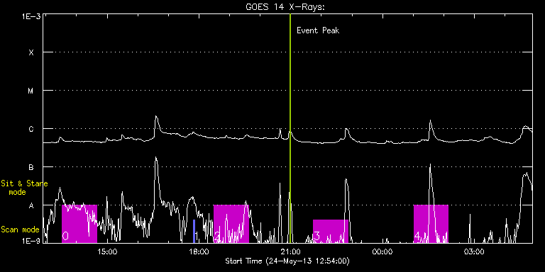 EIS Observation timeline overlay to GOES-Xray curve Code 1" 2" 40" 266" EIS Observations list for this event: STUDY ACRONYM ID DATE OBSERVED DESCRIPTION NOAA# TARGET 0 HPW022_VEL_480x512v1 | 33888 | 2013/05/24 13:31:48 | Fast AR Raster | 1754 | Active Region TIMELINE ID DATE OBSERVED FITS FILE XCEN (+W/-E) YCEN (+N/-S) DUR ----------------------------------------------------------------------------------------------------------------- 33888 | 2013/05/24 13:31:48.000 | eis_l0_20130524_133148.fits.gz | -344.74 | -327.26 | 1h7m39s 1 PRY_slot_contextLITE | 33884 | 2013/05/24 17:48:57 | EIS-AIA Align | 1753 | Active Region TIMELINE ID DATE OBSERVED FITS FILE XCEN (+W/-E) YCEN (+N/-S) DUR ----------------------------------------------------------------------------------------------------------------- 33884 | 2013/05/24 17:48:57.000 | eis_l0_20130524_174857.fits.gz | -15.21 | -0.35 | 2m56s 2 HPW022_VEL_480x512v1 | 33889 | 2013/05/24 18:29:47 | Fast AR Raster | 1754 | Active Region TIMELINE ID DATE OBSERVED FITS FILE XCEN (+W/-E) YCEN (+N/-S) DUR ----------------------------------------------------------------------------------------------------------------- 33889 | 2013/05/24 18:29:47.000 | eis_l0_20130524_182947.fits.gz | -306.20 | -327.33 | 1h7m38s 3 HPW022_VEL_480x512v1 | 33890 | 2013/05/24 21:44:35 | Fast AR Raster | 1754 | Active Region TIMELINE ID DATE OBSERVED FITS FILE XCEN (+W/-E) YCEN (+N/-S) DUR ----------------------------------------------------------------------------------------------------------------- 33890 | 2013/05/24 21:44:35.000 | eis_l0_20130524_214435.fits.gz | -280.55 | -327.26 | 1h7m40s 4 HPW022_VEL_480x512v1 | 33891 | 2013/05/25 01:01:00 | Fast AR Raster | 1756 | Active Region TIMELINE ID DATE OBSERVED FITS FILE XCEN (+W/-E) YCEN (+N/-S) DUR ----------------------------------------------------------------------------------------------------------------- 33891 | 2013/05/25 01:01:00.000 | eis_l0_20130525_010100.fits.gz | -254.44 | -327.26 | 1h7m40s : Check study information : Download file : View thumbnails For this event, also check for: