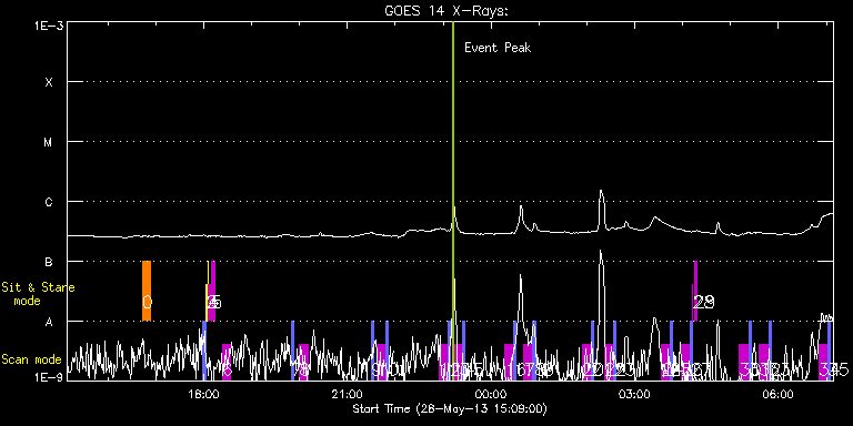 EIS Observation timeline overlay to GOES-Xray curve Code 1" 2" 40" 266" EIS Observations list for this event: STUDY ACRONYM ID DATE OBSERVED DESCRIPTION NOAA# TARGET 0 EL_WHI_CH_limb | 33995 | 2013/05/28 16:43:17 | HOP 201 | | Coronal Hole TIMELINE ID DATE OBSERVED FITS FILE XCEN (+W/-E) YCEN (+N/-S) DUR ----------------------------------------------------------------------------------------------------------------- 33995 | 2013/05/28 16:43:17.000 | eis_l0_20130528_164317.fits.gz | -1110.46 | 299.73 | 10m 1 PRY_slot_contextLITE | 33926 | 2013/05/28 17:59:20 | Measurements during XRT Synoptic | 1755 | Active Region TIMELINE ID DATE OBSERVED FITS FILE XCEN (+W/-E) YCEN (+N/-S) DUR ----------------------------------------------------------------------------------------------------------------- 33926 | 2013/05/28 17:59:20.000 | eis_l0_20130528_175920.fits.gz | -15.06 | -0.58 | 2m56s 2 Alignment_266 | 33927 | 2013/05/28 18:02:58 | Measurements during XRT Synoptic | | Quiet Sun TIMELINE ID DATE OBSERVED FITS FILE XCEN (+W/-E) YCEN (+N/-S) DUR ----------------------------------------------------------------------------------------------------------------- 33927 | 2013/05/28 18:02:58.000 | eis_l0_20130528_180258.fits.gz | -132.49 | -0.50 | 1m22s 3 XRT_synop_AIA | 33928 | 2013/05/28 18:05:19 | Measurements during XRT Synoptic | | Quiet Sun TIMELINE ID DATE OBSERVED FITS FILE XCEN (+W/-E) YCEN (+N/-S) DUR ----------------------------------------------------------------------------------------------------------------- 33928 | 2013/05/28 18:05:19.000 | eis_l0_20130528_180519.fits.gz | -132.49 | -0.35 | 10s 4 regcal071 | 33969 | 2013/05/28 18:05:54 | Dark exposures, CCD bottom rows (100s | | Engineering TIMELINE ID DATE OBSERVED FITS FILE XCEN (+W/-E) YCEN (+N/-S) DUR ----------------------------------------------------------------------------------------------------------------- 33969 | 2013/05/28 18:05:54.000 | eis_l0_20130528_180554.fits.gz | 14.59 | -305.50 | 3m21s 5 regcal072 | 33970 | 2013/05/28 18:10:16 | Dark exposures, top CCD rows (100s exp | | Engineering TIMELINE ID DATE OBSERVED FITS FILE XCEN (+W/-E) YCEN (+N/-S) DUR ----------------------------------------------------------------------------------------------------------------- 33970 | 2013/05/28 18:10:16.000 | eis_l0_20130528_181016.fits.gz | 14.51 | 205.50 | 3m22s 6 SK_DEEP_5x512_SLIT1 | 33929 | 2013/05/28 18:23:34 | HOP 79 | | Quiet Sun TIMELINE ID DATE OBSERVED FITS FILE XCEN (+W/-E) YCEN (+N/-S) DUR ----------------------------------------------------------------------------------------------------------------- 33929 | 2013/05/28 18:23:34.000 | eis_l0_20130528_182334.fits.gz | -11.96 | -945.55 | 10m7s 7 PRY_slot_contextLITE | 33932 | 2013/05/28 19:49:38 | HOP 79 | | Active Region TIMELINE ID DATE OBSERVED FITS FILE XCEN (+W/-E) YCEN (+N/-S) DUR ----------------------------------------------------------------------------------------------------------------- 33932 | 2013/05/28 19:49:38.000 | eis_l0_20130528_194938.fits.gz | -27.19 | -875.56 | 2m56s 8 SK_DEEP_5x512_SLIT1 | 33933 | 2013/05/28 20:00:20 | HOP 79 | | Quiet Sun TIMELINE ID DATE OBSERVED FITS FILE XCEN (+W/-E) YCEN (+N/-S) DUR ----------------------------------------------------------------------------------------------------------------- 33933 | 2013/05/28 20:00:20.000 | eis_l0_20130528_200020.fits.gz | -11.88 | -775.45 | 10m8s 9 PRY_slot_contextLITE | 33936 | 2013/05/28 21:29:34 | HOP 79 | | Active Region TIMELINE ID DATE OBSERVED FITS FILE XCEN (+W/-E) YCEN (+N/-S) DUR ----------------------------------------------------------------------------------------------------------------- 33936 | 2013/05/28 21:29:34.000 | eis_l0_20130528_212934.fits.gz | -27.11 | -675.49 | 2m56s 10 SK_DEEP_5x512_SLIT1 | 33937 | 2013/05/28 21:37:20 | HOP 79 | | Quiet Sun TIMELINE ID DATE OBSERVED FITS FILE XCEN (+W/-E) YCEN (+N/-S) DUR ----------------------------------------------------------------------------------------------------------------- 33937 | 2013/05/28 21:37:20.000 | eis_l0_20130528_213720.fits.gz | -11.88 | -575.30 | 10m7s 11 PRY_slot_contextLITE | 33938 | 2013/05/28 21:48:38 | HOP 79 | | Active Region TIMELINE ID DATE OBSERVED FITS FILE XCEN (+W/-E) YCEN (+N/-S) DUR ----------------------------------------------------------------------------------------------------------------- 33938 | 2013/05/28 21:48:38.000 | eis_l0_20130528_214838.fits.gz | -27.11 | -575.38 | 2m56s 12 SK_DEEP_5x512_SLIT1 | 33939 | 2013/05/28 22:54:50 | HOP 79 | | Quiet Sun TIMELINE ID DATE OBSERVED FITS FILE XCEN (+W/-E) YCEN (+N/-S) DUR ----------------------------------------------------------------------------------------------------------------- 33939 | 2013/05/28 22:54:50.000 | eis_l0_20130528_225450.fits.gz | -11.88 | -475.26 | 10m7s 13 PRY_slot_contextLITE | 33940 | 2013/05/28 23:06:08 | HOP 79 | | Active Region TIMELINE ID DATE OBSERVED FITS FILE XCEN (+W/-E) YCEN (+N/-S) DUR ----------------------------------------------------------------------------------------------------------------- 33940 | 2013/05/28 23:06:08.000 | eis_l0_20130528_230608.fits.gz | -27.11 | -475.34 | 2m56s 14 SK_DEEP_5x512_SLIT1 | 33941 | 2013/05/28 23:12:20 | HOP 79 | | Quiet Sun TIMELINE ID DATE OBSERVED FITS FILE XCEN (+W/-E) YCEN (+N/-S) DUR ----------------------------------------------------------------------------------------------------------------- 33941 | 2013/05/28 23:12:20.000 | eis_l0_20130528_231220.fits.gz | -11.88 | -375.46 | 10m7s 15 PRY_slot_contextLITE | 33942 | 2013/05/28 23:23:38 | HOP 79 | | Active Region TIMELINE ID DATE OBSERVED FITS FILE XCEN (+W/-E) YCEN (+N/-S) DUR ----------------------------------------------------------------------------------------------------------------- 33942 | 2013/05/28 23:23:38.000 | eis_l0_20130528_232338.fits.gz | -27.19 | -375.54 | 2m56s 16 SK_DEEP_5x512_SLIT1 | 33943 | 2013/05/29 00:17:20 | HOP 79 | | Quiet Sun TIMELINE ID DATE OBSERVED FITS FILE XCEN (+W/-E) YCEN (+N/-S) D