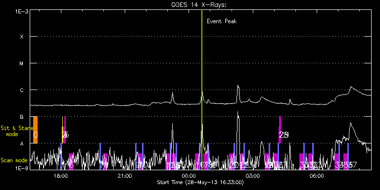 EIS Observation timeline overlay to GOES-Xray curve Code 1" 2" 40" 266" EIS Observations list for this event: STUDY ACRONYM ID DATE OBSERVED DESCRIPTION NOAA# TARGET 0 EL_WHI_CH_limb | 33995 | 2013/05/28 16:43:17 | HOP 201 | | Coronal Hole TIMELINE ID DATE OBSERVED FITS FILE XCEN (+W/-E) YCEN (+N/-S) DUR ----------------------------------------------------------------------------------------------------------------- 33995 | 2013/05/28 16:43:17.000 | eis_l0_20130528_164317.fits.gz | -1110.46 | 299.73 | 10m 1 PRY_slot_contextLITE | 33926 | 2013/05/28 17:59:20 | Measurements during XRT Synoptic | 1755 | Active Region TIMELINE ID DATE OBSERVED FITS FILE XCEN (+W/-E) YCEN (+N/-S) DUR ----------------------------------------------------------------------------------------------------------------- 33926 | 2013/05/28 17:59:20.000 | eis_l0_20130528_175920.fits.gz | -15.06 | -0.58 | 2m56s 2 Alignment_266 | 33927 | 2013/05/28 18:02:58 | Measurements during XRT Synoptic | | Quiet Sun TIMELINE ID DATE OBSERVED FITS FILE XCEN (+W/-E) YCEN (+N/-S) DUR ----------------------------------------------------------------------------------------------------------------- 33927 | 2013/05/28 18:02:58.000 | eis_l0_20130528_180258.fits.gz | -132.49 | -0.50 | 1m22s 3 XRT_synop_AIA | 33928 | 2013/05/28 18:05:19 | Measurements during XRT Synoptic | | Quiet Sun TIMELINE ID DATE OBSERVED FITS FILE XCEN (+W/-E) YCEN (+N/-S) DUR ----------------------------------------------------------------------------------------------------------------- 33928 | 2013/05/28 18:05:19.000 | eis_l0_20130528_180519.fits.gz | -132.49 | -0.35 | 10s 4 regcal071 | 33969 | 2013/05/28 18:05:54 | Dark exposures, CCD bottom rows (100s | | Engineering TIMELINE ID DATE OBSERVED FITS FILE XCEN (+W/-E) YCEN (+N/-S) DUR ----------------------------------------------------------------------------------------------------------------- 33969 | 2013/05/28 18:05:54.000 | eis_l0_20130528_180554.fits.gz | 14.59 | -305.50 | 3m21s 5 regcal072 | 33970 | 2013/05/28 18:10:16 | Dark exposures, top CCD rows (100s exp | | Engineering TIMELINE ID DATE OBSERVED FITS FILE XCEN (+W/-E) YCEN (+N/-S) DUR ----------------------------------------------------------------------------------------------------------------- 33970 | 2013/05/28 18:10:16.000 | eis_l0_20130528_181016.fits.gz | 14.51 | 205.50 | 3m22s 6 SK_DEEP_5x512_SLIT1 | 33929 | 2013/05/28 18:23:34 | HOP 79 | | Quiet Sun TIMELINE ID DATE OBSERVED FITS FILE XCEN (+W/-E) YCEN (+N/-S) DUR ----------------------------------------------------------------------------------------------------------------- 33929 | 2013/05/28 18:23:34.000 | eis_l0_20130528_182334.fits.gz | -11.96 | -945.55 | 10m7s 7 PRY_slot_contextLITE | 33932 | 2013/05/28 19:49:38 | HOP 79 | | Active Region TIMELINE ID DATE OBSERVED FITS FILE XCEN (+W/-E) YCEN (+N/-S) DUR ----------------------------------------------------------------------------------------------------------------- 33932 | 2013/05/28 19:49:38.000 | eis_l0_20130528_194938.fits.gz | -27.19 | -875.56 | 2m56s 8 SK_DEEP_5x512_SLIT1 | 33933 | 2013/05/28 20:00:20 | HOP 79 | | Quiet Sun TIMELINE ID DATE OBSERVED FITS FILE XCEN (+W/-E) YCEN (+N/-S) DUR ----------------------------------------------------------------------------------------------------------------- 33933 | 2013/05/28 20:00:20.000 | eis_l0_20130528_200020.fits.gz | -11.88 | -775.45 | 10m8s 9 PRY_slot_contextLITE | 33936 | 2013/05/28 21:29:34 | HOP 79 | | Active Region TIMELINE ID DATE OBSERVED FITS FILE XCEN (+W/-E) YCEN (+N/-S) DUR ----------------------------------------------------------------------------------------------------------------- 33936 | 2013/05/28 21:29:34.000 | eis_l0_20130528_212934.fits.gz | -27.11 | -675.49 | 2m56s 10 SK_DEEP_5x512_SLIT1 | 33937 | 2013/05/28 21:37:20 | HOP 79 | | Quiet Sun TIMELINE ID DATE OBSERVED FITS FILE XCEN (+W/-E) YCEN (+N/-S) DUR ----------------------------------------------------------------------------------------------------------------- 33937 | 2013/05/28 21:37:20.000 | eis_l0_20130528_213720.fits.gz | -11.88 | -575.30 | 10m7s 11 PRY_slot_contextLITE | 33938 | 2013/05/28 21:48:38 | HOP 79 | | Active Region TIMELINE ID DATE OBSERVED FITS FILE XCEN (+W/-E) YCEN (+N/-S) DUR ----------------------------------------------------------------------------------------------------------------- 33938 | 2013/05/28 21:48:38.000 | eis_l0_20130528_214838.fits.gz | -27.11 | -575.38 | 2m56s 12 SK_DEEP_5x512_SLIT1 | 33939 | 2013/05/28 22:54:50 | HOP 79 | | Quiet Sun TIMELINE ID DATE OBSERVED FITS FILE XCEN (+W/-E) YCEN (+N/-S) DUR ----------------------------------------------------------------------------------------------------------------- 33939 | 2013/05/28 22:54:50.000 | eis_l0_20130528_225450.fits.gz | -11.88 | -475.26 | 10m7s 13 PRY_slot_contextLITE | 33940 | 2013/05/28 23:06:08 | HOP 79 | | Active Region TIMELINE ID DATE OBSERVED FITS FILE XCEN (+W/-E) YCEN (+N/-S) DUR ----------------------------------------------------------------------------------------------------------------- 33940 | 2013/05/28 23:06:08.000 | eis_l0_20130528_230608.fits.gz | -27.11 | -475.34 | 2m56s 14 SK_DEEP_5x512_SLIT1 | 33941 | 2013/05/28 23:12:20 | HOP 79 | | Quiet Sun TIMELINE ID DATE OBSERVED FITS FILE XCEN (+W/-E) YCEN (+N/-S) DUR ----------------------------------------------------------------------------------------------------------------- 33941 | 2013/05/28 23:12:20.000 | eis_l0_20130528_231220.fits.gz | -11.88 | -375.46 | 10m7s 15 PRY_slot_contextLITE | 33942 | 2013/05/28 23:23:38 | HOP 79 | | Active Region TIMELINE ID DATE OBSERVED FITS FILE XCEN (+W/-E) YCEN (+N/-S) DUR ----------------------------------------------------------------------------------------------------------------- 33942 | 2013/05/28 23:23:38.000 | eis_l0_20130528_232338.fits.gz | -27.19 | -375.54 | 2m56s 16 SK_DEEP_5x512_SLIT1 | 33943 | 2013/05/29 00:17:20 | HOP 79 | | Quiet Sun TIMELINE ID DATE OBSERVED FITS FILE XCEN (+W/-E) YCEN (+N/-S) D