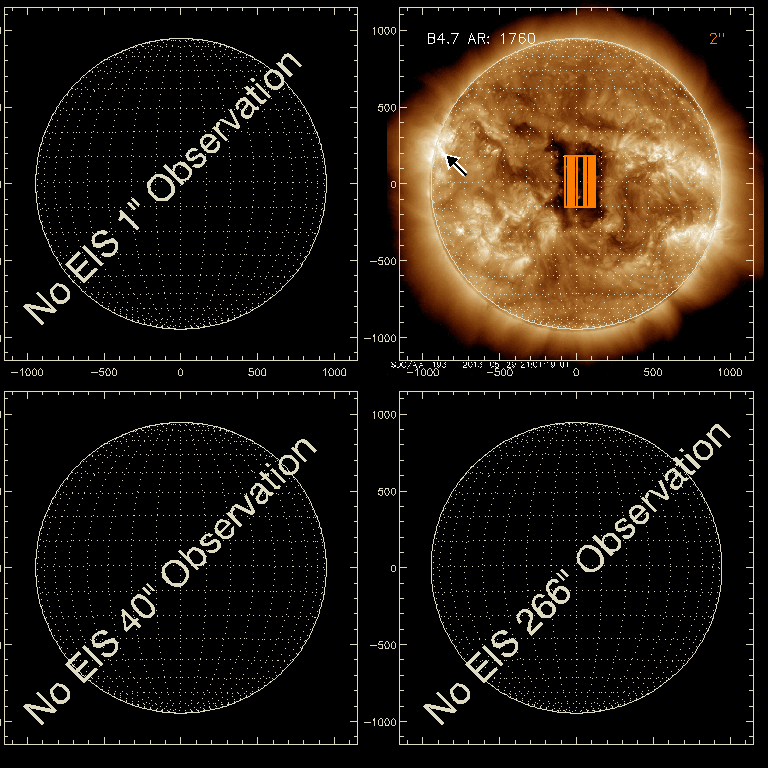 EIS Observation timeline overlay to GOES-Xray curve Code 1" 2" 40" 266" EIS Observations list for this event: STUDY ACRONYM ID DATE OBSERVED DESCRIPTION NOAA# TARGET 0 ISSI_jet_1 | 33973 | 2013/05/29 18:36:43 | Equatorial coronal hole | | Quiet Sun TIMELINE ID DATE OBSERVED FITS FILE XCEN (+W/-E) YCEN (+N/-S) DUR ----------------------------------------------------------------------------------------------------------------- 33973 | 2013/05/29 18:36:43.000 | eis_l0_20130529_183643.fits.gz | -8.99 | 11.94 | 58m37s 1 ISSI_jet_1 | 33974 | 2013/05/29 20:13:43 | Equatorial coronal hole | | Quiet Sun TIMELINE ID DATE OBSERVED FITS FILE XCEN (+W/-E) YCEN (+N/-S) DUR ----------------------------------------------------------------------------------------------------------------- 33974 | 2013/05/29 20:13:43.000 | eis_l0_20130529_201343.fits.gz | 6.00 | 11.78 | 58m37s 2 ISSI_jet_1 | 33975 | 2013/05/29 21:50:43 | Equatorial coronal hole | | Quiet Sun TIMELINE ID DATE OBSERVED FITS FILE XCEN (+W/-E) YCEN (+N/-S) DUR ----------------------------------------------------------------------------------------------------------------- 33975 | 2013/05/29 21:50:43.000 | eis_l0_20130529_215043.fits.gz | 20.91 | 11.47 | 58m36s 3 ISSI_jet_1 | 33976 | 2013/05/29 23:23:13 | Equatorial coronal hole | | Quiet Sun TIMELINE ID DATE OBSERVED FITS FILE XCEN (+W/-E) YCEN (+N/-S) DUR ----------------------------------------------------------------------------------------------------------------- 33976 | 2013/05/29 23:23:13.000 | eis_l0_20130529_232313.fits.gz | 35.20 | 11.40 | 58m36s 4 ISSI_jet_1 | 33977 | 2013/05/30 00:56:13 | Equatorial coronal hole | 1757 | Quiet Sun TIMELINE ID DATE OBSERVED FITS FILE XCEN (+W/-E) YCEN (+N/-S) DUR ----------------------------------------------------------------------------------------------------------------- 33977 | 2013/05/30 00:56:13.000 | eis_l0_20130530_005613.fits.gz | 49.41 | 11.32 | 58m36s 5 ISSI_jet_1 | 33978 | 2013/05/30 02:34:14 | Equatorial coronal hole | 1757 | Quiet Sun TIMELINE ID DATE OBSERVED FITS FILE XCEN (+W/-E) YCEN (+N/-S) DUR ----------------------------------------------------------------------------------------------------------------- 33978 | 2013/05/30 02:34:14.000 | eis_l0_20130530_023414.fits.gz | 64.47 | 11.24 | 58m36s : Check study information : Download file : View thumbnails For this event, also check for: