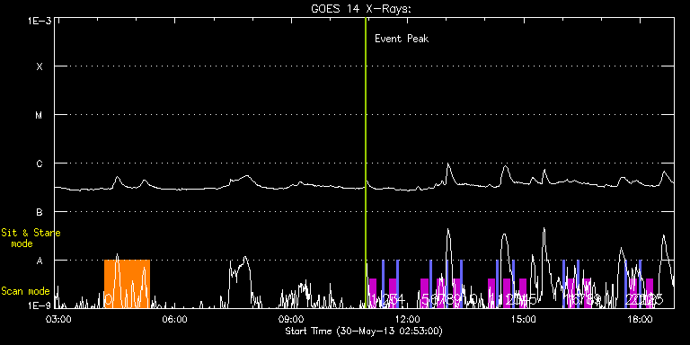 EIS Observation timeline overlay to GOES-Xray curve Code 1" 2" 40" 266" EIS Observations list for this event: STUDY ACRONYM ID DATE OBSERVED DESCRIPTION NOAA# TARGET 0 GDZ_300x384_S2S3_40 | 34007 | 2013/05/30 04:10:13 | Equatorial coronal hole | 1757 | Active Region TIMELINE ID DATE OBSERVED FITS FILE XCEN (+W/-E) YCEN (+N/-S) DUR ----------------------------------------------------------------------------------------------------------------- 34007 | 2013/05/30 04:10:13.000 | eis_l0_20130530_041013.fits.gz | 79.07 | 11.09 | 1h10m7s 1 SK_DEEP_5x512_SLIT1 | 34008 | 2013/05/30 11:01:26 | HOP 79 | | Quiet Sun TIMELINE ID DATE OBSERVED FITS FILE XCEN (+W/-E) YCEN (+N/-S) DUR ----------------------------------------------------------------------------------------------------------------- 34008 | 2013/05/30 11:01:26.000 | eis_l0_20130530_110126.fits.gz | -9869.46 | -9963.20 | 10m8s 2 PRY_slot_contextLITE | 34009 | 2013/05/30 11:20:33 | HOP 79 | 1760 | Active Region TIMELINE ID DATE OBSERVED FITS FILE XCEN (+W/-E) YCEN (+N/-S) DUR ----------------------------------------------------------------------------------------------------------------- 34009 | 2013/05/30 11:20:33.000 | eis_l0_20130530_112033.fits.gz | -704.01 | -42.52 | 2m56s 3 SK_DEEP_5x512_SLIT1 | 34021 | 2013/05/30 11:32:19 | HOP 79 | | Quiet Sun TIMELINE ID DATE OBSERVED FITS FILE XCEN (+W/-E) YCEN (+N/-S) DUR ----------------------------------------------------------------------------------------------------------------- 34021 | 2013/05/30 11:32:19.000 | eis_l0_20130530_113219.fits.gz | -489.97 | -42.45 | 10m8s 4 PRY_slot_contextLITE | 34022 | 2013/05/30 11:43:37 | HOP 79 | 1761 | Active Region TIMELINE ID DATE OBSERVED FITS FILE XCEN (+W/-E) YCEN (+N/-S) DUR ----------------------------------------------------------------------------------------------------------------- 34022 | 2013/05/30 11:43:37.000 | eis_l0_20130530_114337.fits.gz | -505.19 | -42.52 | 2m56s 5 SK_DEEP_5x512_SLIT1 | 34023 | 2013/05/30 12:21:20 | HOP 79 | | Quiet Sun TIMELINE ID DATE OBSERVED FITS FILE XCEN (+W/-E) YCEN (+N/-S) DUR ----------------------------------------------------------------------------------------------------------------- 34023 | 2013/05/30 12:21:20.000 | eis_l0_20130530_122120.fits.gz | -290.82 | -42.60 | 10m7s 6 PRY_slot_contextLITE | 34024 | 2013/05/30 12:35:03 | HOP 79 | 1757 | Active Region TIMELINE ID DATE OBSERVED FITS FILE XCEN (+W/-E) YCEN (+N/-S) DUR ----------------------------------------------------------------------------------------------------------------- 34024 | 2013/05/30 12:35:03.000 | eis_l0_20130530_123503.fits.gz | -107.12 | -42.52 | 2m56s 7 SK_DEEP_5x512_SLIT1 | 34025 | 2013/05/30 12:46:19 | HOP 79 | | Quiet Sun TIMELINE ID DATE OBSERVED FITS FILE XCEN (+W/-E) YCEN (+N/-S) DUR ----------------------------------------------------------------------------------------------------------------- 34025 | 2013/05/30 12:46:19.000 | eis_l0_20130530_124619.fits.gz | 107.00 | -42.60 | 10m8s 8 PRY_slot_contextLITE | 34026 | 2013/05/30 12:59:03 | HOP 79 | | Active Region TIMELINE ID DATE OBSERVED FITS FILE XCEN (+W/-E) YCEN (+N/-S) DUR ----------------------------------------------------------------------------------------------------------------- 34026 | 2013/05/30 12:59:03.000 | eis_l0_20130530_125903.fits.gz | 290.77 | -42.45 | 2m56s 9 SK_DEEP_5x512_SLIT1 | 34027 | 2013/05/30 13:10:49 | HOP 79 | | Quiet Sun TIMELINE ID DATE OBSERVED FITS FILE XCEN (+W/-E) YCEN (+N/-S) DUR ----------------------------------------------------------------------------------------------------------------- 34027 | 2013/05/30 13:10:49.000 | eis_l0_20130530_131049.fits.gz | 505.06 | -42.52 | 10m8s 10 PRY_slot_contextLITE | 34028 | 2013/05/30 13:22:07 | HOP 79 | 1755 | Active Region TIMELINE ID DATE OBSERVED FITS FILE XCEN (+W/-E) YCEN (+N/-S) DUR ----------------------------------------------------------------------------------------------------------------- 34028 | 2013/05/30 13:22:07.000 | eis_l0_20130530_132207.fits.gz | 489.83 | -42.60 | 2m56s 11 SK_DEEP_5x512_SLIT1 | 34029 | 2013/05/30 14:04:19 | HOP 79 | | Quiet Sun TIMELINE ID DATE OBSERVED FITS FILE XCEN (+W/-E) YCEN (+N/-S) DUR ----------------------------------------------------------------------------------------------------------------- 34029 | 2013/05/30 14:04:19.000 | eis_l0_20130530_140419.fits.gz | 704.97 | -42.60 | 10m8s 12 PRY_slot_contextLITE | 34030 | 2013/05/30 14:18:03 | HOP 79 | | Active Region TIMELINE ID DATE OBSERVED FITS FILE XCEN (+W/-E) YCEN (+N/-S) DUR ----------------------------------------------------------------------------------------------------------------- 34030 | 2013/05/30 14:18:03.000 | eis_l0_20130530_141803.fits.gz | 888.99 | -42.52 | 2m56s 13 SK_DEEP_5x512_SLIT1 | 34031 | 2013/05/30 14:28:40 | HOP 79 | | Quiet Sun TIMELINE ID DATE OBSERVED FITS FILE XCEN (+W/-E) YCEN (+N/-S) DUR ----------------------------------------------------------------------------------------------------------------- 34031 | 2013/05/30 14:28:40.000 | eis_l0_20130530_142840.fits.gz | 38.40 | -282.38 | 10m8s 14 PRY_slot_contextLITE | 34032 | 2013/05/30 14:42:03 | HOP 79 | 1761 | Active Region TIMELINE ID DATE OBSERVED FITS FILE XCEN (+W/-E) YCEN (+N/-S) DUR ----------------------------------------------------------------------------------------------------------------- 34032 | 2013/05/30 14:42:03.000 | eis_l0_20130530_144203.fits.gz | -756.09 | -277.28 | 2m56s 15 SK_DEEP_5x512_SLIT1 | 34033 | 2013/05/30 14:53:49 | HOP 79 | | Quiet Sun TIMELINE ID DATE OBSERVED FITS FILE XCEN (+W/-E) YCEN (+N/-S) DUR ----------------------------------------------------------------------------------------------------------------- 34033 | 2013/05/30 14:53:49.000 | eis_l0_20130530_145349.fits.gz | -560.88 | -273.26 | 10m8s 16 PRY_slot_contextLITE | 34034 | 2013/05/30 16:00:03 | HOP 79 | 1757 | Active Region TIMELINE ID DATE OBSERVED FITS FILE XCEN (+W/-E) YCEN (+N/-S) DUR -----------------------------------------