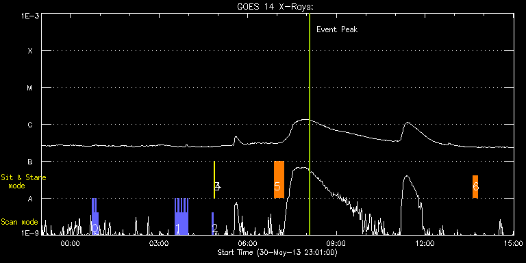 EIS Observation timeline overlay to GOES-Xray curve Code 1" 2" 40" 266" EIS Observations list for this event: STUDY ACRONYM ID DATE OBSERVED DESCRIPTION NOAA# TARGET 0 Alignment_modify_v2 | 34043 | 2013/05/31 00:43:50 | Hinode instrument alignment program | | Quiet Sun TIMELINE ID DATE OBSERVED FITS FILE XCEN (+W/-E) YCEN (+N/-S) DUR ----------------------------------------------------------------------------------------------------------------- 34043 | 2013/05/31 00:43:50.000 | eis_l0_20130531_004350.fits.gz | -9.55 | 944.62 | 2m34s 34043 | 2013/05/31 00:46:58.000 | eis_l0_20130531_004658.fits.gz | -9.47 | 944.70 | 2m34s 34043 | 2013/05/31 00:50:05.000 | eis_l0_20130531_005005.fits.gz | -9.47 | 944.55 | 2m34s 34043 | 2013/05/31 00:53:13.000 | eis_l0_20130531_005313.fits.gz | -9.47 | 944.55 | 2m34s 1 Alignment_modify_v2 | 34044 | 2013/05/31 03:31:43 | Hinode instrument alignment program | | Quiet Sun TIMELINE ID DATE OBSERVED FITS FILE XCEN (+W/-E) YCEN (+N/-S) DUR ----------------------------------------------------------------------------------------------------------------- 34044 | 2013/05/31 03:31:43.000 | eis_l0_20130531_033143.fits.gz | -9893.92 | -9963.20 | 2m34s 34044 | 2013/05/31 03:34:51.000 | eis_l0_20130531_033451.fits.gz | -9893.92 | -9963.20 | 2m34s 34044 | 2013/05/31 03:37:58.000 | eis_l0_20130531_033758.fits.gz | -9893.92 | -9963.20 | 2m34s 34044 | 2013/05/31 03:41:06.000 | eis_l0_20130531_034106.fits.gz | -9893.92 | -9963.20 | 2m34s 34044 | 2013/05/31 03:44:13.000 | eis_l0_20130531_034413.fits.gz | -9893.92 | -9963.20 | 2m34s 34044 | 2013/05/31 03:47:21.000 | eis_l0_20130531_034721.fits.gz | -9893.92 | -9963.20 | 2m34s 34044 | 2013/05/31 03:50:28.000 | eis_l0_20130531_035028.fits.gz | -9893.92 | -9963.20 | 2m34s 34044 | 2013/05/31 03:53:36.000 | eis_l0_20130531_035336.fits.gz | -9893.92 | -9963.20 | 2m34s 34044 | 2013/05/31 03:56:43.000 | eis_l0_20130531_035643.fits.gz | -9893.92 | -9963.20 | 2m34s 2 PRY_slot_contextLITE | 34011 | 2013/05/31 04:47:13 | Measurements during XRT Synoptic | 1757 | Active Region TIMELINE ID DATE OBSERVED FITS FILE XCEN (+W/-E) YCEN (+N/-S) DUR ----------------------------------------------------------------------------------------------------------------- 34011 | 2013/05/31 04:47:13.000 | eis_l0_20130531_044713.fits.gz | -15.21 | -0.42 | 2m57s 3 Alignment_266 | 34012 | 2013/05/31 04:50:57 | Measurements during XRT Synoptic | 1757 | Quiet Sun TIMELINE ID DATE OBSERVED FITS FILE XCEN (+W/-E) YCEN (+N/-S) DUR ----------------------------------------------------------------------------------------------------------------- 34012 | 2013/05/31 04:50:57.000 | eis_l0_20130531_045057.fits.gz | -132.49 | -0.35 | 1m22s 4 XRT_synop_AIA | 34013 | 2013/05/31 04:53:19 | Measurements during XRT Synoptic | 1757 | Quiet Sun TIMELINE ID DATE OBSERVED FITS FILE XCEN (+W/-E) YCEN (+N/-S) DUR ----------------------------------------------------------------------------------------------------------------- 34013 | 2013/05/31 04:53:19.000 | eis_l0_20130531_045319.fits.gz | -132.57 | -0.35 | 10s 5 EL_WHI_CH_limb | 34049 | 2013/05/31 06:53:41 | HOP 201 | | Coronal Hole TIMELINE ID DATE OBSERVED FITS FILE XCEN (+W/-E) YCEN (+N/-S) DUR ----------------------------------------------------------------------------------------------------------------- 34049 | 2013/05/31 06:53:41.000 | eis_l0_20130531_065341.fits.gz | 1100.27 | -450.22 | 20m2s 6 EL_WHI_CH_limb | 34053 | 2013/05/31 13:37:17 | HOP 201 | | Coronal Hole TIMELINE ID DATE OBSERVED FITS FILE XCEN (+W/-E) YCEN (+N/-S) DUR ----------------------------------------------------------------------------------------------------------------- 34053 | 2013/05/31 13:37:17.000 | eis_l0_20130531_133717.fits.gz | 1100.44 | -450.99 | 10m : Check study information : Download file : View thumbnails For this event, also check for: