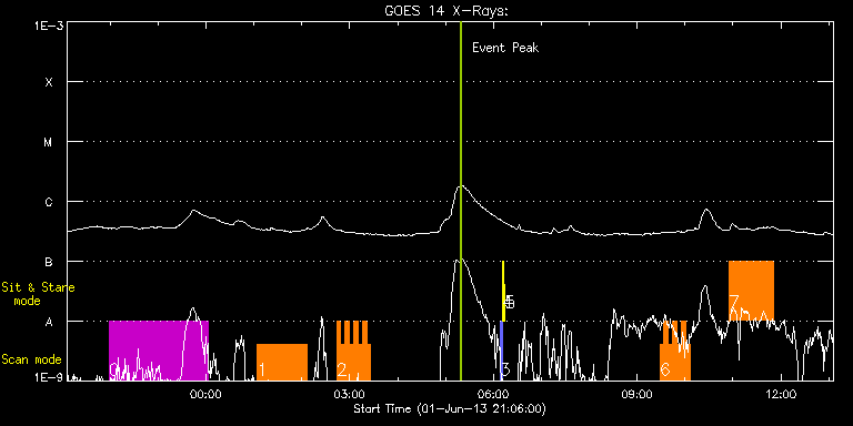 EIS Observation timeline overlay to GOES-Xray curve Code 1" 2" 40" 266" EIS Observations list for this event: STUDY ACRONYM ID DATE OBSERVED DESCRIPTION NOAA# TARGET 0 HPW021_VEL_240x512v1 | 34084 | 2013/06/01 21:58:37 | returning AR 11760 obs | 1760 | Active Region TIMELINE ID DATE OBSERVED FITS FILE XCEN (+W/-E) YCEN (+N/-S) DUR ----------------------------------------------------------------------------------------------------------------- 34084 | 2013/06/01 21:58:37.000 | eis_l0_20130601_215837.fits.gz | -432.20 | 221.09 | 2h3m48s 1 Atlas_60 | 34085 | 2013/06/02 01:04:22 | returning AR 11760 obs | 1760 | Quiet Sun TIMELINE ID DATE OBSERVED FITS FILE XCEN (+W/-E) YCEN (+N/-S) DUR ----------------------------------------------------------------------------------------------------------------- 34085 | 2013/06/02 01:04:22.000 | eis_l0_20130602_010422.fits.gz | -415.48 | 221.17 | 1h1m39s 2 HH_Flare+AR_180x152 | 34098 | 2013/06/02 02:43:39 | AR 11760 obs | 1760 | Flare TIMELINE ID DATE OBSERVED FITS FILE XCEN (+W/-E) YCEN (+N/-S) DUR ----------------------------------------------------------------------------------------------------------------- 34098 | 2013/06/02 02:43:39.000 | eis_l0_20130602_024339.fits.gz | -395.82 | 221.17 | 5m18s 34098 | 2013/06/02 02:49:00.000 | eis_l0_20130602_024900.fits.gz | -395.12 | 221.09 | 5m17s 34098 | 2013/06/02 02:54:20.000 | eis_l0_20130602_025420.fits.gz | -394.35 | 221.01 | 5m18s 34098 | 2013/06/02 02:59:41.000 | eis_l0_20130602_025941.fits.gz | -393.65 | 220.93 | 5m18s 34098 | 2013/06/02 03:05:02.000 | eis_l0_20130602_030502.fits.gz | -392.80 | 221.01 | 5m19s 34098 | 2013/06/02 03:10:24.000 | eis_l0_20130602_031024.fits.gz | -392.18 | 221.01 | 5m17s 34098 | 2013/06/02 03:15:44.000 | eis_l0_20130602_031544.fits.gz | -391.49 | 220.93 | 5m18s 34098 | 2013/06/02 03:21:05.000 | eis_l0_20130602_032105.fits.gz | -390.64 | 221.01 | 5m17s 3 PRY_slot_contextLITE | 34069 | 2013/06/02 06:08:20 | EIS-AIA alignment | 1763 | Active Region TIMELINE ID DATE OBSERVED FITS FILE XCEN (+W/-E) YCEN (+N/-S) DUR ----------------------------------------------------------------------------------------------------------------- 34069 | 2013/06/02 06:08:20.000 | eis_l0_20130602_060820.fits.gz | -15.21 | -0.58 | 2m57s 4 Alignment_266 | 34123 | 2013/06/02 06:11:35 | EIS-AIA alignment | 1760 | Quiet Sun TIMELINE ID DATE OBSERVED FITS FILE XCEN (+W/-E) YCEN (+N/-S) DUR ----------------------------------------------------------------------------------------------------------------- 34123 | 2013/06/02 06:11:35.000 | eis_l0_20130602_061135.fits.gz | -132.49 | -0.42 | 1m22s 5 XRT_synop_AIA | 34124 | 2013/06/02 06:14:09 | EIS-AIA alignment | 1760 | Quiet Sun TIMELINE ID DATE OBSERVED FITS FILE XCEN (+W/-E) YCEN (+N/-S) DUR ----------------------------------------------------------------------------------------------------------------- 34124 | 2013/06/02 06:14:09.000 | eis_l0_20130602_061409.fits.gz | -132.57 | -0.50 | 10s 6 HH_Flare+AR_180x152 | 34100 | 2013/06/02 09:28:27 | AR 11760 obs | 1760 | Flare TIMELINE ID DATE OBSERVED FITS FILE XCEN (+W/-E) YCEN (+N/-S) DUR ----------------------------------------------------------------------------------------------------------------- 34100 | 2013/06/02 09:28:27.000 | eis_l0_20130602_092827.fits.gz | -347.16 | 220.93 | 5m17s 34100 | 2013/06/02 09:33:47.000 | eis_l0_20130602_093347.fits.gz | -346.47 | 220.86 | 5m18s 34100 | 2013/06/02 09:39:08.000 | eis_l0_20130602_093908.fits.gz | -345.77 | 220.78 | 5m18s 34100 | 2013/06/02 09:44:29.000 | eis_l0_20130602_094429.fits.gz | -345.00 | 220.63 | 5m18s 34100 | 2013/06/02 09:49:50.000 | eis_l0_20130602_094950.fits.gz | -344.30 | 220.78 | 5m18s 34100 | 2013/06/02 09:55:11.000 | eis_l0_20130602_095511.fits.gz | -343.53 | 220.86 | 5m18s 34100 | 2013/06/02 10:00:32.000 | eis_l0_20130602_100032.fits.gz | -342.76 | 220.63 | 5m18s 7 FLAREDOP_EIS | 34102 | 2013/06/02 10:54:56 | AR 11760 obs | | Flare TIMELINE ID DATE OBSERVED FITS FILE XCEN (+W/-E) YCEN (+N/-S) DUR ----------------------------------------------------------------------------------------------------------------- 34102 | 2013/06/02 10:54:56.000 | eis_l0_20130602_105456.fits.gz | -325.30 | 220.78 | 55m53s : Check study information : Download file : View thumbnails For this event, also check for: