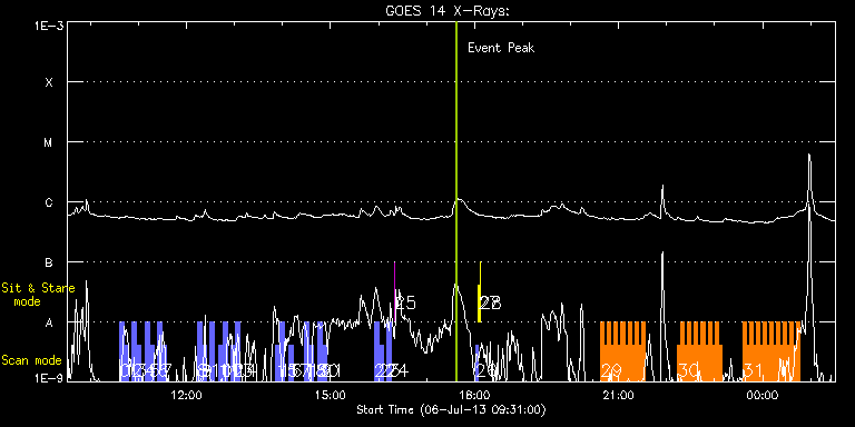 EIS Observation timeline overlay to GOES-Xray curve Code 1" 2" 40" 266" EIS Observations list for this event: STUDY ACRONYM ID DATE OBSERVED DESCRIPTION NOAA# TARGET 0 full_sun_slot_scan_1 | 34882 | 2013/07/06 10:36:20 | HOP130 Full Sun Scan 1/15 | | Quiet Sun TIMELINE ID DATE OBSERVED FITS FILE XCEN (+W/-E) YCEN (+N/-S) DUR ----------------------------------------------------------------------------------------------------------------- 34882 | 2013/07/06 10:36:20.000 | eis_l0_20130706_103620.fits.gz | 920.80 | 185.65 | 5m27s 1 full_sun_slot_scan_1 | 34883 | 2013/07/06 10:41:53 | HOP130 Full Sun Scan 1/15 | | Quiet Sun TIMELINE ID DATE OBSERVED FITS FILE XCEN (+W/-E) YCEN (+N/-S) DUR ----------------------------------------------------------------------------------------------------------------- 34883 | 2013/07/06 10:41:53.000 | eis_l0_20130706_104153.fits.gz | 920.80 | -286.42 | 5m26s 2 full_sun_slot_scan_1 | 34884 | 2013/07/06 10:52:13 | HOP130 Full Sun Scan 2/15 | | Quiet Sun TIMELINE ID DATE OBSERVED FITS FILE XCEN (+W/-E) YCEN (+N/-S) DUR ----------------------------------------------------------------------------------------------------------------- 34884 | 2013/07/06 10:52:13.000 | eis_l0_20130706_105213.fits.gz | 452.75 | 185.50 | 5m28s 3 full_sun_slot_scan_1 | 34885 | 2013/07/06 10:57:46 | HOP130 Full Sun Scan 2/15 | 1784 | Quiet Sun TIMELINE ID DATE OBSERVED FITS FILE XCEN (+W/-E) YCEN (+N/-S) DUR ----------------------------------------------------------------------------------------------------------------- 34885 | 2013/07/06 10:57:46.000 | eis_l0_20130706_105746.fits.gz | 452.75 | -286.50 | 5m26s 4 full_sun_slot_scan_1 | 34886 | 2013/07/06 11:08:13 | HOP130 Full Sun Scan 3/15 | | Quiet Sun TIMELINE ID DATE OBSERVED FITS FILE XCEN (+W/-E) YCEN (+N/-S) DUR ----------------------------------------------------------------------------------------------------------------- 34886 | 2013/07/06 11:08:13.000 | eis_l0_20130706_110813.fits.gz | -15.29 | 185.65 | 5m28s 5 full_sun_slot_scan_1 | 34887 | 2013/07/06 11:13:46 | HOP130 Full Sun Scan 3/15 | 1785 | Quiet Sun TIMELINE ID DATE OBSERVED FITS FILE XCEN (+W/-E) YCEN (+N/-S) DUR ----------------------------------------------------------------------------------------------------------------- 34887 | 2013/07/06 11:13:46.000 | eis_l0_20130706_111346.fits.gz | -15.37 | -286.50 | 5m27s 6 full_sun_slot_scan_1 | 34888 | 2013/07/06 11:24:13 | HOP130 Full Sun Scan 4/15 | | Quiet Sun TIMELINE ID DATE OBSERVED FITS FILE XCEN (+W/-E) YCEN (+N/-S) DUR ----------------------------------------------------------------------------------------------------------------- 34888 | 2013/07/06 11:24:13.000 | eis_l0_20130706_112413.fits.gz | -483.33 | 185.42 | 5m28s 7 full_sun_slot_scan_1 | 34889 | 2013/07/06 11:29:46 | HOP130 Full Sun Scan 4/15 | 1785 | Quiet Sun TIMELINE ID DATE OBSERVED FITS FILE XCEN (+W/-E) YCEN (+N/-S) DUR ----------------------------------------------------------------------------------------------------------------- 34889 | 2013/07/06 11:29:46.000 | eis_l0_20130706_112946.fits.gz | -483.26 | -286.42 | 5m27s 8 full_sun_slot_scan_1 | 34890 | 2013/07/06 12:13:43 | HOP130 Full Sun Scan 5/15 | | Quiet Sun TIMELINE ID DATE OBSERVED FITS FILE XCEN (+W/-E) YCEN (+N/-S) DUR ----------------------------------------------------------------------------------------------------------------- 34890 | 2013/07/06 12:13:43.000 | eis_l0_20130706_121343.fits.gz | -9884.69 | -9777.20 | 5m27s 9 full_sun_slot_scan_1 | 34891 | 2013/07/06 12:19:16 | HOP130 Full Sun Scan 5/15 | | Quiet Sun TIMELINE ID DATE OBSERVED FITS FILE XCEN (+W/-E) YCEN (+N/-S) DUR ----------------------------------------------------------------------------------------------------------------- 34891 | 2013/07/06 12:19:16.000 | eis_l0_20130706_121916.fits.gz | -9884.69 | -10249.20 | 5m26s 10 full_sun_slot_scan_1 | 34892 | 2013/07/06 12:29:43 | HOP130 Full Sun Scan 6/15 | | Quiet Sun TIMELINE ID DATE OBSERVED FITS FILE XCEN (+W/-E) YCEN (+N/-S) DUR ----------------------------------------------------------------------------------------------------------------- 34892 | 2013/07/06 12:29:43.000 | eis_l0_20130706_122943.fits.gz | 744.44 | 655.63 | 5m28s 11 full_sun_slot_scan_1 | 34893 | 2013/07/06 12:39:43 | HOP130 Full Sun Scan 7/15 | | Quiet Sun TIMELINE ID DATE OBSERVED FITS FILE XCEN (+W/-E) YCEN (+N/-S) DUR ----------------------------------------------------------------------------------------------------------------- 34893 | 2013/07/06 12:39:43.000 | eis_l0_20130706_123943.fits.gz | 395.82 | 1032.67 | 5m28s 12 full_sun_slot_scan_1 | 34894 | 2013/07/06 12:45:16 | HOP130 Full Sun Scan 7/15 | | Quiet Sun TIMELINE ID DATE OBSERVED FITS FILE XCEN (+W/-E) YCEN (+N/-S) DUR ----------------------------------------------------------------------------------------------------------------- 34894 | 2013/07/06 12:45:16.000 | eis_l0_20130706_124516.fits.gz | 395.90 | 560.44 | 5m26s 13 full_sun_slot_scan_1 | 34895 | 2013/07/06 12:55:43 | HOP130 Full Sun Scan 8/15 | | Quiet Sun TIMELINE ID DATE OBSERVED FITS FILE XCEN (+W/-E) YCEN (+N/-S) DUR ----------------------------------------------------------------------------------------------------------------- 34895 | 2013/07/06 12:55:43.000 | eis_l0_20130706_125543.fits.gz | -15.37 | 1126.61 | 5m27s 14 full_sun_slot_scan_1 | 34896 | 2013/07/06 13:01:16 | HOP130 Full Sun Scan 8/15 | | Quiet Sun TIMELINE ID DATE OBSERVED FITS FILE XCEN (+W/-E) YCEN (+N/-S) DUR ----------------------------------------------------------------------------------------------------------------- 34896 | 2013/07/06 13:01:16.000 | eis_l0_20130706_130116.fits.gz | -15.29 | 654.45 | 5m27s 15 full_sun_slot_scan_1 | 34897 | 2013/07/06 13:51:43 | HOP130 Full Sun Scan 9/15 | | Quiet Sun TIMELINE ID DATE OBSERVED FITS FILE XCEN (+W/-E) YCEN (+N/-S) DUR ----------------------------------------------------------------------------------------------------------------- 34897 | 2013/07/06 13:51:43.000