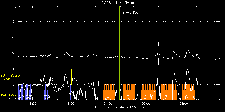 EIS Observation timeline overlay to GOES-Xray curve Code 1" 2" 40" 266" EIS Observations list for this event: STUDY ACRONYM ID DATE OBSERVED DESCRIPTION NOAA# TARGET 0 full_sun_slot_scan_1 | 34897 | 2013/07/06 13:51:43 | HOP130 Full Sun Scan 9/15 | | Quiet Sun TIMELINE ID DATE OBSERVED FITS FILE XCEN (+W/-E) YCEN (+N/-S) DUR ----------------------------------------------------------------------------------------------------------------- 34897 | 2013/07/06 13:51:43.000 | eis_l0_20130706_135143.fits.gz | -426.15 | 1032.44 | 5m27s 1 full_sun_slot_scan_1 | 34898 | 2013/07/06 13:57:15 | HOP130 Full Sun Scan 9/15 | | Quiet Sun TIMELINE ID DATE OBSERVED FITS FILE XCEN (+W/-E) YCEN (+N/-S) DUR ----------------------------------------------------------------------------------------------------------------- 34898 | 2013/07/06 13:57:15.000 | eis_l0_20130706_135715.fits.gz | -426.15 | 560.60 | 5m27s 2 full_sun_slot_scan_1 | 34899 | 2013/07/06 14:07:43 | HOP130 Full Sun Scan 10/15 | | Quiet Sun TIMELINE ID DATE OBSERVED FITS FILE XCEN (+W/-E) YCEN (+N/-S) DUR ----------------------------------------------------------------------------------------------------------------- 34899 | 2013/07/06 14:07:43.000 | eis_l0_20130706_140743.fits.gz | -830.00 | 655.63 | 5m27s 3 full_sun_slot_scan_1 | 34901 | 2013/07/06 14:27:43 | HOP130 Full Sun Scan 12/15 | | Quiet Sun TIMELINE ID DATE OBSERVED FITS FILE XCEN (+W/-E) YCEN (+N/-S) DUR ----------------------------------------------------------------------------------------------------------------- 34901 | 2013/07/06 14:27:43.000 | eis_l0_20130706_142743.fits.gz | 395.82 | -661.67 | 5m28s 4 full_sun_slot_scan_1 | 34902 | 2013/07/06 14:33:16 | HOP130 Full Sun Scan 12/15 | | Quiet Sun TIMELINE ID DATE OBSERVED FITS FILE XCEN (+W/-E) YCEN (+N/-S) DUR ----------------------------------------------------------------------------------------------------------------- 34902 | 2013/07/06 14:33:16.000 | eis_l0_20130706_143316.fits.gz | 395.82 | -1133.60 | 5m27s 5 full_sun_slot_scan_1 | 34903 | 2013/07/06 14:43:43 | HOP130 Full Sun Scan 13/15 | | Quiet Sun TIMELINE ID DATE OBSERVED FITS FILE XCEN (+W/-E) YCEN (+N/-S) DUR ----------------------------------------------------------------------------------------------------------------- 34903 | 2013/07/06 14:43:43.000 | eis_l0_20130706_144343.fits.gz | -15.29 | -755.45 | 5m28s 6 full_sun_slot_scan_1 | 34904 | 2013/07/06 14:49:16 | HOP130 Full Sun Scan 13/15 | | Quiet Sun TIMELINE ID DATE OBSERVED FITS FILE XCEN (+W/-E) YCEN (+N/-S) DUR ----------------------------------------------------------------------------------------------------------------- 34904 | 2013/07/06 14:49:16.000 | eis_l0_20130706_144916.fits.gz | -15.21 | -1227.45 | 5m26s 7 full_sun_slot_scan_1 | 34905 | 2013/07/06 15:54:43 | HOP130 Full Sun Scan 14/15 | | Quiet Sun TIMELINE ID DATE OBSERVED FITS FILE XCEN (+W/-E) YCEN (+N/-S) DUR ----------------------------------------------------------------------------------------------------------------- 34905 | 2013/07/06 15:54:43.000 | eis_l0_20130706_155443.fits.gz | -426.15 | -661.44 | 5m27s 8 full_sun_slot_scan_1 | 34906 | 2013/07/06 16:00:16 | HOP130 Full Sun Scan 14/15 | | Quiet Sun TIMELINE ID DATE OBSERVED FITS FILE XCEN (+W/-E) YCEN (+N/-S) DUR ----------------------------------------------------------------------------------------------------------------- 34906 | 2013/07/06 16:00:16.000 | eis_l0_20130706_160016.fits.gz | -426.08 | -1133.52 | 5m26s 9 full_sun_slot_scan_1 | 34907 | 2013/07/06 16:10:43 | HOP130 Full Sun Scan 15/15 | | Quiet Sun TIMELINE ID DATE OBSERVED FITS FILE XCEN (+W/-E) YCEN (+N/-S) DUR ----------------------------------------------------------------------------------------------------------------- 34907 | 2013/07/06 16:10:43.000 | eis_l0_20130706_161043.fits.gz | -830.08 | -757.32 | 5m27s 10 regcal076 | 34918 | 2013/07/06 16:20:12 | Flatfield, 1 exposure, led 100ms, ccd | | Engineering TIMELINE ID DATE OBSERVED FITS FILE XCEN (+W/-E) YCEN (+N/-S) DUR ----------------------------------------------------------------------------------------------------------------- 34918 | 2013/07/06 16:20:12.000 | eis_l0_20130706_162012.fits.gz | -800.45 | -521.25 | 1s 11 PRY_slot_contextLITE | 34908 | 2013/07/06 18:01:14 | EIS pointing monitoring | 1785 | Active Region TIMELINE ID DATE OBSERVED FITS FILE XCEN (+W/-E) YCEN (+N/-S) DUR ----------------------------------------------------------------------------------------------------------------- 34908 | 2013/07/06 18:01:14.000 | eis_l0_20130706_180114.fits.gz | -15.29 | -0.58 | 2m56s 12 Alignment_266 | 34909 | 2013/07/06 18:04:29 | EIS pointing monitoring | 1785 | Quiet Sun TIMELINE ID DATE OBSERVED FITS FILE XCEN (+W/-E) YCEN (+N/-S) DUR ----------------------------------------------------------------------------------------------------------------- 34909 | 2013/07/06 18:04:29.000 | eis_l0_20130706_180429.fits.gz | -132.49 | -0.50 | 1m22s 13 XRT_synop_AIA | 34910 | 2013/07/06 18:06:36 | EIS pointing monitoring | 1785 | Quiet Sun TIMELINE ID DATE OBSERVED FITS FILE XCEN (+W/-E) YCEN (+N/-S) DUR ----------------------------------------------------------------------------------------------------------------- 34910 | 2013/07/06 18:06:36.000 | eis_l0_20130706_180636.fits.gz | -132.49 | -0.35 | 10s 14 HH_Flare_162x152 | 34923 | 2013/07/06 20:37:50 | Flare Observations | 1788 | Flare TIMELINE ID DATE OBSERVED FITS FILE XCEN (+W/-E) YCEN (+N/-S) DUR ----------------------------------------------------------------------------------------------------------------- 34923 | 2013/07/06 20:37:50.000 | eis_l0_20130706_203750.fits.gz | -242.23 | -230.67 | 4m10s 34923 | 2013/07/06 20:42:03.000 | eis_l0_20130706_204203.fits.gz | -241.76 | -230.75 | 4m11s 34923 | 2013/07/06 20:46:17.000 | eis_l0_20130706_204617.fits.gz | -241.15 | -230.59 | 4m10s 34923 | 2013/07/06 20:50:30.000 | eis_l0_20130706_205030.fits.gz | -240.45 | -230.67 | 4m11s 34923 | 2013/07/06 20:54:44.000 | eis_l0_2013