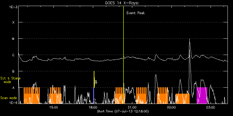 EIS Observation timeline overlay to GOES-Xray curve Code 1" 2" 40" 266" EIS Observations list for this event: STUDY ACRONYM ID DATE OBSERVED DESCRIPTION NOAA# TARGET 0 HH_Flare_162x152 | 34931 | 2013/07/07 12:43:13 | Flare Observations | 1788 | Flare TIMELINE ID DATE OBSERVED FITS FILE XCEN (+W/-E) YCEN (+N/-S) DUR ----------------------------------------------------------------------------------------------------------------- 34931 | 2013/07/07 12:43:13.000 | eis_l0_20130707_124313.fits.gz | -101.79 | -233.37 | 4m11s 34931 | 2013/07/07 12:47:26.000 | eis_l0_20130707_124726.fits.gz | -101.10 | -233.30 | 4m11s 34931 | 2013/07/07 12:51:40.000 | eis_l0_20130707_125140.fits.gz | -100.40 | -233.30 | 4m11s 34931 | 2013/07/07 12:55:53.000 | eis_l0_20130707_125553.fits.gz | -99.86 | -233.45 | 4m11s 34931 | 2013/07/07 13:00:07.000 | eis_l0_20130707_130007.fits.gz | -99.24 | -233.45 | 4m11s 34931 | 2013/07/07 13:04:20.000 | eis_l0_20130707_130420.fits.gz | -98.55 | -233.45 | 4m11s 34931 | 2013/07/07 13:08:33.000 | eis_l0_20130707_130833.fits.gz | -97.93 | -233.53 | 4m11s 34931 | 2013/07/07 13:12:47.000 | eis_l0_20130707_131247.fits.gz | -97.31 | -233.53 | 4m11s 34931 | 2013/07/07 13:17:00.000 | eis_l0_20130707_131700.fits.gz | -96.77 | -233.53 | 4m11s 34931 | 2013/07/07 13:21:14.000 | eis_l0_20130707_132114.fits.gz | -96.15 | -233.45 | 4m10s 34931 | 2013/07/07 13:25:27.000 | eis_l0_20130707_132527.fits.gz | -95.46 | -233.53 | 4m11s 34931 | 2013/07/07 13:29:41.000 | eis_l0_20130707_132941.fits.gz | -94.92 | -233.45 | 4m10s 34931 | 2013/07/07 13:33:54.000 | eis_l0_20130707_133354.fits.gz | -94.38 | -233.68 | 4m11s 34931 | 2013/07/07 13:38:08.000 | eis_l0_20130707_133808.fits.gz | -93.60 | -233.60 | 4m5s 34931 | 2013/07/07 13:42:26.000 | eis_l0_20130707_134226.fits.gz | -92.75 | -233.68 | 4m5s 34931 | 2013/07/07 13:46:34.000 | eis_l0_20130707_134634.fits.gz | -92.29 | -233.37 | 4m11s 34931 | 2013/07/07 13:50:48.000 | eis_l0_20130707_135048.fits.gz | -91.67 | -233.76 | 4m10s 1 HH_Flare_162x152 | 34932 | 2013/07/07 14:40:13 | Flare Observations | 1788 | Flare TIMELINE ID DATE OBSERVED FITS FILE XCEN (+W/-E) YCEN (+N/-S) DUR ----------------------------------------------------------------------------------------------------------------- 34932 | 2013/07/07 14:40:13.000 | eis_l0_20130707_144013.fits.gz | -84.33 | -233.68 | 4m11s 34932 | 2013/07/07 14:44:27.000 | eis_l0_20130707_144427.fits.gz | -83.79 | -233.68 | 4m10s 34932 | 2013/07/07 14:48:40.000 | eis_l0_20130707_144840.fits.gz | -83.18 | -233.68 | 4m11s 34932 | 2013/07/07 14:52:54.000 | eis_l0_20130707_145254.fits.gz | -82.56 | -233.68 | 4m10s 34932 | 2013/07/07 14:57:07.000 | eis_l0_20130707_145707.fits.gz | -81.94 | -233.76 | 4m11s 34932 | 2013/07/07 15:01:20.000 | eis_l0_20130707_150120.fits.gz | -81.32 | -233.68 | 4m11s 34932 | 2013/07/07 15:05:34.000 | eis_l0_20130707_150534.fits.gz | -80.70 | -233.76 | 4m11s 34932 | 2013/07/07 15:09:47.000 | eis_l0_20130707_150947.fits.gz | -80.01 | -233.76 | 4m11s 34932 | 2013/07/07 15:14:01.000 | eis_l0_20130707_151401.fits.gz | -79.47 | -233.76 | 4m10s 34932 | 2013/07/07 15:18:14.000 | eis_l0_20130707_151814.fits.gz | -79.08 | -233.84 | 4m11s 34932 | 2013/07/07 15:22:28.000 | eis_l0_20130707_152228.fits.gz | -78.23 | -233.68 | 4m10s 34932 | 2013/07/07 15:26:41.000 | eis_l0_20130707_152641.fits.gz | -77.54 | -233.84 | 3m42s 34932 | 2013/07/07 15:31:22.000 | eis_l0_20130707_153122.fits.gz | -76.84 | -233.84 | 3m43s 2 PRY_slot_contextLITE | 34911 | 2013/07/07 18:01:20 | EIS pointing monitoring | 1785 | Active Region TIMELINE ID DATE OBSERVED FITS FILE XCEN (+W/-E) YCEN (+N/-S) DUR ----------------------------------------------------------------------------------------------------------------- 34911 | 2013/07/07 18:01:20.000 | eis_l0_20130707_180120.fits.gz | -15.06 | -0.42 | 2m56s 3 Alignment_266 | 34912 | 2013/07/07 18:04:34 | EIS pointing monitoring | 1785 | Quiet Sun TIMELINE ID DATE OBSERVED FITS FILE XCEN (+W/-E) YCEN (+N/-S) DUR ----------------------------------------------------------------------------------------------------------------- 34912 | 2013/07/07 18:04:34.000 | eis_l0_20130707_180434.fits.gz | -132.49 | -0.27 | 1m22s 4 XRT_synop_AIA | 34913 | 2013/07/07 18:07:09 | EIS pointing monitoring | 1785 | Quiet Sun TIMELINE ID DATE OBSERVED FITS FILE XCEN (+W/-E) YCEN (+N/-S) DUR ----------------------------------------------------------------------------------------------------------------- 34913 | 2013/07/07 18:07:09.000 | eis_l0_20130707_180709.fits.gz | -132.57 | -0.50 | 10s 5 HH_Flare_162x152 | 34950 | 2013/07/07 19:40:19 | Flare Observations | 1788 | Flare TIMELINE ID DATE OBSERVED FITS FILE XCEN (+W/-E) YCEN (+N/-S) DUR ----------------------------------------------------------------------------------------------------------------- 34950 | 2013/07/07 19:40:19.000 | eis_l0_20130707_194019.fits.gz | -40.07 | -234.30 | 4m11s 34950 | 2013/07/07 19:44:33.000 | eis_l0_20130707_194433.fits.gz | -39.38 | -234.22 | 4m10s 34950 | 2013/07/07 19:48:46.000 | eis_l0_20130707_194846.fits.gz | -38.76 | -234.30 | 4m11s 34950 | 2013/07/07 19:53:00.000 | eis_l0_20130707_195300.fits.gz | -38.06 | -234.22 | 4m10s 34950 | 2013/07/07 19:57:13.000 | eis_l0_20130707_195713.fits.gz | -37.45 | -234.30 | 4m10s 34950 | 2013/07/07 20:01:26.000 | eis_l0_20130707_200126.fits.gz | -36.90 | -234.30 | 4m11s 34950 | 2013/07/07 20:05:40.000 | eis_l0_20130707_200540.fits.gz | -36.21 | -234.30 | 4m10s 34950 | 2013/07/07 20:09:53.000 | eis_l0_20130707_200953.fits.gz | -35.67 | -234.30 | 4m11s 34950 | 2013/07/07 20:14:07.000 | eis_l0_20130707_201407.fits.gz | -35.05 | -234.22 | 4m10s 34950 | 2013/07/07 20:18:20.000 | eis_l0_20130707_201820.fits.gz | -34.20 | -234.38 | 4m11s 34950 | 2013/07/07 20:22:33.000 | eis_l0_20130707_202233.fits.gz | -33.74 | -234.22 | 4m11s 6 HH_Flare_162x152 | 34951 | 2013/07/07 21:18:40 | Flare Observations | 1788 | Flare TIMELINE ID DATE OBSERVED FITS FILE XCEN (+W/-E) YCEN (+N/-S) DUR ---------------------