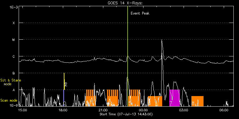 EIS Observation timeline overlay to GOES-Xray curve Code 1" 2" 40" 266" EIS Observations list for this event: STUDY ACRONYM ID DATE OBSERVED DESCRIPTION NOAA# TARGET 0 PRY_slot_contextLITE | 34911 | 2013/07/07 18:01:20 | EIS pointing monitoring | 1785 | Active Region TIMELINE ID DATE OBSERVED FITS FILE XCEN (+W/-E) YCEN (+N/-S) DUR ----------------------------------------------------------------------------------------------------------------- 34911 | 2013/07/07 18:01:20.000 | eis_l0_20130707_180120.fits.gz | -15.06 | -0.42 | 2m56s 1 Alignment_266 | 34912 | 2013/07/07 18:04:34 | EIS pointing monitoring | 1785 | Quiet Sun TIMELINE ID DATE OBSERVED FITS FILE XCEN (+W/-E) YCEN (+N/-S) DUR ----------------------------------------------------------------------------------------------------------------- 34912 | 2013/07/07 18:04:34.000 | eis_l0_20130707_180434.fits.gz | -132.49 | -0.27 | 1m22s 2 XRT_synop_AIA | 34913 | 2013/07/07 18:07:09 | EIS pointing monitoring | 1785 | Quiet Sun TIMELINE ID DATE OBSERVED FITS FILE XCEN (+W/-E) YCEN (+N/-S) DUR ----------------------------------------------------------------------------------------------------------------- 34913 | 2013/07/07 18:07:09.000 | eis_l0_20130707_180709.fits.gz | -132.57 | -0.50 | 10s 3 HH_Flare_162x152 | 34950 | 2013/07/07 19:40:19 | Flare Observations | 1788 | Flare TIMELINE ID DATE OBSERVED FITS FILE XCEN (+W/-E) YCEN (+N/-S) DUR ----------------------------------------------------------------------------------------------------------------- 34950 | 2013/07/07 19:40:19.000 | eis_l0_20130707_194019.fits.gz | -40.07 | -234.30 | 4m11s 34950 | 2013/07/07 19:44:33.000 | eis_l0_20130707_194433.fits.gz | -39.38 | -234.22 | 4m10s 34950 | 2013/07/07 19:48:46.000 | eis_l0_20130707_194846.fits.gz | -38.76 | -234.30 | 4m11s 34950 | 2013/07/07 19:53:00.000 | eis_l0_20130707_195300.fits.gz | -38.06 | -234.22 | 4m10s 34950 | 2013/07/07 19:57:13.000 | eis_l0_20130707_195713.fits.gz | -37.45 | -234.30 | 4m10s 34950 | 2013/07/07 20:01:26.000 | eis_l0_20130707_200126.fits.gz | -36.90 | -234.30 | 4m11s 34950 | 2013/07/07 20:05:40.000 | eis_l0_20130707_200540.fits.gz | -36.21 | -234.30 | 4m10s 34950 | 2013/07/07 20:09:53.000 | eis_l0_20130707_200953.fits.gz | -35.67 | -234.30 | 4m11s 34950 | 2013/07/07 20:14:07.000 | eis_l0_20130707_201407.fits.gz | -35.05 | -234.22 | 4m10s 34950 | 2013/07/07 20:18:20.000 | eis_l0_20130707_201820.fits.gz | -34.20 | -234.38 | 4m11s 34950 | 2013/07/07 20:22:33.000 | eis_l0_20130707_202233.fits.gz | -33.74 | -234.22 | 4m11s 4 HH_Flare_162x152 | 34951 | 2013/07/07 21:18:40 | Flare Observations | 1788 | Flare TIMELINE ID DATE OBSERVED FITS FILE XCEN (+W/-E) YCEN (+N/-S) DUR ----------------------------------------------------------------------------------------------------------------- 34951 | 2013/07/07 21:18:40.000 | eis_l0_20130707_211840.fits.gz | -25.47 | -234.46 | 4m10s 34951 | 2013/07/07 21:22:53.000 | eis_l0_20130707_212253.fits.gz | -24.78 | -234.38 | 4m11s 34951 | 2013/07/07 21:27:07.000 | eis_l0_20130707_212707.fits.gz | -24.16 | -234.30 | 4m10s 34951 | 2013/07/07 21:31:20.000 | eis_l0_20130707_213120.fits.gz | -23.54 | -234.38 | 4m11s 34951 | 2013/07/07 21:35:33.000 | eis_l0_20130707_213533.fits.gz | -22.92 | -234.53 | 4m11s 34951 | 2013/07/07 21:39:47.000 | eis_l0_20130707_213947.fits.gz | -22.30 | -234.38 | 4m11s 34951 | 2013/07/07 21:44:00.000 | eis_l0_20130707_214400.fits.gz | -21.53 | -234.53 | 4m11s 34951 | 2013/07/07 21:48:14.000 | eis_l0_20130707_214814.fits.gz | -21.07 | -234.46 | 4m10s 34951 | 2013/07/07 21:52:27.000 | eis_l0_20130707_215227.fits.gz | -20.45 | -234.38 | 4m11s 34951 | 2013/07/07 21:56:41.000 | eis_l0_20130707_215641.fits.gz | -19.68 | -234.38 | 4m10s 34951 | 2013/07/07 22:00:54.000 | eis_l0_20130707_220054.fits.gz | -19.06 | -234.38 | 4m11s 5 HH_Flare_162x152 | 34952 | 2013/07/07 22:53:13 | Flare Observations | 1788 | Flare TIMELINE ID DATE OBSERVED FITS FILE XCEN (+W/-E) YCEN (+N/-S) DUR ----------------------------------------------------------------------------------------------------------------- 34952 | 2013/07/07 22:53:13.000 | eis_l0_20130707_225313.fits.gz | -11.34 | -234.46 | 4m10s 34952 | 2013/07/07 22:57:26.000 | eis_l0_20130707_225726.fits.gz | -10.79 | -234.46 | 4m10s 34952 | 2013/07/07 23:01:39.000 | eis_l0_20130707_230139.fits.gz | -10.02 | -234.46 | 4m11s 34952 | 2013/07/07 23:05:53.000 | eis_l0_20130707_230553.fits.gz | -9.48 | -234.46 | 4m10s 34952 | 2013/07/07 23:10:06.000 | eis_l0_20130707_231006.fits.gz | -8.94 | -234.53 | 4m10s 34952 | 2013/07/07 23:14:19.000 | eis_l0_20130707_231419.fits.gz | -8.25 | -234.53 | 4m11s 34952 | 2013/07/07 23:18:33.000 | eis_l0_20130707_231833.fits.gz | -7.63 | -234.53 | 4m10s 34952 | 2013/07/07 23:22:46.000 | eis_l0_20130707_232246.fits.gz | -6.93 | -234.61 | 4m11s 34952 | 2013/07/07 23:27:00.000 | eis_l0_20130707_232700.fits.gz | -6.39 | -234.53 | 4m10s 34952 | 2013/07/07 23:31:13.000 | eis_l0_20130707_233113.fits.gz | -5.70 | -234.46 | 4m11s 34952 | 2013/07/07 23:35:27.000 | eis_l0_20130707_233527.fits.gz | -5.08 | -234.61 | 4m10s 34952 | 2013/07/07 23:39:40.000 | eis_l0_20130707_233940.fits.gz | -4.54 | -234.61 | 4m11s 6 Atlas_60 | 34947 | 2013/07/08 00:20:42 | observe returning southern AR | 1785 | Quiet Sun TIMELINE ID DATE OBSERVED FITS FILE XCEN (+W/-E) YCEN (+N/-S) DUR ----------------------------------------------------------------------------------------------------------------- 34947 | 2013/07/08 00:20:42.000 | eis_l0_20130708_002042.fits.gz | -0.01 | -209.46 | 1h1m40s 7 HPW021_VEL_120x512v2 | 34948 | 2013/07/08 01:55:56 | observe returning southern AR | 1785 | Active Region TIMELINE ID DATE OBSERVED FITS FILE XCEN (+W/-E) YCEN (+N/-S) DUR ----------------------------------------------------------------------------------------------------------------- 34948 | 2013/07/08 01:55:56.000 | eis_l0_20130708_015556.fits.gz | 14.19 | -264.45 | 46m54s 8 GDZ_300x360_S2S3_30S | 34949 | 2013/07/08 03:35:26 | observe returning southern