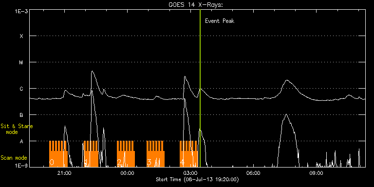 EIS Observation timeline overlay to GOES-Xray curve Code 1" 2" 40" 266" EIS Observations list for this event: STUDY ACRONYM ID DATE OBSERVED DESCRIPTION NOAA# TARGET 0 HH_Flare_162x152 | 34956 | 2013/07/08 20:17:19 | Flare Observations | 1785 | Flare TIMELINE ID DATE OBSERVED FITS FILE XCEN (+W/-E) YCEN (+N/-S) DUR ----------------------------------------------------------------------------------------------------------------- 34956 | 2013/07/08 20:17:19.000 | eis_l0_20130708_201719.fits.gz | 188.14 | -234.84 | 4m10s 34956 | 2013/07/08 20:21:32.000 | eis_l0_20130708_202132.fits.gz | 188.68 | -234.84 | 4m10s 34956 | 2013/07/08 20:25:45.000 | eis_l0_20130708_202545.fits.gz | 189.37 | -234.84 | 4m11s 34956 | 2013/07/08 20:29:59.000 | eis_l0_20130708_202959.fits.gz | 189.91 | -234.92 | 4m10s 34956 | 2013/07/08 20:34:12.000 | eis_l0_20130708_203412.fits.gz | 190.61 | -234.92 | 4m11s 34956 | 2013/07/08 20:38:25.000 | eis_l0_20130708_203825.fits.gz | 191.15 | -234.92 | 4m11s 34956 | 2013/07/08 20:42:39.000 | eis_l0_20130708_204239.fits.gz | 191.85 | -235.00 | 4m11s 34956 | 2013/07/08 20:46:53.000 | eis_l0_20130708_204653.fits.gz | 192.39 | -234.84 | 4m11s 34956 | 2013/07/08 20:51:06.000 | eis_l0_20130708_205106.fits.gz | 193.16 | -234.76 | 4m11s 34956 | 2013/07/08 20:55:20.000 | eis_l0_20130708_205520.fits.gz | 193.70 | -234.84 | 4m10s 34956 | 2013/07/08 20:59:33.000 | eis_l0_20130708_205933.fits.gz | 194.32 | -234.84 | 4m11s 34956 | 2013/07/08 21:03:47.000 | eis_l0_20130708_210347.fits.gz | 194.86 | -234.84 | 4m10s 1 HH_Flare_162x152 | 34958 | 2013/07/08 21:55:12 | Flare Observations | 1785 | Flare TIMELINE ID DATE OBSERVED FITS FILE XCEN (+W/-E) YCEN (+N/-S) DUR ----------------------------------------------------------------------------------------------------------------- 34958 | 2013/07/08 21:55:12.000 | eis_l0_20130708_215512.fits.gz | 202.35 | -234.92 | 4m11s 34958 | 2013/07/08 21:59:26.000 | eis_l0_20130708_215926.fits.gz | 202.97 | -234.69 | 4m10s 34958 | 2013/07/08 22:03:39.000 | eis_l0_20130708_220339.fits.gz | 203.51 | -234.69 | 4m11s 34958 | 2013/07/08 22:07:52.000 | eis_l0_20130708_220752.fits.gz | 204.13 | -234.92 | 4m11s 34958 | 2013/07/08 22:12:06.000 | eis_l0_20130708_221206.fits.gz | 204.74 | -234.84 | 4m11s 34958 | 2013/07/08 22:16:20.000 | eis_l0_20130708_221620.fits.gz | 205.44 | -234.76 | 4m10s 34958 | 2013/07/08 22:20:33.000 | eis_l0_20130708_222033.fits.gz | 206.14 | -234.84 | 4m10s 34958 | 2013/07/08 22:24:46.000 | eis_l0_20130708_222446.fits.gz | 206.60 | -234.76 | 4m11s 34958 | 2013/07/08 22:29:00.000 | eis_l0_20130708_222900.fits.gz | 207.29 | -234.69 | 4m10s 34958 | 2013/07/08 22:33:13.000 | eis_l0_20130708_223313.fits.gz | 207.91 | -234.84 | 3m15s 2 HH_Flare_162x152 | 34959 | 2013/07/08 23:30:12 | Flare Observations | 1785 | Flare TIMELINE ID DATE OBSERVED FITS FILE XCEN (+W/-E) YCEN (+N/-S) DUR ----------------------------------------------------------------------------------------------------------------- 34959 | 2013/07/08 23:30:12.000 | eis_l0_20130708_233012.fits.gz | 221.17 | -234.76 | 4m10s 34959 | 2013/07/08 23:34:25.000 | eis_l0_20130708_233425.fits.gz | 221.79 | -234.69 | 4m11s 34959 | 2013/07/08 23:38:38.000 | eis_l0_20130708_233838.fits.gz | 222.33 | -234.69 | 4m11s 34959 | 2013/07/08 23:42:52.000 | eis_l0_20130708_234252.fits.gz | 222.95 | -234.69 | 4m10s 34959 | 2013/07/08 23:47:05.000 | eis_l0_20130708_234705.fits.gz | 223.57 | -234.69 | 4m11s 34959 | 2013/07/08 23:51:19.000 | eis_l0_20130708_235119.fits.gz | 224.10 | -234.61 | 4m10s 34959 | 2013/07/08 23:55:32.000 | eis_l0_20130708_235532.fits.gz | 224.80 | -234.76 | 4m11s 34959 | 2013/07/08 23:59:45.000 | eis_l0_20130708_235945.fits.gz | 225.34 | -234.61 | 4m11s 34959 | 2013/07/09 00:03:59.000 | eis_l0_20130709_000359.fits.gz | 225.88 | -234.69 | 4m10s 34959 | 2013/07/09 00:08:12.000 | eis_l0_20130709_000812.fits.gz | 226.73 | -234.61 | 4m11s 34959 | 2013/07/09 00:12:26.000 | eis_l0_20130709_001226.fits.gz | 227.27 | -234.61 | 4m10s 34959 | 2013/07/09 00:16:39.000 | eis_l0_20130709_001639.fits.gz | 227.81 | -234.69 | 4m11s 3 HH_Flare_162x152 | 34955 | 2013/07/09 00:55:12 | Flare Observations | 1785 | Flare TIMELINE ID DATE OBSERVED FITS FILE XCEN (+W/-E) YCEN (+N/-S) DUR ----------------------------------------------------------------------------------------------------------------- 34955 | 2013/07/09 00:55:12.000 | eis_l0_20130709_005512.fits.gz | 238.29 | -234.22 | 4m10s 34955 | 2013/07/09 00:59:25.000 | eis_l0_20130709_005925.fits.gz | 238.99 | -234.61 | 4m11s 34955 | 2013/07/09 01:03:39.000 | eis_l0_20130709_010339.fits.gz | 239.53 | -234.46 | 4m10s 34955 | 2013/07/09 01:07:52.000 | eis_l0_20130709_010752.fits.gz | 240.22 | -234.53 | 4m11s 34955 | 2013/07/09 01:12:05.000 | eis_l0_20130709_011205.fits.gz | 240.84 | -234.69 | 4m11s 34955 | 2013/07/09 01:16:19.000 | eis_l0_20130709_011619.fits.gz | 241.46 | -234.53 | 4m10s 34955 | 2013/07/09 01:20:32.000 | eis_l0_20130709_012032.fits.gz | 242.07 | -234.53 | 4m11s 34955 | 2013/07/09 01:24:46.000 | eis_l0_20130709_012446.fits.gz | 242.62 | -234.61 | 4m10s 34955 | 2013/07/09 01:28:59.000 | eis_l0_20130709_012859.fits.gz | 243.23 | -234.53 | 4m11s 34955 | 2013/07/09 01:33:13.000 | eis_l0_20130709_013313.fits.gz | 243.93 | -234.61 | 4m10s 34955 | 2013/07/09 01:37:26.000 | eis_l0_20130709_013726.fits.gz | 244.47 | -234.53 | 4m11s 34955 | 2013/07/09 01:41:39.000 | eis_l0_20130709_014139.fits.gz | 245.09 | -234.53 | 4m11s 4 HH_Flare_162x152 | 34960 | 2013/07/09 02:30:12 | Flare Observations | 1785 | Flare TIMELINE ID DATE OBSERVED FITS FILE XCEN (+W/-E) YCEN (+N/-S) DUR ----------------------------------------------------------------------------------------------------------------- 34960 | 2013/07/09 02:30:12.000 | eis_l0_20130709_023012.fits.gz | 262.02 | -234.46 | 4m10s 34960 | 2013/07/09 02:34:25.000 | eis_l0_20130709_023425.fits.gz | 262.57 | -234.38 | 4m11s 34960 | 2013/07/09 02:38:38.000 | eis_l0_20130709_023838.fits.gz | 263.26 | -234.38 | 4m11s 3