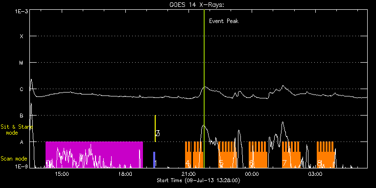 EIS Observation timeline overlay to GOES-Xray curve Code 1" 2" 40" 266" EIS Observations list for this event: STUDY ACRONYM ID DATE OBSERVED DESCRIPTION NOAA# TARGET 0 SK_CH_DIAG_320x384 | 34961 | 2013/07/09 14:13:57 | HOP81 south pole minotoring | | Coronal Hole TIMELINE ID DATE OBSERVED FITS FILE XCEN (+W/-E) YCEN (+N/-S) DUR ----------------------------------------------------------------------------------------------------------------- 34961 | 2013/07/09 14:13:57.000 | eis_l0_20130709_141357.fits.gz | -7.69 | -962.31 | 4h35m37s 1 PRY_slot_contextLITE | 34962 | 2013/07/09 19:20:35 | EIS pointing monitoring | | Active Region TIMELINE ID DATE OBSERVED FITS FILE XCEN (+W/-E) YCEN (+N/-S) DUR ----------------------------------------------------------------------------------------------------------------- 34962 | 2013/07/09 19:20:35.000 | eis_l0_20130709_192035.fits.gz | -15.29 | -0.27 | 2m56s 2 Alignment_266 | 34963 | 2013/07/09 19:23:49 | EIS pointing monitoring | | Quiet Sun TIMELINE ID DATE OBSERVED FITS FILE XCEN (+W/-E) YCEN (+N/-S) DUR ----------------------------------------------------------------------------------------------------------------- 34963 | 2013/07/09 19:23:49.000 | eis_l0_20130709_192349.fits.gz | -132.57 | -0.50 | 1m22s 3 XRT_synop_AIA | 34964 | 2013/07/09 19:25:56 | EIS pointing monitoring | | Quiet Sun TIMELINE ID DATE OBSERVED FITS FILE XCEN (+W/-E) YCEN (+N/-S) DUR ----------------------------------------------------------------------------------------------------------------- 34964 | 2013/07/09 19:25:56.000 | eis_l0_20130709_192556.fits.gz | -132.57 | -0.50 | 10s 4 HH_Flare_162x152 | 34977 | 2013/07/09 20:50:20 | Flare Observations | 1785 | Flare TIMELINE ID DATE OBSERVED FITS FILE XCEN (+W/-E) YCEN (+N/-S) DUR ----------------------------------------------------------------------------------------------------------------- 34977 | 2013/07/09 20:50:20.000 | eis_l0_20130709_205020.fits.gz | 420.74 | -226.82 | 4m11s 34977 | 2013/07/09 20:54:34.000 | eis_l0_20130709_205434.fits.gz | 421.28 | -226.89 | 4m10s 34977 | 2013/07/09 20:58:47.000 | eis_l0_20130709_205847.fits.gz | 421.82 | -226.82 | 4m10s 34977 | 2013/07/09 21:03:00.000 | eis_l0_20130709_210300.fits.gz | 422.28 | -226.82 | 4m11s 34977 | 2013/07/09 21:07:14.000 | eis_l0_20130709_210714.fits.gz | 422.90 | -226.89 | 17s 34977 | 2013/07/09 21:12:56.000 | eis_l0_20130709_211256.fits.gz | 423.60 | -226.74 | 2m42s 34977 | 2013/07/09 21:15:40.000 | eis_l0_20130709_211540.fits.gz | 423.98 | -226.82 | 4m11s 34977 | 2013/07/09 21:19:54.000 | eis_l0_20130709_211954.fits.gz | 424.52 | -226.74 | 4m11s 34977 | 2013/07/09 21:24:07.000 | eis_l0_20130709_212407.fits.gz | 424.99 | -226.82 | 4m11s 34977 | 2013/07/09 21:28:21.000 | eis_l0_20130709_212821.fits.gz | 425.37 | -226.74 | 4m10s 34977 | 2013/07/09 21:32:34.000 | eis_l0_20130709_213234.fits.gz | 426.22 | -226.74 | 4m11s 34977 | 2013/07/09 21:36:48.000 | eis_l0_20130709_213648.fits.gz | 426.76 | -226.82 | 4m10s 5 HH_Flare_162x152 | 34978 | 2013/07/09 22:25:40 | Flare Observations | 1785 | Flare TIMELINE ID DATE OBSERVED FITS FILE XCEN (+W/-E) YCEN (+N/-S) DUR ----------------------------------------------------------------------------------------------------------------- 34978 | 2013/07/09 22:25:40.000 | eis_l0_20130709_222540.fits.gz | 433.02 | -226.43 | 4m11s 34978 | 2013/07/09 22:29:54.000 | eis_l0_20130709_222954.fits.gz | 433.56 | -226.43 | 4m11s 34978 | 2013/07/09 22:34:07.000 | eis_l0_20130709_223407.fits.gz | 434.26 | -226.43 | 4m11s 34978 | 2013/07/09 22:38:21.000 | eis_l0_20130709_223821.fits.gz | 434.64 | -226.51 | 4m11s 34978 | 2013/07/09 22:42:34.000 | eis_l0_20130709_224234.fits.gz | 435.18 | -226.43 | 4m11s 34978 | 2013/07/09 22:46:48.000 | eis_l0_20130709_224648.fits.gz | 435.72 | -226.43 | 4m10s 34978 | 2013/07/09 22:51:01.000 | eis_l0_20130709_225101.fits.gz | 436.19 | -226.27 | 4m11s 34978 | 2013/07/09 22:55:14.000 | eis_l0_20130709_225514.fits.gz | 436.88 | -226.43 | 4m11s 34978 | 2013/07/09 22:59:28.000 | eis_l0_20130709_225928.fits.gz | 437.35 | -226.35 | 4m11s 34978 | 2013/07/09 23:03:41.000 | eis_l0_20130709_230341.fits.gz | 437.81 | -226.27 | 4m11s 34978 | 2013/07/09 23:07:55.000 | eis_l0_20130709_230755.fits.gz | 438.43 | -226.35 | 4m10s 34978 | 2013/07/09 23:12:08.000 | eis_l0_20130709_231208.fits.gz | 438.97 | -226.27 | 4m11s 6 HH_Flare_162x152 | 34979 | 2013/07/09 23:51:43 | Flare Observations | 1785 | Flare TIMELINE ID DATE OBSERVED FITS FILE XCEN (+W/-E) YCEN (+N/-S) DUR ----------------------------------------------------------------------------------------------------------------- 34979 | 2013/07/09 23:51:43.000 | eis_l0_20130709_235143.fits.gz | 443.91 | -225.81 | 4m11s 34979 | 2013/07/09 23:55:57.000 | eis_l0_20130709_235557.fits.gz | 444.53 | -226.12 | 4m11s 34979 | 2013/07/10 00:00:11.000 | eis_l0_20130710_000011.fits.gz | 445.07 | -226.04 | 4m10s 34979 | 2013/07/10 00:04:24.000 | eis_l0_20130710_000424.fits.gz | 445.69 | -226.12 | 4m10s 34979 | 2013/07/10 00:08:37.000 | eis_l0_20130710_000837.fits.gz | 446.15 | -226.04 | 4m11s 34979 | 2013/07/10 00:12:51.000 | eis_l0_20130710_001251.fits.gz | 446.69 | -225.96 | 4m10s 34979 | 2013/07/10 00:17:04.000 | eis_l0_20130710_001704.fits.gz | 447.23 | -226.12 | 4m11s 34979 | 2013/07/10 00:21:18.000 | eis_l0_20130710_002118.fits.gz | 447.77 | -225.96 | 4m10s 34979 | 2013/07/10 00:25:31.000 | eis_l0_20130710_002531.fits.gz | 448.32 | -225.89 | 4m10s 34979 | 2013/07/10 00:29:44.000 | eis_l0_20130710_002944.fits.gz | 448.93 | -225.96 | 4m11s 34979 | 2013/07/10 00:33:58.000 | eis_l0_20130710_003358.fits.gz | 449.47 | -225.96 | 4m10s 34979 | 2013/07/10 00:38:11.000 | eis_l0_20130710_003811.fits.gz | 449.94 | -225.96 | 4m11s 7 HH_Flare_162x152 | 34980 | 2013/07/10 01:26:13 | Flare Observations | 1785 | Flare TIMELINE ID DATE OBSERVED FITS FILE XCEN (+W/-E) YCEN (+N/-S) DUR ----------------------------------------------------------------------------------------------------------------- 34980 | 2013/