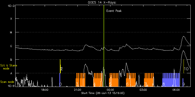 EIS Observation timeline overlay to GOES-Xray curve Code 1" 2" 40" 266" EIS Observations list for this event: STUDY ACRONYM ID DATE OBSERVED DESCRIPTION NOAA# TARGET 0 PRY_slot_contextLITE | 34962 | 2013/07/09 19:20:35 | EIS pointing monitoring | | Active Region TIMELINE ID DATE OBSERVED FITS FILE XCEN (+W/-E) YCEN (+N/-S) DUR ----------------------------------------------------------------------------------------------------------------- 34962 | 2013/07/09 19:20:35.000 | eis_l0_20130709_192035.fits.gz | -15.29 | -0.27 | 2m56s 1 Alignment_266 | 34963 | 2013/07/09 19:23:49 | EIS pointing monitoring | | Quiet Sun TIMELINE ID DATE OBSERVED FITS FILE XCEN (+W/-E) YCEN (+N/-S) DUR ----------------------------------------------------------------------------------------------------------------- 34963 | 2013/07/09 19:23:49.000 | eis_l0_20130709_192349.fits.gz | -132.57 | -0.50 | 1m22s 2 XRT_synop_AIA | 34964 | 2013/07/09 19:25:56 | EIS pointing monitoring | | Quiet Sun TIMELINE ID DATE OBSERVED FITS FILE XCEN (+W/-E) YCEN (+N/-S) DUR ----------------------------------------------------------------------------------------------------------------- 34964 | 2013/07/09 19:25:56.000 | eis_l0_20130709_192556.fits.gz | -132.57 | -0.50 | 10s 3 HH_Flare_162x152 | 34977 | 2013/07/09 20:50:20 | Flare Observations | 1785 | Flare TIMELINE ID DATE OBSERVED FITS FILE XCEN (+W/-E) YCEN (+N/-S) DUR ----------------------------------------------------------------------------------------------------------------- 34977 | 2013/07/09 20:50:20.000 | eis_l0_20130709_205020.fits.gz | 420.74 | -226.82 | 4m11s 34977 | 2013/07/09 20:54:34.000 | eis_l0_20130709_205434.fits.gz | 421.28 | -226.89 | 4m10s 34977 | 2013/07/09 20:58:47.000 | eis_l0_20130709_205847.fits.gz | 421.82 | -226.82 | 4m10s 34977 | 2013/07/09 21:03:00.000 | eis_l0_20130709_210300.fits.gz | 422.28 | -226.82 | 4m11s 34977 | 2013/07/09 21:07:14.000 | eis_l0_20130709_210714.fits.gz | 422.90 | -226.89 | 17s 34977 | 2013/07/09 21:12:56.000 | eis_l0_20130709_211256.fits.gz | 423.60 | -226.74 | 2m42s 34977 | 2013/07/09 21:15:40.000 | eis_l0_20130709_211540.fits.gz | 423.98 | -226.82 | 4m11s 34977 | 2013/07/09 21:19:54.000 | eis_l0_20130709_211954.fits.gz | 424.52 | -226.74 | 4m11s 34977 | 2013/07/09 21:24:07.000 | eis_l0_20130709_212407.fits.gz | 424.99 | -226.82 | 4m11s 34977 | 2013/07/09 21:28:21.000 | eis_l0_20130709_212821.fits.gz | 425.37 | -226.74 | 4m10s 34977 | 2013/07/09 21:32:34.000 | eis_l0_20130709_213234.fits.gz | 426.22 | -226.74 | 4m11s 34977 | 2013/07/09 21:36:48.000 | eis_l0_20130709_213648.fits.gz | 426.76 | -226.82 | 4m10s 4 HH_Flare_162x152 | 34978 | 2013/07/09 22:25:40 | Flare Observations | 1785 | Flare TIMELINE ID DATE OBSERVED FITS FILE XCEN (+W/-E) YCEN (+N/-S) DUR ----------------------------------------------------------------------------------------------------------------- 34978 | 2013/07/09 22:25:40.000 | eis_l0_20130709_222540.fits.gz | 433.02 | -226.43 | 4m11s 34978 | 2013/07/09 22:29:54.000 | eis_l0_20130709_222954.fits.gz | 433.56 | -226.43 | 4m11s 34978 | 2013/07/09 22:34:07.000 | eis_l0_20130709_223407.fits.gz | 434.26 | -226.43 | 4m11s 34978 | 2013/07/09 22:38:21.000 | eis_l0_20130709_223821.fits.gz | 434.64 | -226.51 | 4m11s 34978 | 2013/07/09 22:42:34.000 | eis_l0_20130709_224234.fits.gz | 435.18 | -226.43 | 4m11s 34978 | 2013/07/09 22:46:48.000 | eis_l0_20130709_224648.fits.gz | 435.72 | -226.43 | 4m10s 34978 | 2013/07/09 22:51:01.000 | eis_l0_20130709_225101.fits.gz | 436.19 | -226.27 | 4m11s 34978 | 2013/07/09 22:55:14.000 | eis_l0_20130709_225514.fits.gz | 436.88 | -226.43 | 4m11s 34978 | 2013/07/09 22:59:28.000 | eis_l0_20130709_225928.fits.gz | 437.35 | -226.35 | 4m11s 34978 | 2013/07/09 23:03:41.000 | eis_l0_20130709_230341.fits.gz | 437.81 | -226.27 | 4m11s 34978 | 2013/07/09 23:07:55.000 | eis_l0_20130709_230755.fits.gz | 438.43 | -226.35 | 4m10s 34978 | 2013/07/09 23:12:08.000 | eis_l0_20130709_231208.fits.gz | 438.97 | -226.27 | 4m11s 5 HH_Flare_162x152 | 34979 | 2013/07/09 23:51:43 | Flare Observations | 1785 | Flare TIMELINE ID DATE OBSERVED FITS FILE XCEN (+W/-E) YCEN (+N/-S) DUR ----------------------------------------------------------------------------------------------------------------- 34979 | 2013/07/09 23:51:43.000 | eis_l0_20130709_235143.fits.gz | 443.91 | -225.81 | 4m11s 34979 | 2013/07/09 23:55:57.000 | eis_l0_20130709_235557.fits.gz | 444.53 | -226.12 | 4m11s 34979 | 2013/07/10 00:00:11.000 | eis_l0_20130710_000011.fits.gz | 445.07 | -226.04 | 4m10s 34979 | 2013/07/10 00:04:24.000 | eis_l0_20130710_000424.fits.gz | 445.69 | -226.12 | 4m10s 34979 | 2013/07/10 00:08:37.000 | eis_l0_20130710_000837.fits.gz | 446.15 | -226.04 | 4m11s 34979 | 2013/07/10 00:12:51.000 | eis_l0_20130710_001251.fits.gz | 446.69 | -225.96 | 4m10s 34979 | 2013/07/10 00:17:04.000 | eis_l0_20130710_001704.fits.gz | 447.23 | -226.12 | 4m11s 34979 | 2013/07/10 00:21:18.000 | eis_l0_20130710_002118.fits.gz | 447.77 | -225.96 | 4m10s 34979 | 2013/07/10 00:25:31.000 | eis_l0_20130710_002531.fits.gz | 448.32 | -225.89 | 4m10s 34979 | 2013/07/10 00:29:44.000 | eis_l0_20130710_002944.fits.gz | 448.93 | -225.96 | 4m11s 34979 | 2013/07/10 00:33:58.000 | eis_l0_20130710_003358.fits.gz | 449.47 | -225.96 | 4m10s 34979 | 2013/07/10 00:38:11.000 | eis_l0_20130710_003811.fits.gz | 449.94 | -225.96 | 4m11s 6 HH_Flare_162x152 | 34980 | 2013/07/10 01:26:13 | Flare Observations | 1785 | Flare TIMELINE ID DATE OBSERVED FITS FILE XCEN (+W/-E) YCEN (+N/-S) DUR ----------------------------------------------------------------------------------------------------------------- 34980 | 2013/07/10 01:26:13.000 | eis_l0_20130710_012613.fits.gz | 456.04 | -225.73 | 4m11s 34980 | 2013/07/10 01:30:26.000 | eis_l0_20130710_013026.fits.gz | 456.43 | -225.42 | 4m11s 34980 | 2013/07/10 01:34:40.000 | eis_l0_20130710_013440.fits.gz | 457.04 | -225.66 | 4m10s 34980 | 2013/07/10 01:38:53.000 | eis_l0_20130710_013853.fits.gz | 457.66 | -225.58 | 4m11s 34980 | 2013/07/1