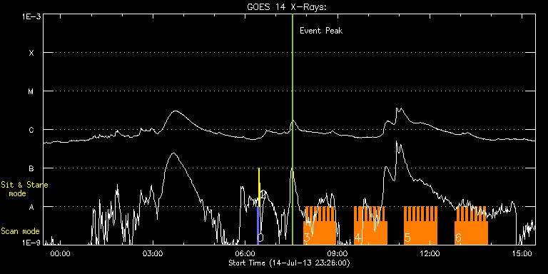 EIS Observation timeline overlay to GOES-Xray curve Code 1" 2" 40" 266" EIS Observations list for this event: STUDY ACRONYM ID DATE OBSERVED DESCRIPTION NOAA# TARGET 0 PRY_slot_contextLITE | 35058 | 2013/07/15 06:23:20 | Change of EIS pointing and alignment w | 1792 | Active Region TIMELINE ID DATE OBSERVED FITS FILE XCEN (+W/-E) YCEN (+N/-S) DUR ----------------------------------------------------------------------------------------------------------------- 35058 | 2013/07/15 06:23:20.000 | eis_l0_20130715_062320.fits.gz | -15.21 | -0.65 | 2m55s 1 Alignment_266 | 35059 | 2013/07/15 06:26:34 | Change of EIS pointing and alignment w | 1792 | Quiet Sun TIMELINE ID DATE OBSERVED FITS FILE XCEN (+W/-E) YCEN (+N/-S) DUR ----------------------------------------------------------------------------------------------------------------- 35059 | 2013/07/15 06:26:34.000 | eis_l0_20130715_062634.fits.gz | -132.57 | -0.65 | 1m22s 2 XRT_synop_AIA | 35060 | 2013/07/15 06:28:41 | Change of EIS pointing and alignment w | 1792 | Quiet Sun TIMELINE ID DATE OBSERVED FITS FILE XCEN (+W/-E) YCEN (+N/-S) DUR ----------------------------------------------------------------------------------------------------------------- 35060 | 2013/07/15 06:28:41.000 | eis_l0_20130715_062841.fits.gz | -132.57 | -0.50 | 10s 3 HH_Flare_162x152 | 35069 | 2013/07/15 07:53:19 | Flare Hunting/Observations | 1787 | Flare TIMELINE ID DATE OBSERVED FITS FILE XCEN (+W/-E) YCEN (+N/-S) DUR ----------------------------------------------------------------------------------------------------------------- 35069 | 2013/07/15 07:53:19.000 | eis_l0_20130715_075319.fits.gz | 898.19 | -233.56 | 4m11s 35069 | 2013/07/15 07:57:33.000 | eis_l0_20130715_075733.fits.gz | 898.19 | -233.56 | 4m11s 35069 | 2013/07/15 08:01:47.000 | eis_l0_20130715_080147.fits.gz | 898.19 | -233.63 | 4m10s 35069 | 2013/07/15 08:06:00.000 | eis_l0_20130715_080600.fits.gz | 898.27 | -233.63 | 4m11s 35069 | 2013/07/15 08:10:13.000 | eis_l0_20130715_081013.fits.gz | 898.27 | -233.71 | 4m11s 35069 | 2013/07/15 08:14:27.000 | eis_l0_20130715_081427.fits.gz | 898.27 | -233.71 | 4m11s 35069 | 2013/07/15 08:18:40.000 | eis_l0_20130715_081840.fits.gz | 898.27 | -233.63 | 4m11s 35069 | 2013/07/15 08:22:54.000 | eis_l0_20130715_082254.fits.gz | 898.19 | -233.79 | 4m10s 35069 | 2013/07/15 08:27:07.000 | eis_l0_20130715_082707.fits.gz | 898.19 | -233.79 | 4m11s 35069 | 2013/07/15 08:31:21.000 | eis_l0_20130715_083121.fits.gz | 898.34 | -233.63 | 4m10s 35069 | 2013/07/15 08:35:34.000 | eis_l0_20130715_083534.fits.gz | 898.19 | -233.63 | 4m11s 35069 | 2013/07/15 08:39:47.000 | eis_l0_20130715_083947.fits.gz | 898.27 | -233.71 | 4m11s 35069 | 2013/07/15 08:44:01.000 | eis_l0_20130715_084401.fits.gz | 898.11 | -233.71 | 4m10s 35069 | 2013/07/15 08:48:14.000 | eis_l0_20130715_084814.fits.gz | 898.27 | -233.71 | 4m11s 35069 | 2013/07/15 08:52:27.000 | eis_l0_20130715_085227.fits.gz | 898.19 | -233.63 | 4m11s 4 HH_Flare_162x152 | 35070 | 2013/07/15 09:32:39 | Flare Hunting/Observations | 1787 | Flare TIMELINE ID DATE OBSERVED FITS FILE XCEN (+W/-E) YCEN (+N/-S) DUR ----------------------------------------------------------------------------------------------------------------- 35070 | 2013/07/15 09:32:39.000 | eis_l0_20130715_093239.fits.gz | 898.27 | -233.79 | 4m11s 35070 | 2013/07/15 09:36:53.000 | eis_l0_20130715_093653.fits.gz | 898.27 | -233.63 | 4m10s 35070 | 2013/07/15 09:41:06.000 | eis_l0_20130715_094106.fits.gz | 898.19 | -233.63 | 4m11s 35070 | 2013/07/15 09:45:19.000 | eis_l0_20130715_094519.fits.gz | 898.19 | -233.71 | 2m28s 35070 | 2013/07/15 09:45:52.000 | eis_l0_20130715_094552.fits.gz | 898.27 | -233.87 | 3m38s 35070 | 2013/07/15 09:49:33.000 | eis_l0_20130715_094933.fits.gz | 898.19 | -233.63 | 4m10s 35070 | 2013/07/15 09:53:46.000 | eis_l0_20130715_095346.fits.gz | 898.34 | -233.79 | 4m11s 35070 | 2013/07/15 09:58:00.000 | eis_l0_20130715_095800.fits.gz | 898.27 | -233.79 | 4m10s 35070 | 2013/07/15 10:02:13.000 | eis_l0_20130715_100213.fits.gz | 898.19 | -233.71 | 4m10s 35070 | 2013/07/15 10:06:26.000 | eis_l0_20130715_100626.fits.gz | 898.19 | -233.71 | 4m11s 35070 | 2013/07/15 10:10:40.000 | eis_l0_20130715_101040.fits.gz | 898.19 | -233.56 | 4m10s 35070 | 2013/07/15 10:14:53.000 | eis_l0_20130715_101453.fits.gz | 898.27 | -233.71 | 4m11s 35070 | 2013/07/15 10:19:07.000 | eis_l0_20130715_101907.fits.gz | 898.27 | -233.71 | 4m10s 35070 | 2013/07/15 10:23:20.000 | eis_l0_20130715_102320.fits.gz | 898.27 | -233.63 | 4m11s 35070 | 2013/07/15 10:27:34.000 | eis_l0_20130715_102734.fits.gz | 898.11 | -233.71 | 4m10s 35070 | 2013/07/15 10:31:47.000 | eis_l0_20130715_103147.fits.gz | 898.27 | -233.79 | 4m11s 5 HH_Flare_162x152 | 35071 | 2013/07/15 11:10:13 | Flare Hunting/Observations | 1787 | Flare TIMELINE ID DATE OBSERVED FITS FILE XCEN (+W/-E) YCEN (+N/-S) DUR ----------------------------------------------------------------------------------------------------------------- 35071 | 2013/07/15 11:10:13.000 | eis_l0_20130715_111013.fits.gz | 898.19 | -233.71 | 4m11s 35071 | 2013/07/15 11:14:27.000 | eis_l0_20130715_111427.fits.gz | 898.19 | -233.63 | 4m10s 35071 | 2013/07/15 11:18:40.000 | eis_l0_20130715_111840.fits.gz | 898.34 | -233.71 | 4m10s 35071 | 2013/07/15 11:22:53.000 | eis_l0_20130715_112253.fits.gz | 898.27 | -233.87 | 4m11s 35071 | 2013/07/15 11:27:07.000 | eis_l0_20130715_112707.fits.gz | 898.27 | -233.79 | 4m10s 35071 | 2013/07/15 11:31:20.000 | eis_l0_20130715_113120.fits.gz | 898.19 | -233.71 | 4m11s 35071 | 2013/07/15 11:35:34.000 | eis_l0_20130715_113534.fits.gz | 898.34 | -233.87 | 4m10s 35071 | 2013/07/15 11:39:47.000 | eis_l0_20130715_113947.fits.gz | 898.19 | -233.71 | 4m10s 35071 | 2013/07/15 11:44:00.000 | eis_l0_20130715_114400.fits.gz | 898.11 | -233.71 | 4m11s 35071 | 2013/07/15 11:48:14.000 | eis_l0_20130715_114814.fits.gz | 898.27 | -233.63 | 4m10s 35071 | 2013/07/15 11:52:27.000 | eis_l0_20130715_115227.fits.gz | 898.19 | -233.71 | 4m11s 35071 | 2013