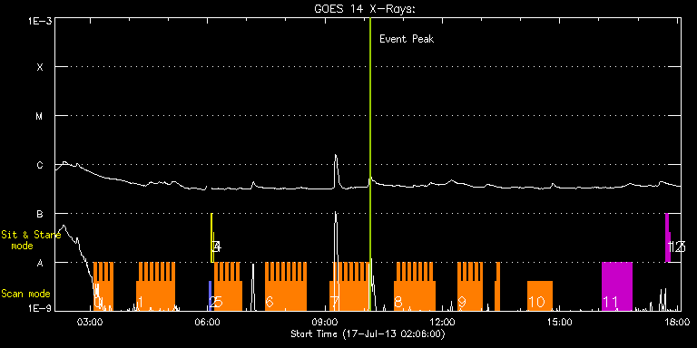 EIS Observation timeline overlay to GOES-Xray curve Code 1" 2" 40" 266" EIS Observations list for this event: STUDY ACRONYM ID DATE OBSERVED DESCRIPTION NOAA# TARGET 0 HH_Flare_162x152 | 35124 | 2013/07/17 03:05:27 | Flare monitoring | 1791 | Flare TIMELINE ID DATE OBSERVED FITS FILE XCEN (+W/-E) YCEN (+N/-S) DUR ----------------------------------------------------------------------------------------------------------------- 35124 | 2013/07/17 03:05:27.000 | eis_l0_20130717_030527.fits.gz | 106.25 | -296.36 | 4m11s 35124 | 2013/07/17 03:09:40.000 | eis_l0_20130717_030940.fits.gz | 106.71 | -296.20 | 4m11s 35124 | 2013/07/17 03:13:54.000 | eis_l0_20130717_031354.fits.gz | 107.41 | -296.28 | 4m10s 35124 | 2013/07/17 03:18:07.000 | eis_l0_20130717_031807.fits.gz | 108.02 | -296.36 | 4m11s 35124 | 2013/07/17 03:22:21.000 | eis_l0_20130717_032221.fits.gz | 108.56 | -296.13 | 4m10s 35124 | 2013/07/17 03:26:34.000 | eis_l0_20130717_032634.fits.gz | 109.26 | -296.13 | 4m11s 35124 | 2013/07/17 03:30:47.000 | eis_l0_20130717_033047.fits.gz | 109.96 | -296.20 | 4m11s 1 HH_Flare_162x152 | 35106 | 2013/07/17 04:11:13 | Flare monitoring | 1791 | Flare TIMELINE ID DATE OBSERVED FITS FILE XCEN (+W/-E) YCEN (+N/-S) DUR ----------------------------------------------------------------------------------------------------------------- 35106 | 2013/07/17 04:11:13.000 | eis_l0_20130717_041113.fits.gz | 115.75 | -296.05 | 4m11s 35106 | 2013/07/17 04:15:27.000 | eis_l0_20130717_041527.fits.gz | 116.44 | -296.13 | 4m11s 35106 | 2013/07/17 04:19:40.000 | eis_l0_20130717_041940.fits.gz | 117.06 | -296.13 | 4m11s 35106 | 2013/07/17 04:23:54.000 | eis_l0_20130717_042354.fits.gz | 117.68 | -296.13 | 4m11s 35106 | 2013/07/17 04:28:08.000 | eis_l0_20130717_042808.fits.gz | 118.22 | -296.05 | 4m11s 35106 | 2013/07/17 04:32:21.000 | eis_l0_20130717_043221.fits.gz | 118.92 | -296.28 | 4m11s 35106 | 2013/07/17 04:36:35.000 | eis_l0_20130717_043635.fits.gz | 119.61 | -296.20 | 4m10s 35106 | 2013/07/17 04:40:48.000 | eis_l0_20130717_044048.fits.gz | 120.15 | -296.20 | 4m11s 35106 | 2013/07/17 04:45:02.000 | eis_l0_20130717_044502.fits.gz | 120.69 | -296.28 | 4m10s 35106 | 2013/07/17 04:49:15.000 | eis_l0_20130717_044915.fits.gz | 121.31 | -296.05 | 4m11s 35106 | 2013/07/17 04:53:28.000 | eis_l0_20130717_045328.fits.gz | 121.93 | -296.13 | 4m11s 35106 | 2013/07/17 04:57:42.000 | eis_l0_20130717_045742.fits.gz | 122.62 | -296.20 | 4m10s 35106 | 2013/07/17 05:01:55.000 | eis_l0_20130717_050155.fits.gz | 123.24 | -296.13 | 4m11s 35106 | 2013/07/17 05:06:08.000 | eis_l0_20130717_050608.fits.gz | 123.86 | -296.13 | 4m11s 2 PRY_slot_contextLITE | 35096 | 2013/07/17 06:02:20 | Change of EIS pointing and aligment wi | | Active Region TIMELINE ID DATE OBSERVED FITS FILE XCEN (+W/-E) YCEN (+N/-S) DUR ----------------------------------------------------------------------------------------------------------------- 35096 | 2013/07/17 06:02:20.000 | eis_l0_20130717_060220.fits.gz | -18.86 | -39.27 | 2m56s 3 Alignment_266 | 35097 | 2013/07/17 06:05:35 | Change of EIS pointing and alignment w | | Quiet Sun TIMELINE ID DATE OBSERVED FITS FILE XCEN (+W/-E) YCEN (+N/-S) DUR ----------------------------------------------------------------------------------------------------------------- 35097 | 2013/07/17 06:05:35.000 | eis_l0_20130717_060535.fits.gz | -136.06 | -39.35 | 1m22s 4 XRT_synop_AIA | 35098 | 2013/07/17 06:08:50 | Change of EIS pointing and alignment w | | Quiet Sun TIMELINE ID DATE OBSERVED FITS FILE XCEN (+W/-E) YCEN (+N/-S) DUR ----------------------------------------------------------------------------------------------------------------- 35098 | 2013/07/17 06:08:50.000 | eis_l0_20130717_060850.fits.gz | -135.98 | -39.58 | 10s 5 HH_Flare_162x152 | 35107 | 2013/07/17 06:10:20 | Flare monitoring | 1791 | Flare TIMELINE ID DATE OBSERVED FITS FILE XCEN (+W/-E) YCEN (+N/-S) DUR ----------------------------------------------------------------------------------------------------------------- 35107 | 2013/07/17 06:10:20.000 | eis_l0_20130717_061020.fits.gz | 131.35 | -230.47 | 4m11s 35107 | 2013/07/17 06:14:34.000 | eis_l0_20130717_061434.fits.gz | 133.90 | -296.13 | 4m11s 35107 | 2013/07/17 06:18:47.000 | eis_l0_20130717_061847.fits.gz | 134.52 | -296.13 | 4m11s 35107 | 2013/07/17 06:23:01.000 | eis_l0_20130717_062301.fits.gz | 135.06 | -296.28 | 4m10s 35107 | 2013/07/17 06:27:14.000 | eis_l0_20130717_062714.fits.gz | 135.68 | -296.20 | 4m11s 35107 | 2013/07/17 06:31:28.000 | eis_l0_20130717_063128.fits.gz | 136.22 | -295.97 | 4m10s 35107 | 2013/07/17 06:35:41.000 | eis_l0_20130717_063541.fits.gz | 136.91 | -295.97 | 4m11s 35107 | 2013/07/17 06:39:54.000 | eis_l0_20130717_063954.fits.gz | 137.53 | -296.05 | 4m12s 35107 | 2013/07/17 06:44:09.000 | eis_l0_20130717_064409.fits.gz | 138.23 | -296.05 | 4m10s 35107 | 2013/07/17 06:48:22.000 | eis_l0_20130717_064822.fits.gz | 138.77 | -296.13 | 4m10s 6 HH_Flare_162x152 | 35108 | 2013/07/17 07:28:40 | Flare monitoring | 1791 | Flare TIMELINE ID DATE OBSERVED FITS FILE XCEN (+W/-E) YCEN (+N/-S) DUR ----------------------------------------------------------------------------------------------------------------- 35108 | 2013/07/17 07:28:40.000 | eis_l0_20130717_072840.fits.gz | 144.56 | -295.74 | 4m11s 35108 | 2013/07/17 07:32:54.000 | eis_l0_20130717_073254.fits.gz | 145.26 | -295.89 | 4m10s 35108 | 2013/07/17 07:37:07.000 | eis_l0_20130717_073707.fits.gz | 145.88 | -295.89 | 4m11s 35108 | 2013/07/17 07:41:20.000 | eis_l0_20130717_074120.fits.gz | 146.42 | -295.82 | 4m11s 35108 | 2013/07/17 07:45:34.000 | eis_l0_20130717_074534.fits.gz | 147.11 | -296.05 | 4m10s 35108 | 2013/07/17 07:49:47.000 | eis_l0_20130717_074947.fits.gz | 147.65 | -295.97 | 4m11s 35108 | 2013/07/17 07:54:01.000 | eis_l0_20130717_075401.fits.gz | 148.35 | -296.13 | 4m10s 35108 | 2013/07/17 07:58:14.000 | eis_l0_20130717_075814.fits.gz | 149.04 | -296.05 | 4m11s 35108 | 2013/07/17 08:02:28.000 | eis_l0_20130717_080228.fits.gz | 