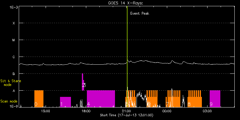 EIS Observation timeline overlay to GOES-Xray curve Code 1" 2" 40" 266" EIS Observations list for this event: STUDY ACRONYM ID DATE OBSERVED DESCRIPTION NOAA# TARGET 0 cam_sigmoid_study_v1 | 35112 | 2013/07/17 14:10:14 | Active region studies | 1791 | Active Region TIMELINE ID DATE OBSERVED FITS FILE XCEN (+W/-E) YCEN (+N/-S) DUR ----------------------------------------------------------------------------------------------------------------- 35112 | 2013/07/17 14:10:14.000 | eis_l0_20130717_141014.fits.gz | 203.55 | -295.35 | 38m52s 1 HPW021_VEL_120x512v2 | 35113 | 2013/07/17 16:04:26 | Active region studies | | Active Region TIMELINE ID DATE OBSERVED FITS FILE XCEN (+W/-E) YCEN (+N/-S) DUR ----------------------------------------------------------------------------------------------------------------- 35113 | 2013/07/17 16:04:26.000 | eis_l0_20130717_160426.fits.gz | 219.67 | -295.35 | 46m53s 2 regcal071 | 35099 | 2013/07/17 17:42:41 | Dark exposures, CCD bottom rows (100s | | Engineering TIMELINE ID DATE OBSERVED FITS FILE XCEN (+W/-E) YCEN (+N/-S) DUR ----------------------------------------------------------------------------------------------------------------- 35099 | 2013/07/17 17:42:41.000 | eis_l0_20130717_174241.fits.gz | 248.73 | -599.97 | 3m22s 3 regcal072 | 35100 | 2013/07/17 17:46:30 | Dark exposures, top CCD rows (100s exp | | Engineering TIMELINE ID DATE OBSERVED FITS FILE XCEN (+W/-E) YCEN (+N/-S) DUR ----------------------------------------------------------------------------------------------------------------- 35100 | 2013/07/17 17:46:30.000 | eis_l0_20130717_174630.fits.gz | 249.34 | -89.12 | 3m22s 4 HPW021_VEL_240x512v1 | 35114 | 2013/07/17 18:04:40 | Flare monitoring/Active region studies | 1791 | Active Region TIMELINE ID DATE OBSERVED FITS FILE XCEN (+W/-E) YCEN (+N/-S) DUR ----------------------------------------------------------------------------------------------------------------- 35114 | 2013/07/17 18:04:40.000 | eis_l0_20130717_180440.fits.gz | 237.22 | -295.28 | 2h3m47s 5 HH_Flare_162x152 | 35115 | 2013/07/17 20:55:26 | Flare monitoring | 1791 | Flare TIMELINE ID DATE OBSERVED FITS FILE XCEN (+W/-E) YCEN (+N/-S) DUR ----------------------------------------------------------------------------------------------------------------- 35115 | 2013/07/17 20:55:26.000 | eis_l0_20130717_205526.fits.gz | 260.67 | -294.58 | 4m11s 35115 | 2013/07/17 20:59:39.000 | eis_l0_20130717_205939.fits.gz | 261.28 | -294.74 | 4m11s 35115 | 2013/07/17 21:03:53.000 | eis_l0_20130717_210353.fits.gz | 261.90 | -294.74 | 4m10s 35115 | 2013/07/17 21:08:06.000 | eis_l0_20130717_210806.fits.gz | 262.52 | -294.74 | 4m11s 35115 | 2013/07/17 21:12:20.000 | eis_l0_20130717_211220.fits.gz | 262.98 | -294.66 | 4m10s 35115 | 2013/07/17 21:16:33.000 | eis_l0_20130717_211633.fits.gz | 263.60 | -294.74 | 4m11s 35115 | 2013/07/17 21:20:47.000 | eis_l0_20130717_212047.fits.gz | 264.30 | -294.58 | 4m10s 35115 | 2013/07/17 21:25:00.000 | eis_l0_20130717_212500.fits.gz | 264.84 | -294.81 | 4m11s 35115 | 2013/07/17 21:29:14.000 | eis_l0_20130717_212914.fits.gz | 265.45 | -294.66 | 4m10s 35115 | 2013/07/17 21:33:27.000 | eis_l0_20130717_213327.fits.gz | 266.07 | -294.58 | 4m10s 35115 | 2013/07/17 21:37:40.000 | eis_l0_20130717_213740.fits.gz | 266.61 | -294.58 | 4m11s 6 HH_Flare_162x152 | 35116 | 2013/07/17 22:30:40 | Flare monitoring | 1791 | Flare TIMELINE ID DATE OBSERVED FITS FILE XCEN (+W/-E) YCEN (+N/-S) DUR ----------------------------------------------------------------------------------------------------------------- 35116 | 2013/07/17 22:30:40.000 | eis_l0_20130717_223040.fits.gz | 274.11 | -294.58 | 4m11s 35116 | 2013/07/17 22:34:53.000 | eis_l0_20130717_223453.fits.gz | 274.72 | -294.58 | 4m11s 35116 | 2013/07/17 22:39:07.000 | eis_l0_20130717_223907.fits.gz | 275.34 | -294.58 | 4m10s 35116 | 2013/07/17 22:43:20.000 | eis_l0_20130717_224320.fits.gz | 275.88 | -294.50 | 4m11s 35116 | 2013/07/17 22:47:34.000 | eis_l0_20130717_224734.fits.gz | 276.42 | -294.35 | 4m10s 35116 | 2013/07/17 22:51:47.000 | eis_l0_20130717_225147.fits.gz | 276.96 | -294.35 | 4m11s 35116 | 2013/07/17 22:56:00.000 | eis_l0_20130717_225600.fits.gz | 277.66 | -294.43 | 4m11s 35116 | 2013/07/17 23:00:14.000 | eis_l0_20130717_230014.fits.gz | 278.28 | -294.50 | 4m10s 35116 | 2013/07/17 23:04:27.000 | eis_l0_20130717_230427.fits.gz | 278.74 | -294.27 | 4m11s 35116 | 2013/07/17 23:08:41.000 | eis_l0_20130717_230841.fits.gz | 279.51 | -294.43 | 4m10s 35116 | 2013/07/17 23:12:54.000 | eis_l0_20130717_231254.fits.gz | 280.05 | -294.35 | 4m11s 7 HH_Flare_162x152 | 35117 | 2013/07/17 23:55:13 | Flare monitoring | 1791 | Flare TIMELINE ID DATE OBSERVED FITS FILE XCEN (+W/-E) YCEN (+N/-S) DUR ----------------------------------------------------------------------------------------------------------------- 35117 | 2013/07/17 23:55:13.000 | eis_l0_20130717_235513.fits.gz | 285.92 | -294.12 | 4m11s 35117 | 2013/07/18 00:03:40.000 | eis_l0_20130718_000340.fits.gz | 287.16 | -294.12 | 4m10s 35117 | 2013/07/18 00:07:53.000 | eis_l0_20130718_000753.fits.gz | 287.78 | -294.20 | 4m11s 35117 | 2013/07/18 00:12:07.000 | eis_l0_20130718_001207.fits.gz | 288.40 | -294.35 | 4m10s 35117 | 2013/07/18 00:16:20.000 | eis_l0_20130718_001620.fits.gz | 289.02 | -294.27 | 4m11s 35117 | 2013/07/18 00:20:33.000 | eis_l0_20130718_002033.fits.gz | 289.48 | -294.20 | 4m11s 35117 | 2013/07/18 00:24:47.000 | eis_l0_20130718_002447.fits.gz | 290.10 | -294.20 | 4m10s 35117 | 2013/07/18 00:29:00.000 | eis_l0_20130718_002900.fits.gz | 290.71 | -294.20 | 4m11s 35117 | 2013/07/18 00:33:14.000 | eis_l0_20130718_003314.fits.gz | 291.33 | -294.27 | 4m10s 35117 | 2013/07/18 00:37:27.000 | eis_l0_20130718_003727.fits.gz | 291.87 | -294.20 | 4m11s 35117 | 2013/07/18 00:41:40.000 | eis_l0_20130718_004140.fits.gz | 292.41 | -294.20 | 4m11s 35117 | 2013/07/18 00:45:54.000 | eis_l0_20130718_004554.fits.gz | 293.11 | -294.12 | 4m11s 35117 | 2013/07/18 00:50:07.000 | eis_l0_2013
