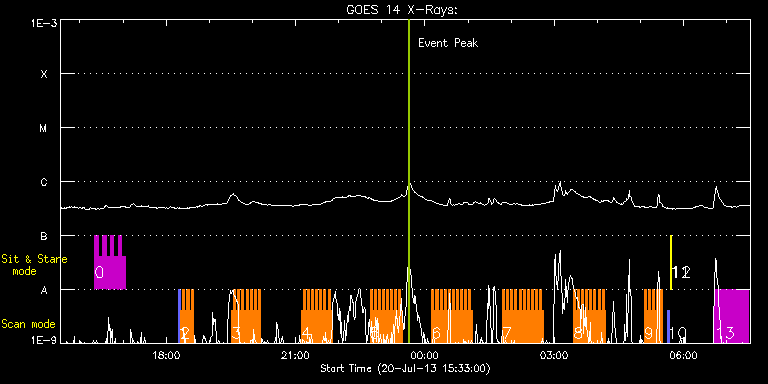 EIS Observation timeline overlay to GOES-Xray curve Code 1" 2" 40" 266" EIS Observations list for this event: STUDY ACRONYM ID DATE OBSERVED DESCRIPTION NOAA# TARGET 0 HPW023_FULLCCD_300s | 35150 | 2013/07/20 16:20:28 | Off-limb, quiet Sun observations for s | | Quiet Sun TIMELINE ID DATE OBSERVED FITS FILE XCEN (+W/-E) YCEN (+N/-S) DUR ----------------------------------------------------------------------------------------------------------------- 35150 | 2013/07/20 16:20:28.000 | eis_l0_20130720_162028.fits.gz | 964.95 | -0.42 | 5m 35150 | 2013/07/20 16:25:56.000 | eis_l0_20130720_162556.fits.gz | 964.87 | -0.35 | 5m 35150 | 2013/07/20 16:31:23.000 | eis_l0_20130720_163123.fits.gz | 964.87 | -0.50 | 5m 35150 | 2013/07/20 16:36:50.000 | eis_l0_20130720_163650.fits.gz | 964.87 | -0.42 | 5m 35150 | 2013/07/20 16:42:17.000 | eis_l0_20130720_164217.fits.gz | 964.87 | -0.42 | 5m 35150 | 2013/07/20 16:47:45.000 | eis_l0_20130720_164745.fits.gz | 964.95 | -0.42 | 5m 35150 | 2013/07/20 16:53:12.000 | eis_l0_20130720_165312.fits.gz | 964.95 | -0.58 | 5m 35150 | 2013/07/20 16:58:39.000 | eis_l0_20130720_165839.fits.gz | 964.95 | -0.50 | 5m 1 PRY_slot_context_v3 | 35160 | 2013/07/20 18:17:04 | Context image for > 10 hour flare hunt | 1793 | Active Region TIMELINE ID DATE OBSERVED FITS FILE XCEN (+W/-E) YCEN (+N/-S) DUR ----------------------------------------------------------------------------------------------------------------- 35160 | 2013/07/20 18:17:04.000 | eis_l0_20130720_181704.fits.gz | 10.67 | 231.01 | 2m56s 2 CORE_FLARE_TR120x120 | 35161 | 2013/07/20 18:20:26 | Flare hunting study. | 1793 | Flare TIMELINE ID DATE OBSERVED FITS FILE XCEN (+W/-E) YCEN (+N/-S) DUR ----------------------------------------------------------------------------------------------------------------- 35161 | 2013/07/20 18:20:26.000 | eis_l0_20130720_182026.fits.gz | 24.87 | 210.86 | 2m49s 35161 | 2013/07/20 18:23:18.000 | eis_l0_20130720_182318.fits.gz | 25.33 | 210.78 | 2m48s 35161 | 2013/07/20 18:26:08.000 | eis_l0_20130720_182608.fits.gz | 25.72 | 210.86 | 2m48s 35161 | 2013/07/20 18:28:59.000 | eis_l0_20130720_182859.fits.gz | 26.11 | 210.78 | 2m48s 35161 | 2013/07/20 18:31:50.000 | eis_l0_20130720_183150.fits.gz | 26.34 | 210.86 | 2m48s 35161 | 2013/07/20 18:34:41.000 | eis_l0_20130720_183441.fits.gz | 26.88 | 210.93 | 2m48s 3 CORE_FLARE_TR120x120 | 35162 | 2013/07/20 19:31:11 | Flare hunting study. | 1793 | Flare TIMELINE ID DATE OBSERVED FITS FILE XCEN (+W/-E) YCEN (+N/-S) DUR ----------------------------------------------------------------------------------------------------------------- 35162 | 2013/07/20 19:31:11.000 | eis_l0_20130720_193111.fits.gz | 34.91 | 210.78 | 2m47s 35162 | 2013/07/20 19:34:01.000 | eis_l0_20130720_193401.fits.gz | 35.38 | 210.78 | 2m48s 35162 | 2013/07/20 19:36:52.000 | eis_l0_20130720_193652.fits.gz | 35.76 | 210.78 | 2m48s 35162 | 2013/07/20 19:39:43.000 | eis_l0_20130720_193943.fits.gz | 36.22 | 210.86 | 2m48s 35162 | 2013/07/20 19:42:33.000 | eis_l0_20130720_194233.fits.gz | 36.53 | 210.86 | 2m48s 35162 | 2013/07/20 19:45:24.000 | eis_l0_20130720_194524.fits.gz | 37.00 | 210.70 | 2m48s 35162 | 2013/07/20 19:48:15.000 | eis_l0_20130720_194815.fits.gz | 37.38 | 210.78 | 2m48s 35162 | 2013/07/20 19:51:06.000 | eis_l0_20130720_195106.fits.gz | 37.85 | 210.70 | 2m48s 35162 | 2013/07/20 19:53:56.000 | eis_l0_20130720_195356.fits.gz | 38.16 | 210.78 | 2m48s 35162 | 2013/07/20 19:56:47.000 | eis_l0_20130720_195647.fits.gz | 38.62 | 210.70 | 2m48s 35162 | 2013/07/20 19:59:38.000 | eis_l0_20130720_195938.fits.gz | 38.93 | 210.93 | 2m48s 35162 | 2013/07/20 20:02:28.000 | eis_l0_20130720_200228.fits.gz | 39.31 | 210.78 | 2m48s 35162 | 2013/07/20 20:05:19.000 | eis_l0_20130720_200519.fits.gz | 39.86 | 210.78 | 2m48s 35162 | 2013/07/20 20:08:10.000 | eis_l0_20130720_200810.fits.gz | 40.24 | 210.78 | 2m48s 4 CORE_FLARE_TR120x120 | 35163 | 2013/07/20 21:08:14 | Flare hunting study. | 1793 | Flare TIMELINE ID DATE OBSERVED FITS FILE XCEN (+W/-E) YCEN (+N/-S) DUR ----------------------------------------------------------------------------------------------------------------- 35163 | 2013/07/20 21:08:14.000 | eis_l0_20130720_210814.fits.gz | 48.82 | 210.86 | 2m48s 35163 | 2013/07/20 21:11:04.000 | eis_l0_20130720_211104.fits.gz | 49.20 | 210.78 | 2m49s 35163 | 2013/07/20 21:13:55.000 | eis_l0_20130720_211355.fits.gz | 49.59 | 210.70 | 2m48s 35163 | 2013/07/20 21:16:46.000 | eis_l0_20130720_211646.fits.gz | 49.98 | 210.70 | 2m48s 35163 | 2013/07/20 21:19:37.000 | eis_l0_20130720_211937.fits.gz | 50.36 | 210.78 | 2m48s 35163 | 2013/07/20 21:22:27.000 | eis_l0_20130720_212227.fits.gz | 50.75 | 210.70 | 2m49s 35163 | 2013/07/20 21:25:18.000 | eis_l0_20130720_212518.fits.gz | 51.13 | 210.86 | 2m48s 35163 | 2013/07/20 21:28:09.000 | eis_l0_20130720_212809.fits.gz | 51.44 | 210.78 | 2m48s 35163 | 2013/07/20 21:30:59.000 | eis_l0_20130720_213059.fits.gz | 51.98 | 210.78 | 2m48s 35163 | 2013/07/20 21:33:50.000 | eis_l0_20130720_213350.fits.gz | 52.37 | 210.62 | 2m48s 35163 | 2013/07/20 21:36:41.000 | eis_l0_20130720_213641.fits.gz | 52.91 | 210.70 | 2m48s 35163 | 2013/07/20 21:39:31.000 | eis_l0_20130720_213931.fits.gz | 53.14 | 210.93 | 2m49s 35163 | 2013/07/20 21:42:23.000 | eis_l0_20130720_214223.fits.gz | 53.61 | 210.78 | 2m48s 35163 | 2013/07/20 21:45:13.000 | eis_l0_20130720_214513.fits.gz | 54.15 | 210.86 | 2m48s 35163 | 2013/07/20 21:48:04.000 | eis_l0_20130720_214804.fits.gz | 54.46 | 210.70 | 2m48s 5 CORE_FLARE_TR120x120 | 35164 | 2013/07/20 22:43:44 | Flare hunting study. | 1793 | Flare TIMELINE ID DATE OBSERVED FITS FILE XCEN (+W/-E) YCEN (+N/-S) DUR ----------------------------------------------------------------------------------------------------------------- 35164 | 2013/07/20 22:43:44.000 | eis_l0_20130720_224344.fits.gz | 62.33 | 210.70 | 2m47s 35164 | 2013/07/20 22:46:34.000 | eis_l0_20130720_224634.fits.gz | 62.72 | 210.70 | 2m48s 35164 | 2013/07/20 22:49:24.000 | eis_l0_20130720_2
