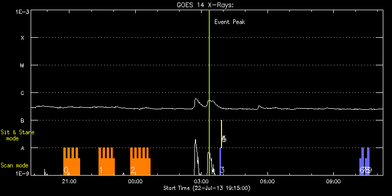 EIS Observation timeline overlay to GOES-Xray curve Code 1" 2" 40" 266" EIS Observations list for this event: STUDY ACRONYM ID DATE OBSERVED DESCRIPTION NOAA# TARGET 0 IUU_SCAN_STEPS_002 | 35185 | 2013/07/22 20:44:26 | Fast scans for small dynamic activity. | | Active Region TIMELINE ID DATE OBSERVED FITS FILE XCEN (+W/-E) YCEN (+N/-S) DUR ----------------------------------------------------------------------------------------------------------------- 35185 | 2013/07/22 20:44:26.000 | eis_l0_20130722_204426.fits.gz | -466.12 | -288.32 | 5m23s 35185 | 2013/07/22 20:49:53.000 | eis_l0_20130722_204953.fits.gz | -465.34 | -288.32 | 5m23s 35185 | 2013/07/22 20:55:20.000 | eis_l0_20130722_205520.fits.gz | -464.73 | -288.47 | 5m23s 35185 | 2013/07/22 21:00:46.000 | eis_l0_20130722_210046.fits.gz | -464.11 | -288.47 | 5m24s 35185 | 2013/07/22 21:06:13.000 | eis_l0_20130722_210613.fits.gz | -463.41 | -288.47 | 5m24s 35185 | 2013/07/22 21:11:40.000 | eis_l0_20130722_211140.fits.gz | -462.56 | -288.63 | 5m24s 35185 | 2013/07/22 21:17:07.000 | eis_l0_20130722_211707.fits.gz | -461.87 | -288.39 | 5m24s 35185 | 2013/07/22 21:22:34.000 | eis_l0_20130722_212234.fits.gz | -461.10 | -288.47 | 5m24s 1 IUU_SCAN_STEPS_002 | 35186 | 2013/07/22 22:20:12 | Fast scans for small dynamic activity. | | Active Region TIMELINE ID DATE OBSERVED FITS FILE XCEN (+W/-E) YCEN (+N/-S) DUR ----------------------------------------------------------------------------------------------------------------- 35186 | 2013/07/22 22:20:12.000 | eis_l0_20130722_222012.fits.gz | -453.68 | -289.01 | 5m24s 35186 | 2013/07/22 22:25:39.000 | eis_l0_20130722_222539.fits.gz | -452.98 | -288.93 | 5m23s 35186 | 2013/07/22 22:31:05.000 | eis_l0_20130722_223105.fits.gz | -452.21 | -289.09 | 5m24s 35186 | 2013/07/22 22:36:32.000 | eis_l0_20130722_223632.fits.gz | -451.67 | -289.09 | 5m24s 35186 | 2013/07/22 22:41:59.000 | eis_l0_20130722_224159.fits.gz | -450.90 | -289.09 | 5m23s 35186 | 2013/07/22 22:47:26.000 | eis_l0_20130722_224726.fits.gz | -450.20 | -289.24 | 5m23s 35186 | 2013/07/22 22:52:53.000 | eis_l0_20130722_225253.fits.gz | -449.43 | -289.24 | 5m23s 35186 | 2013/07/22 22:58:19.000 | eis_l0_20130722_225819.fits.gz | -448.66 | -289.09 | 5m24s 2 IUU_SCAN_STEPS_002 | 35187 | 2013/07/22 23:46:42 | Fast scans for small dynamic activity. | | Active Region TIMELINE ID DATE OBSERVED FITS FILE XCEN (+W/-E) YCEN (+N/-S) DUR ----------------------------------------------------------------------------------------------------------------- 35187 | 2013/07/22 23:46:42.000 | eis_l0_20130722_234642.fits.gz | -442.40 | -289.55 | 5m24s 35187 | 2013/07/22 23:52:09.000 | eis_l0_20130722_235209.fits.gz | -441.71 | -289.55 | 5m23s 35187 | 2013/07/22 23:57:36.000 | eis_l0_20130722_235736.fits.gz | -440.93 | -289.63 | 5m23s 35187 | 2013/07/23 00:03:03.000 | eis_l0_20130723_000303.fits.gz | -440.24 | -289.86 | 5m23s 35187 | 2013/07/23 00:08:29.000 | eis_l0_20130723_000829.fits.gz | -439.62 | -289.79 | 5m24s 35187 | 2013/07/23 00:13:56.000 | eis_l0_20130723_001356.fits.gz | -438.92 | -289.79 | 5m24s 35187 | 2013/07/23 00:19:23.000 | eis_l0_20130723_001923.fits.gz | -438.23 | -289.86 | 5m23s 35187 | 2013/07/23 00:24:50.000 | eis_l0_20130723_002450.fits.gz | -437.54 | -289.94 | 5m23s 35187 | 2013/07/23 00:30:16.000 | eis_l0_20130723_003016.fits.gz | -436.76 | -289.86 | 5m24s 35187 | 2013/07/23 00:35:43.000 | eis_l0_20130723_003543.fits.gz | -435.91 | -290.02 | 5m24s 3 PRY_slot_contextLITE | 35157 | 2013/07/23 03:50:19 | Change of EIS pointing and alignment w | 1800 | Active Region TIMELINE ID DATE OBSERVED FITS FILE XCEN (+W/-E) YCEN (+N/-S) DUR ----------------------------------------------------------------------------------------------------------------- 35157 | 2013/07/23 03:50:19.000 | eis_l0_20130723_035019.fits.gz | -18.86 | -39.50 | 2m56s 4 Alignment_266 | 35158 | 2013/07/23 03:53:34 | Change of EIS pointing and alignment w | 1800 | Quiet Sun TIMELINE ID DATE OBSERVED FITS FILE XCEN (+W/-E) YCEN (+N/-S) DUR ----------------------------------------------------------------------------------------------------------------- 35158 | 2013/07/23 03:53:34.000 | eis_l0_20130723_035334.fits.gz | -135.98 | -39.35 | 1m22s 5 XRT_synop_AIA | 35159 | 2013/07/23 03:55:41 | Change of EIS pointing and alignment w | 1800 | Quiet Sun TIMELINE ID DATE OBSERVED FITS FILE XCEN (+W/-E) YCEN (+N/-S) DUR ----------------------------------------------------------------------------------------------------------------- 35159 | 2013/07/23 03:55:41.000 | eis_l0_20130723_035541.fits.gz | -135.98 | -39.65 | 10s 6 full_sun_slot_scan_2 | 35188 | 2013/07/23 10:10:27 | Multi-temperature Full Disk Slot Scans | | Quiet Sun TIMELINE ID DATE OBSERVED FITS FILE XCEN (+W/-E) YCEN (+N/-S) DUR ----------------------------------------------------------------------------------------------------------------- 35188 | 2013/07/23 10:10:27.000 | eis_l0_20130723_101027.fits.gz | 920.80 | 185.73 | 5m27s 7 full_sun_slot_scan_2 | 35189 | 2013/07/23 10:16:26 | Multi-temperature Full Disk Slot Scans | | Quiet Sun TIMELINE ID DATE OBSERVED FITS FILE XCEN (+W/-E) YCEN (+N/-S) DUR ----------------------------------------------------------------------------------------------------------------- 35189 | 2013/07/23 10:16:26.000 | eis_l0_20130723_101626.fits.gz | 920.72 | -286.35 | 5m27s 8 full_sun_slot_scan_2 | 35190 | 2013/07/23 10:26:14 | Multi-temperature Full Disk Slot Scans | 1793 | Quiet Sun TIMELINE ID DATE OBSERVED FITS FILE XCEN (+W/-E) YCEN (+N/-S) DUR ----------------------------------------------------------------------------------------------------------------- 35190 | 2013/07/23 10:26:14.000 | eis_l0_20130723_102614.fits.gz | 452.68 | 185.42 | 5m27s 9 full_sun_slot_scan_2 | 35191 | 2013/07/23 10:31:46 | Multi-temperature Full Disk Slot Scans | | Quiet Sun TIMELINE ID DATE OBSERVED FITS FILE XCEN (+W/-E) YCEN (+N/-S) DUR ---------------------------------------------------------------------------------------