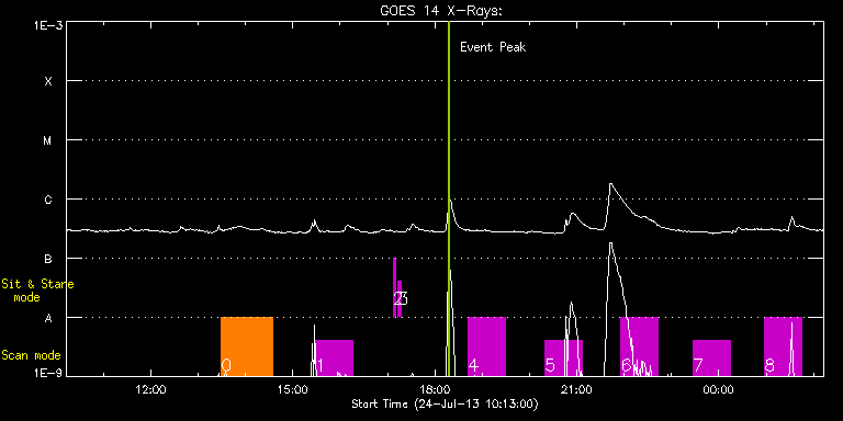 EIS Observation timeline overlay to GOES-Xray curve Code 1" 2" 40" 266" EIS Observations list for this event: STUDY ACRONYM ID DATE OBSERVED DESCRIPTION NOAA# TARGET 0 DHB_006 | 35226 | 2013/07/24 13:29:27 | Scan of returning AR 11777 (now around | 1799 | Active Region TIMELINE ID DATE OBSERVED FITS FILE XCEN (+W/-E) YCEN (+N/-S) DUR ----------------------------------------------------------------------------------------------------------------- 35226 | 2013/07/24 13:29:27.000 | eis_l0_20130724_132927.fits.gz | 143.24 | -285.49 | 1h5m23s 1 HPW021_VEL_120x512v2 | 35227 | 2013/07/24 15:29:26 | Scan of returning AR 11777 (now around | | Active Region TIMELINE ID DATE OBSERVED FITS FILE XCEN (+W/-E) YCEN (+N/-S) DUR ----------------------------------------------------------------------------------------------------------------- 35227 | 2013/07/24 15:29:26.000 | eis_l0_20130724_152926.fits.gz | 213.91 | -382.41 | 46m53s 2 regcal071 | 35222 | 2013/07/24 17:07:11 | Dark exposures, CCD bottom rows (100s | | Engineering TIMELINE ID DATE OBSERVED FITS FILE XCEN (+W/-E) YCEN (+N/-S) DUR ----------------------------------------------------------------------------------------------------------------- 35222 | 2013/07/24 17:07:11.000 | eis_l0_20130724_170711.fits.gz | 185.85 | -559.34 | 3m22s 3 regcal072 | 35223 | 2013/07/24 17:13:31 | Dark exposures, top CCD rows (100s exp | | Engineering TIMELINE ID DATE OBSERVED FITS FILE XCEN (+W/-E) YCEN (+N/-S) DUR ----------------------------------------------------------------------------------------------------------------- 35223 | 2013/07/24 17:13:31.000 | eis_l0_20130724_171331.fits.gz | 186.70 | -48.18 | 3m22s 4 HPW021_VEL_120x512v2 | 35232 | 2013/07/24 18:42:43 | Scan of returning AR 11777 (now around | 1800 | Active Region TIMELINE ID DATE OBSERVED FITS FILE XCEN (+W/-E) YCEN (+N/-S) DUR ----------------------------------------------------------------------------------------------------------------- 35232 | 2013/07/24 18:42:43.000 | eis_l0_20130724_184243.fits.gz | 242.41 | -382.03 | 46m52s 5 HPW021_VEL_120x512v2 | 35233 | 2013/07/24 20:19:43 | Scan of returning AR 11777 (now around | 1800 | Active Region TIMELINE ID DATE OBSERVED FITS FILE XCEN (+W/-E) YCEN (+N/-S) DUR ----------------------------------------------------------------------------------------------------------------- 35233 | 2013/07/24 20:19:43.000 | eis_l0_20130724_201943.fits.gz | 256.70 | -381.87 | 46m52s 6 HPW021_VEL_120x512v2 | 35234 | 2013/07/24 21:56:12 | Scan of returning AR 11777 (now around | 1800 | Active Region TIMELINE ID DATE OBSERVED FITS FILE XCEN (+W/-E) YCEN (+N/-S) DUR ----------------------------------------------------------------------------------------------------------------- 35234 | 2013/07/24 21:56:12.000 | eis_l0_20130724_215612.fits.gz | 270.84 | -381.80 | 46m53s 7 HPW021_VEL_120x512v2 | 35235 | 2013/07/24 23:27:13 | Scan of returning AR 11777 (now around | 1800 | Active Region TIMELINE ID DATE OBSERVED FITS FILE XCEN (+W/-E) YCEN (+N/-S) DUR ----------------------------------------------------------------------------------------------------------------- 35235 | 2013/07/24 23:27:13.000 | eis_l0_20130724_232713.fits.gz | 284.12 | -381.41 | 46m52s 8 HPW021_VEL_120x512v2 | 35236 | 2013/07/25 00:58:13 | Scan of returning AR 11777 (now around | 1800 | Active Region TIMELINE ID DATE OBSERVED FITS FILE XCEN (+W/-E) YCEN (+N/-S) DUR ----------------------------------------------------------------------------------------------------------------- 35236 | 2013/07/25 00:58:13.000 | eis_l0_20130725_005813.fits.gz | 297.18 | -381.25 | 46m52s : Check study information : Download file : View thumbnails For this event, also check for: