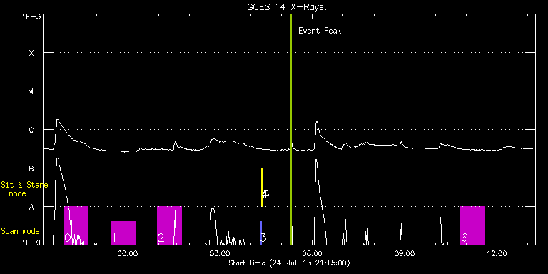 EIS Observation timeline overlay to GOES-Xray curve Code 1" 2" 40" 266" EIS Observations list for this event: STUDY ACRONYM ID DATE OBSERVED DESCRIPTION NOAA# TARGET 0 HPW021_VEL_120x512v2 | 35234 | 2013/07/24 21:56:12 | Scan of returning AR 11777 (now around | 1800 | Active Region TIMELINE ID DATE OBSERVED FITS FILE XCEN (+W/-E) YCEN (+N/-S) DUR ----------------------------------------------------------------------------------------------------------------- 35234 | 2013/07/24 21:56:12.000 | eis_l0_20130724_215612.fits.gz | 270.84 | -381.80 | 46m53s 1 HPW021_VEL_120x512v2 | 35235 | 2013/07/24 23:27:13 | Scan of returning AR 11777 (now around | 1800 | Active Region TIMELINE ID DATE OBSERVED FITS FILE XCEN (+W/-E) YCEN (+N/-S) DUR ----------------------------------------------------------------------------------------------------------------- 35235 | 2013/07/24 23:27:13.000 | eis_l0_20130724_232713.fits.gz | 284.12 | -381.41 | 46m52s 2 HPW021_VEL_120x512v2 | 35236 | 2013/07/25 00:58:13 | Scan of returning AR 11777 (now around | 1800 | Active Region TIMELINE ID DATE OBSERVED FITS FILE XCEN (+W/-E) YCEN (+N/-S) DUR ----------------------------------------------------------------------------------------------------------------- 35236 | 2013/07/25 00:58:13.000 | eis_l0_20130725_005813.fits.gz | 297.18 | -381.25 | 46m52s 3 PRY_slot_contextLITE | 35219 | 2013/07/25 04:17:33 | Change of EIS pointing and alignment w | 1805 | Active Region TIMELINE ID DATE OBSERVED FITS FILE XCEN (+W/-E) YCEN (+N/-S) DUR ----------------------------------------------------------------------------------------------------------------- 35219 | 2013/07/25 04:17:33.000 | eis_l0_20130725_041733.fits.gz | -18.78 | -39.65 | 2m56s 4 Alignment_266 | 35220 | 2013/07/25 04:20:47 | Change of EIS pointing and alignment w | | Quiet Sun TIMELINE ID DATE OBSERVED FITS FILE XCEN (+W/-E) YCEN (+N/-S) DUR ----------------------------------------------------------------------------------------------------------------- 35220 | 2013/07/25 04:20:47.000 | eis_l0_20130725_042047.fits.gz | -135.98 | -39.58 | 1m23s 5 XRT_synop_AIA | 35221 | 2013/07/25 04:23:22 | Change of EIS pointing and alignment w | | Quiet Sun TIMELINE ID DATE OBSERVED FITS FILE XCEN (+W/-E) YCEN (+N/-S) DUR ----------------------------------------------------------------------------------------------------------------- 35221 | 2013/07/25 04:23:22.000 | eis_l0_20130725_042322.fits.gz | -136.06 | -39.50 | 10s 6 HPW021_VEL_120x512v2 | 35238 | 2013/07/25 10:49:34 | Monitoring evolution of AR 11799 & 117 | | Active Region TIMELINE ID DATE OBSERVED FITS FILE XCEN (+W/-E) YCEN (+N/-S) DUR ----------------------------------------------------------------------------------------------------------------- 35238 | 2013/07/25 10:49:34.000 | eis_l0_20130725_104934.fits.gz | 403.36 | -278.27 | 46m53s : Check study information : Download file : View thumbnails For this event, also check for: