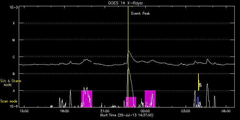 EIS Observation timeline overlay to GOES-Xray curve Code 1" 2" 40" 266" EIS Observations list for this event: STUDY ACRONYM ID DATE OBSERVED DESCRIPTION NOAA# TARGET 0 HPW021_VEL_120x512v2 | 35242 | 2013/07/25 19:15:13 | Monitoring evolution of AR 11799 & 117 | 1800 | Active Region TIMELINE ID DATE OBSERVED FITS FILE XCEN (+W/-E) YCEN (+N/-S) DUR ----------------------------------------------------------------------------------------------------------------- 35242 | 2013/07/25 19:15:13.000 | eis_l0_20130725_191513.fits.gz | 472.19 | -275.57 | 46m54s 1 HPW021_VEL_120x512v2 | 35244 | 2013/07/25 22:32:13 | Monitoring evolution of AR 11799 & 117 | 1800 | Active Region TIMELINE ID DATE OBSERVED FITS FILE XCEN (+W/-E) YCEN (+N/-S) DUR ----------------------------------------------------------------------------------------------------------------- 35244 | 2013/07/25 22:32:13.000 | eis_l0_20130725_223213.fits.gz | 498.22 | -274.41 | 46m54s 2 HPW021_VEL_120x512v2 | 35245 | 2013/07/25 23:57:44 | Monitoring evolution of AR 11799 & 117 | 1800 | Active Region TIMELINE ID DATE OBSERVED FITS FILE XCEN (+W/-E) YCEN (+N/-S) DUR ----------------------------------------------------------------------------------------------------------------- 35245 | 2013/07/25 23:57:44.000 | eis_l0_20130725_235744.fits.gz | 509.27 | -273.95 | 46m53s 3 PRY_slot_contextLITE | 35257 | 2013/07/26 03:52:34 | Change of EIS pointing and alignment w | 1805 | Active Region TIMELINE ID DATE OBSERVED FITS FILE XCEN (+W/-E) YCEN (+N/-S) DUR ----------------------------------------------------------------------------------------------------------------- 35257 | 2013/07/26 03:52:34.000 | eis_l0_20130726_035234.fits.gz | -18.04 | -34.50 | 2m56s 4 Alignment_266 | 35258 | 2013/07/26 03:55:48 | Change of EIS pointing and alignment w | | Quiet Sun TIMELINE ID DATE OBSERVED FITS FILE XCEN (+W/-E) YCEN (+N/-S) DUR ----------------------------------------------------------------------------------------------------------------- 35258 | 2013/07/26 03:55:48.000 | eis_l0_20130726_035548.fits.gz | -135.56 | -34.42 | 1m22s 5 XRT_synop_AIA | 35259 | 2013/07/26 03:58:23 | Change of EIS pointing and alignment w | | Quiet Sun TIMELINE ID DATE OBSERVED FITS FILE XCEN (+W/-E) YCEN (+N/-S) DUR ----------------------------------------------------------------------------------------------------------------- 35259 | 2013/07/26 03:58:23.000 | eis_l0_20130726_035823.fits.gz | -135.56 | -34.42 | 10s : Check study information : Download file : View thumbnails For this event, also check for: