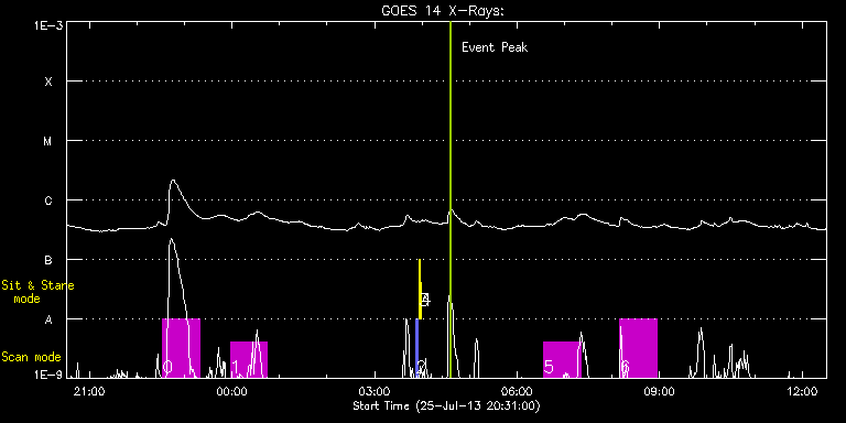 EIS Observation timeline overlay to GOES-Xray curve Code 1" 2" 40" 266" EIS Observations list for this event: STUDY ACRONYM ID DATE OBSERVED DESCRIPTION NOAA# TARGET 0 HPW021_VEL_120x512v2 | 35244 | 2013/07/25 22:32:13 | Monitoring evolution of AR 11799 & 117 | 1800 | Active Region TIMELINE ID DATE OBSERVED FITS FILE XCEN (+W/-E) YCEN (+N/-S) DUR ----------------------------------------------------------------------------------------------------------------- 35244 | 2013/07/25 22:32:13.000 | eis_l0_20130725_223213.fits.gz | 498.22 | -274.41 | 46m54s 1 HPW021_VEL_120x512v2 | 35245 | 2013/07/25 23:57:44 | Monitoring evolution of AR 11799 & 117 | 1800 | Active Region TIMELINE ID DATE OBSERVED FITS FILE XCEN (+W/-E) YCEN (+N/-S) DUR ----------------------------------------------------------------------------------------------------------------- 35245 | 2013/07/25 23:57:44.000 | eis_l0_20130725_235744.fits.gz | 509.27 | -273.95 | 46m53s 2 PRY_slot_contextLITE | 35257 | 2013/07/26 03:52:34 | Change of EIS pointing and alignment w | 1805 | Active Region TIMELINE ID DATE OBSERVED FITS FILE XCEN (+W/-E) YCEN (+N/-S) DUR ----------------------------------------------------------------------------------------------------------------- 35257 | 2013/07/26 03:52:34.000 | eis_l0_20130726_035234.fits.gz | -18.04 | -34.50 | 2m56s 3 Alignment_266 | 35258 | 2013/07/26 03:55:48 | Change of EIS pointing and alignment w | | Quiet Sun TIMELINE ID DATE OBSERVED FITS FILE XCEN (+W/-E) YCEN (+N/-S) DUR ----------------------------------------------------------------------------------------------------------------- 35258 | 2013/07/26 03:55:48.000 | eis_l0_20130726_035548.fits.gz | -135.56 | -34.42 | 1m22s 4 XRT_synop_AIA | 35259 | 2013/07/26 03:58:23 | Change of EIS pointing and alignment w | | Quiet Sun TIMELINE ID DATE OBSERVED FITS FILE XCEN (+W/-E) YCEN (+N/-S) DUR ----------------------------------------------------------------------------------------------------------------- 35259 | 2013/07/26 03:58:23.000 | eis_l0_20130726_035823.fits.gz | -135.56 | -34.42 | 10s 5 HPW021_VEL_120x512v2 | 35246 | 2013/07/26 06:33:33 | Monitoring evolution of AR 11799 & 117 | | Active Region TIMELINE ID DATE OBSERVED FITS FILE XCEN (+W/-E) YCEN (+N/-S) DUR ----------------------------------------------------------------------------------------------------------------- 35246 | 2013/07/26 06:33:33.000 | eis_l0_20130726_063333.fits.gz | 559.64 | -271.40 | 46m53s 6 HPW021_VEL_120x512v2 | 35247 | 2013/07/26 08:09:41 | Monitoring evolution of AR 11799 & 117 | | Active Region TIMELINE ID DATE OBSERVED FITS FILE XCEN (+W/-E) YCEN (+N/-S) DUR ----------------------------------------------------------------------------------------------------------------- 35247 | 2013/07/26 08:09:41.000 | eis_l0_20130726_080941.fits.gz | 571.69 | -270.47 | 46m52s : Check study information : Download file : View thumbnails For this event, also check for: