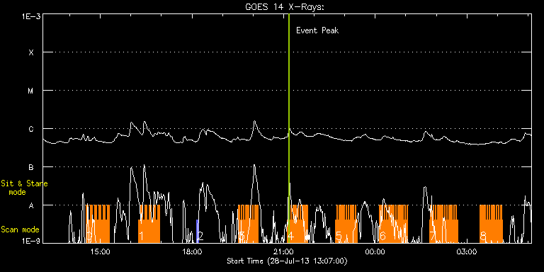 EIS Observation timeline overlay to GOES-Xray curve Code 1" 2" 40" 266" EIS Observations list for this event: STUDY ACRONYM ID DATE OBSERVED DESCRIPTION NOAA# TARGET 0 HH_Flare_162x152 | 35282 | 2013/07/28 14:31:12 | AR and Flare Observation | 1800 | Flare TIMELINE ID DATE OBSERVED FITS FILE XCEN (+W/-E) YCEN (+N/-S) DUR ----------------------------------------------------------------------------------------------------------------- 35282 | 2013/07/28 14:31:12.000 | eis_l0_20130728_143112.fits.gz | 843.34 | -198.18 | 4m10s 35282 | 2013/07/28 14:35:25.000 | eis_l0_20130728_143525.fits.gz | 843.58 | -198.02 | 4m11s 35282 | 2013/07/28 14:39:38.000 | eis_l0_20130728_143938.fits.gz | 843.89 | -198.02 | 4m11s 35282 | 2013/07/28 14:43:52.000 | eis_l0_20130728_144352.fits.gz | 844.19 | -198.02 | 4m11s 35282 | 2013/07/28 14:48:05.000 | eis_l0_20130728_144805.fits.gz | 844.35 | -197.87 | 4m11s 35282 | 2013/07/28 14:52:19.000 | eis_l0_20130728_145219.fits.gz | 844.73 | -197.87 | 4m10s 35282 | 2013/07/28 14:56:32.000 | eis_l0_20130728_145632.fits.gz | 844.97 | -197.71 | 4m11s 35282 | 2013/07/28 15:00:46.000 | eis_l0_20130728_150046.fits.gz | 845.20 | -197.87 | 4m10s 35282 | 2013/07/28 15:04:59.000 | eis_l0_20130728_150459.fits.gz | 845.51 | -197.71 | 4m11s 35282 | 2013/07/28 15:09:12.000 | eis_l0_20130728_150912.fits.gz | 845.66 | -197.64 | 4m11s 35282 | 2013/07/28 15:13:26.000 | eis_l0_20130728_151326.fits.gz | 845.97 | -197.56 | 4m11s 1 HH_Flare_162x152 | 35283 | 2013/07/28 16:14:25 | AR and Flare Observation | 1800 | Flare TIMELINE ID DATE OBSERVED FITS FILE XCEN (+W/-E) YCEN (+N/-S) DUR ----------------------------------------------------------------------------------------------------------------- 35283 | 2013/07/28 16:14:25.000 | eis_l0_20130728_161425.fits.gz | 849.76 | -196.79 | 4m10s 35283 | 2013/07/28 16:18:38.000 | eis_l0_20130728_161838.fits.gz | 850.06 | -196.79 | 4m11s 35283 | 2013/07/28 16:22:51.000 | eis_l0_20130728_162251.fits.gz | 850.30 | -196.79 | 4m11s 35283 | 2013/07/28 16:27:05.000 | eis_l0_20130728_162705.fits.gz | 850.53 | -196.79 | 4m10s 35283 | 2013/07/28 16:31:18.000 | eis_l0_20130728_163118.fits.gz | 850.76 | -196.63 | 4m11s 35283 | 2013/07/28 16:35:32.000 | eis_l0_20130728_163532.fits.gz | 851.07 | -196.55 | 4m11s 35283 | 2013/07/28 16:39:46.000 | eis_l0_20130728_163946.fits.gz | 851.30 | -196.55 | 4m10s 35283 | 2013/07/28 16:43:59.000 | eis_l0_20130728_164359.fits.gz | 851.61 | -196.40 | 4m11s 35283 | 2013/07/28 16:48:13.000 | eis_l0_20130728_164813.fits.gz | 851.76 | -196.40 | 4m10s 35283 | 2013/07/28 16:52:26.000 | eis_l0_20130728_165226.fits.gz | 852.07 | -196.40 | 4m11s 2 PRY_slot_contextLITE | 35284 | 2013/07/28 18:09:33 | | 1801 | Active Region TIMELINE ID DATE OBSERVED FITS FILE XCEN (+W/-E) YCEN (+N/-S) DUR ----------------------------------------------------------------------------------------------------------------- 35284 | 2013/07/28 18:09:33.000 | eis_l0_20130728_180933.fits.gz | -15.29 | -0.50 | 2m56s 3 Cam_flare_diag | 35285 | 2013/07/28 19:31:33 | flare observation | | Flare TIMELINE ID DATE OBSERVED FITS FILE XCEN (+W/-E) YCEN (+N/-S) DUR ----------------------------------------------------------------------------------------------------------------- 35285 | 2013/07/28 19:31:33.000 | eis_l0_20130728_193133.fits.gz | 861.27 | -194.24 | 2m11s 35285 | 2013/07/28 19:33:47.000 | eis_l0_20130728_193347.fits.gz | 861.57 | -194.16 | 2m12s 35285 | 2013/07/28 19:36:02.000 | eis_l0_20130728_193602.fits.gz | 861.65 | -194.31 | 2m12s 35285 | 2013/07/28 19:38:16.000 | eis_l0_20130728_193816.fits.gz | 861.88 | -194.08 | 2m13s 35285 | 2013/07/28 19:40:31.000 | eis_l0_20130728_194031.fits.gz | 861.96 | -194.24 | 2m12s 35285 | 2013/07/28 19:42:46.000 | eis_l0_20130728_194246.fits.gz | 862.04 | -194.08 | 2m12s 35285 | 2013/07/28 19:45:00.000 | eis_l0_20130728_194500.fits.gz | 862.19 | -194.08 | 2m12s 35285 | 2013/07/28 19:47:15.000 | eis_l0_20130728_194715.fits.gz | 862.27 | -194.01 | 2m11s 35285 | 2013/07/28 19:49:29.000 | eis_l0_20130728_194929.fits.gz | 862.42 | -194.08 | 2m12s 35285 | 2013/07/28 19:51:44.000 | eis_l0_20130728_195144.fits.gz | 862.58 | -193.85 | 2m12s 35285 | 2013/07/28 19:53:58.000 | eis_l0_20130728_195358.fits.gz | 862.58 | -193.85 | 2m12s 35285 | 2013/07/28 19:56:13.000 | eis_l0_20130728_195613.fits.gz | 862.73 | -194.01 | 2m12s 35285 | 2013/07/28 19:58:27.000 | eis_l0_20130728_195827.fits.gz | 862.89 | -193.85 | 2m12s 35285 | 2013/07/28 20:00:42.000 | eis_l0_20130728_200042.fits.gz | 863.12 | -193.93 | 2m12s 35285 | 2013/07/28 20:02:56.000 | eis_l0_20130728_200256.fits.gz | 863.12 | -193.77 | 2m12s 35285 | 2013/07/28 20:05:11.000 | eis_l0_20130728_200511.fits.gz | 863.35 | -193.77 | 2m12s 35285 | 2013/07/28 20:07:25.000 | eis_l0_20130728_200725.fits.gz | 863.43 | -193.62 | 2m12s 4 Cam_flare_diag | 35286 | 2013/07/28 21:07:05 | flare observation | | Flare TIMELINE ID DATE OBSERVED FITS FILE XCEN (+W/-E) YCEN (+N/-S) DUR ----------------------------------------------------------------------------------------------------------------- 35286 | 2013/07/28 21:07:05.000 | eis_l0_20130728_210705.fits.gz | 866.75 | -193.00 | 2m11s 35286 | 2013/07/28 21:09:19.000 | eis_l0_20130728_210919.fits.gz | 866.83 | -193.00 | 2m12s 35286 | 2013/07/28 21:11:34.000 | eis_l0_20130728_211134.fits.gz | 866.98 | -192.92 | 2m12s 35286 | 2013/07/28 21:13:48.000 | eis_l0_20130728_211348.fits.gz | 867.14 | -192.92 | 2m13s 35286 | 2013/07/28 21:16:03.000 | eis_l0_20130728_211603.fits.gz | 867.21 | -192.85 | 2m12s 35286 | 2013/07/28 21:18:18.000 | eis_l0_20130728_211818.fits.gz | 867.21 | -192.77 | 2m12s 35286 | 2013/07/28 21:20:32.000 | eis_l0_20130728_212032.fits.gz | 867.45 | -192.77 | 2m12s 35286 | 2013/07/28 21:22:47.000 | eis_l0_20130728_212247.fits.gz | 867.45 | -192.77 | 2m11s 35286 | 2013/07/28 21:25:01.000 | eis_l0_20130728_212501.fits.gz | 867.68 | -192.77 | 2m12s 35286 | 2013/07/28 21:27:16.000 | eis_l0_20130728_212716.fits.gz | 867.75 | -192.54 | 2m12s 35286 | 2013/0
