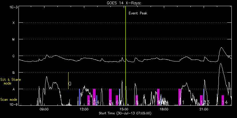 EIS Observation timeline overlay to GOES-Xray curve Code 1" 2" 40" 266" EIS Observations list for this event: STUDY ACRONYM ID DATE OBSERVED DESCRIPTION NOAA# TARGET 0 XRT_synop_AIA | 35344 | 2013/07/30 10:49:12 | synop | | Quiet Sun TIMELINE ID DATE OBSERVED FITS FILE XCEN (+W/-E) YCEN (+N/-S) DUR ----------------------------------------------------------------------------------------------------------------- 35344 | 2013/07/30 10:49:12.000 | eis_l0_20130730_104912.fits.gz | -132.64 | -0.42 | 10s 1 PRY_slot_contextLITE | 35305 | 2013/07/30 11:37:45 | HOP79 Irradiance Scan | | Active Region TIMELINE ID DATE OBSERVED FITS FILE XCEN (+W/-E) YCEN (+N/-S) DUR ----------------------------------------------------------------------------------------------------------------- 35305 | 2013/07/30 11:37:45.000 | eis_l0_20130730_113745.fits.gz | -15.14 | -945.55 | 2m56s 2 SK_DEEP_5x512_SLIT1 | 35306 | 2013/07/30 12:15:21 | HOP79 Irradiance Scan | | Quiet Sun TIMELINE ID DATE OBSERVED FITS FILE XCEN (+W/-E) YCEN (+N/-S) DUR ----------------------------------------------------------------------------------------------------------------- 35306 | 2013/07/30 12:15:21.000 | eis_l0_20130730_121521.fits.gz | -8.02 | -887.38 | 10m7s 3 SK_DEEP_5x512_SLIT1 | 35308 | 2013/07/30 12:40:41 | HOP79 Irradiance Scan | | Quiet Sun TIMELINE ID DATE OBSERVED FITS FILE XCEN (+W/-E) YCEN (+N/-S) DUR ----------------------------------------------------------------------------------------------------------------- 35308 | 2013/07/30 12:40:41.000 | eis_l0_20130730_124041.fits.gz | -7.94 | -887.46 | 10m7s 4 PRY_slot_contextLITE | 35309 | 2013/07/30 12:55:34 | HOP79 Irradiance Scan | | Active Region TIMELINE ID DATE OBSERVED FITS FILE XCEN (+W/-E) YCEN (+N/-S) DUR ----------------------------------------------------------------------------------------------------------------- 35309 | 2013/07/30 12:55:34.000 | eis_l0_20130730_125534.fits.gz | -23.17 | -787.50 | 2m56s 5 SK_DEEP_5x512_SLIT1 | 35310 | 2013/07/30 13:53:20 | HOP79 Irradiance Scan | | Quiet Sun TIMELINE ID DATE OBSERVED FITS FILE XCEN (+W/-E) YCEN (+N/-S) DUR ----------------------------------------------------------------------------------------------------------------- 35310 | 2013/07/30 13:53:20.000 | eis_l0_20130730_135320.fits.gz | -7.94 | -687.31 | 10m8s 6 SK_DEEP_5x512_SLIT1 | 35312 | 2013/07/30 14:23:13 | HOP79 Irradiance Scan | | Quiet Sun TIMELINE ID DATE OBSERVED FITS FILE XCEN (+W/-E) YCEN (+N/-S) DUR ----------------------------------------------------------------------------------------------------------------- 35312 | 2013/07/30 14:23:13.000 | eis_l0_20130730_142313.fits.gz | -7.94 | -587.58 | 10m8s 7 PRY_slot_contextLITE | 35313 | 2013/07/30 14:38:34 | HOP79 Irradiance Scan | | Active Region TIMELINE ID DATE OBSERVED FITS FILE XCEN (+W/-E) YCEN (+N/-S) DUR ----------------------------------------------------------------------------------------------------------------- 35313 | 2013/07/30 14:38:34.000 | eis_l0_20130730_143834.fits.gz | -23.17 | -587.66 | 2m57s 8 SK_DEEP_5x512_SLIT1 | 35314 | 2013/07/30 15:52:20 | HOP79 Irradiance Scan | | Quiet Sun TIMELINE ID DATE OBSERVED FITS FILE XCEN (+W/-E) YCEN (+N/-S) DUR ----------------------------------------------------------------------------------------------------------------- 35314 | 2013/07/30 15:52:20.000 | eis_l0_20130730_155220.fits.gz | -7.94 | -487.47 | 10m8s 9 SK_DEEP_5x512_SLIT1 | 35316 | 2013/07/30 17:29:41 | HOP79 Irradiance Scan | | Quiet Sun TIMELINE ID DATE OBSERVED FITS FILE XCEN (+W/-E) YCEN (+N/-S) DUR ----------------------------------------------------------------------------------------------------------------- 35316 | 2013/07/30 17:29:41.000 | eis_l0_20130730_172941.fits.gz | -8.02 | -387.36 | 10m8s 10 PRY_slot_contextLITE | 35317 | 2013/07/30 17:44:34 | HOP79 Irradiance Scan | | Active Region TIMELINE ID DATE OBSERVED FITS FILE XCEN (+W/-E) YCEN (+N/-S) DUR ----------------------------------------------------------------------------------------------------------------- 35317 | 2013/07/30 17:44:34.000 | eis_l0_20130730_174434.fits.gz | -23.09 | -387.51 | 2m56s 11 SK_DEEP_5x512_SLIT1 | 35318 | 2013/07/30 19:06:20 | HOP79 Irradiance Scan | | Quiet Sun TIMELINE ID DATE OBSERVED FITS FILE XCEN (+W/-E) YCEN (+N/-S) DUR ----------------------------------------------------------------------------------------------------------------- 35318 | 2013/07/30 19:06:20.000 | eis_l0_20130730_190620.fits.gz | -7.94 | -287.40 | 10m8s 12 SK_DEEP_5x512_SLIT1 | 35320 | 2013/07/30 20:43:41 | HOP79 Irradiance Scan | | Quiet Sun TIMELINE ID DATE OBSERVED FITS FILE XCEN (+W/-E) YCEN (+N/-S) DUR ----------------------------------------------------------------------------------------------------------------- 35320 | 2013/07/30 20:43:41.000 | eis_l0_20130730_204341.fits.gz | -7.94 | -187.13 | 10m7s 13 PRY_slot_contextLITE | 35321 | 2013/07/30 20:58:34 | HOP79 Irradiance Scan | | Active Region TIMELINE ID DATE OBSERVED FITS FILE XCEN (+W/-E) YCEN (+N/-S) DUR ----------------------------------------------------------------------------------------------------------------- 35321 | 2013/07/30 20:58:34.000 | eis_l0_20130730_205834.fits.gz | -23.17 | -187.44 | 2m56s 14 SK_DEEP_5x512_SLIT1 | 35322 | 2013/07/30 22:20:20 | HOP79 Irradiance Scan | | Quiet Sun TIMELINE ID DATE OBSERVED FITS FILE XCEN (+W/-E) YCEN (+N/-S) DUR ----------------------------------------------------------------------------------------------------------------- 35322 | 2013/07/30 22:20:20.000 | eis_l0_20130730_222020.fits.gz | -7.87 | -87.56 | 10m8s : Check study information : Download file : View thumbnails For this event, also check for: