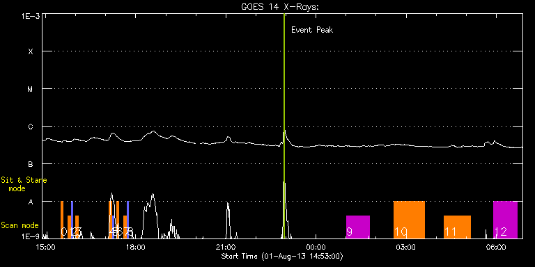 EIS Observation timeline overlay to GOES-Xray curve Code 1" 2" 40" 266" EIS Observations list for this event: STUDY ACRONYM ID DATE OBSERVED DESCRIPTION NOAA# TARGET 0 SK_DEEP_10x512_SLIT2 | 35366 | 2013/08/01 15:30:03 | HOP 79 Irradiance scan | | Quiet Sun TIMELINE ID DATE OBSERVED FITS FILE XCEN (+W/-E) YCEN (+N/-S) DUR ----------------------------------------------------------------------------------------------------------------- 35366 | 2013/08/01 15:30:03.000 | eis_l0_20130801_153003.fits.gz | -90.47 | -42.68 | 5m8s 1 SK_DEEP_10x512_SLIT2 | 35367 | 2013/08/01 15:44:44 | HOP 79 Irradiance scan | | Quiet Sun TIMELINE ID DATE OBSERVED FITS FILE XCEN (+W/-E) YCEN (+N/-S) DUR ----------------------------------------------------------------------------------------------------------------- 35367 | 2013/08/01 15:44:44.000 | eis_l0_20130801_154444.fits.gz | 108.52 | -42.52 | 5m8s 2 PRY_slot_contextLITE | 35368 | 2013/08/01 15:51:50 | HOP 79 Irradiance scan | | Active Region TIMELINE ID DATE OBSERVED FITS FILE XCEN (+W/-E) YCEN (+N/-S) DUR ----------------------------------------------------------------------------------------------------------------- 35368 | 2013/08/01 15:51:50.000 | eis_l0_20130801_155150.fits.gz | 93.78 | -42.52 | 2m57s 3 SK_DEEP_10x512_SLIT2 | 35369 | 2013/08/01 16:00:04 | HOP 79 Irradiance scan | | Quiet Sun TIMELINE ID DATE OBSERVED FITS FILE XCEN (+W/-E) YCEN (+N/-S) DUR ----------------------------------------------------------------------------------------------------------------- 35369 | 2013/08/01 16:00:04.000 | eis_l0_20130801_160004.fits.gz | 307.59 | -42.52 | 5m7s 4 SK_DEEP_10x512_SLIT2 | 35370 | 2013/08/01 17:06:40 | HOP 79 Irradiance scan | | Quiet Sun TIMELINE ID DATE OBSERVED FITS FILE XCEN (+W/-E) YCEN (+N/-S) DUR ----------------------------------------------------------------------------------------------------------------- 35370 | 2013/08/01 17:06:40.000 | eis_l0_20130801_170640.fits.gz | 506.42 | -42.52 | 5m8s 5 PRY_slot_contextLITE | 35371 | 2013/08/01 17:13:07 | HOP 79 Irradiance scan | | Active Region TIMELINE ID DATE OBSERVED FITS FILE XCEN (+W/-E) YCEN (+N/-S) DUR ----------------------------------------------------------------------------------------------------------------- 35371 | 2013/08/01 17:13:07.000 | eis_l0_20130801_171307.fits.gz | 491.53 | -42.37 | 2m56s 6 SK_DEEP_10x512_SLIT2 | 35372 | 2013/08/01 17:21:33 | HOP 79 Irradiance scan | | Quiet Sun TIMELINE ID DATE OBSERVED FITS FILE XCEN (+W/-E) YCEN (+N/-S) DUR ----------------------------------------------------------------------------------------------------------------- 35372 | 2013/08/01 17:21:33.000 | eis_l0_20130801_172133.fits.gz | 705.41 | -42.60 | 5m8s 7 SK_DEEP_10x512_SLIT2 | 35373 | 2013/08/01 17:36:14 | HOP 79 Irradiance scan | | Quiet Sun TIMELINE ID DATE OBSERVED FITS FILE XCEN (+W/-E) YCEN (+N/-S) DUR ----------------------------------------------------------------------------------------------------------------- 35373 | 2013/08/01 17:36:14.000 | eis_l0_20130801_173614.fits.gz | 904.48 | -42.45 | 5m8s 8 PRY_slot_contextLITE | 35374 | 2013/08/01 17:43:07 | HOP 79 Irradiance scan | 1805 | Active Region TIMELINE ID DATE OBSERVED FITS FILE XCEN (+W/-E) YCEN (+N/-S) DUR ----------------------------------------------------------------------------------------------------------------- 35374 | 2013/08/01 17:43:07.000 | eis_l0_20130801_174307.fits.gz | 889.82 | -42.60 | 2m56s 9 HPW021_VEL_120x512v2 | 35375 | 2013/08/02 01:00:20 | AR studies | 1806 | Active Region TIMELINE ID DATE OBSERVED FITS FILE XCEN (+W/-E) YCEN (+N/-S) DUR ----------------------------------------------------------------------------------------------------------------- 35375 | 2013/08/02 01:00:20.000 | eis_l0_20130802_010020.fits.gz | 56.91 | -389.90 | 46m53s 10 Atlas_60 | 35376 | 2013/08/02 02:35:27 | AR studies | 1806 | Quiet Sun TIMELINE ID DATE OBSERVED FITS FILE XCEN (+W/-E) YCEN (+N/-S) DUR ----------------------------------------------------------------------------------------------------------------- 35376 | 2013/08/02 02:35:27.000 | eis_l0_20130802_023527.fits.gz | 70.44 | -389.83 | 1h1m39s 11 GDZ_300x360_S2S3_30S | 35377 | 2013/08/02 04:15:13 | AR studies | 1806 | Active Region TIMELINE ID DATE OBSERVED FITS FILE XCEN (+W/-E) YCEN (+N/-S) DUR ----------------------------------------------------------------------------------------------------------------- 35377 | 2013/08/02 04:15:13.000 | eis_l0_20130802_041513.fits.gz | 84.48 | -389.90 | 53m18s 12 HPW021_VEL_120x512v2 | 35378 | 2013/08/02 05:54:36 | AR studies | 1806 | Active Region TIMELINE ID DATE OBSERVED FITS FILE XCEN (+W/-E) YCEN (+N/-S) DUR ----------------------------------------------------------------------------------------------------------------- 35378 | 2013/08/02 05:54:36.000 | eis_l0_20130802_055436.fits.gz | 98.93 | -389.75 | 46m54s : Check study information : Download file : View thumbnails For this event, also check for: