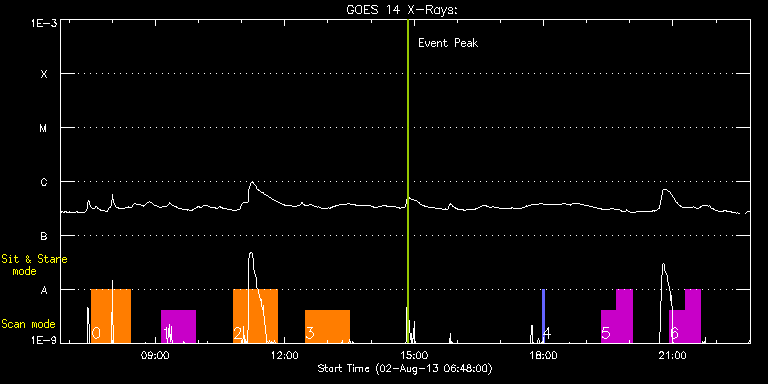 EIS Observation timeline overlay to GOES-Xray curve Code 1" 2" 40" 266" EIS Observations list for this event: STUDY ACRONYM ID DATE OBSERVED DESCRIPTION NOAA# TARGET 0 GDZ_300x360_S2S3_30S | 35379 | 2013/08/02 07:31:37 | AR studies | 1806 | Active Region TIMELINE ID DATE OBSERVED FITS FILE XCEN (+W/-E) YCEN (+N/-S) DUR ----------------------------------------------------------------------------------------------------------------- 35379 | 2013/08/02 07:31:37.000 | eis_l0_20130802_073137.fits.gz | 112.37 | -389.67 | 53m18s 1 HPW021_VEL_120x512v2 | 35380 | 2013/08/02 09:08:39 | AR studies | 1806 | Active Region TIMELINE ID DATE OBSERVED FITS FILE XCEN (+W/-E) YCEN (+N/-S) DUR ----------------------------------------------------------------------------------------------------------------- 35380 | 2013/08/02 09:08:39.000 | eis_l0_20130802_090839.fits.gz | 126.35 | -389.52 | 46m52s 2 Atlas_60 | 35381 | 2013/08/02 10:48:10 | AR studies | | Quiet Sun TIMELINE ID DATE OBSERVED FITS FILE XCEN (+W/-E) YCEN (+N/-S) DUR ----------------------------------------------------------------------------------------------------------------- 35381 | 2013/08/02 10:48:10.000 | eis_l0_20130802_104810.fits.gz | 140.58 | -389.44 | 1h1m39s 3 Atlas_60 | 35382 | 2013/08/02 12:28:22 | AR studies | | Quiet Sun TIMELINE ID DATE OBSERVED FITS FILE XCEN (+W/-E) YCEN (+N/-S) DUR ----------------------------------------------------------------------------------------------------------------- 35382 | 2013/08/02 12:28:22.000 | eis_l0_20130802_122822.fits.gz | 154.64 | -389.21 | 1h1m39s 4 PRY_slot_contextLITE | 35383 | 2013/08/02 17:58:20 | synop | 1808 | Active Region TIMELINE ID DATE OBSERVED FITS FILE XCEN (+W/-E) YCEN (+N/-S) DUR ----------------------------------------------------------------------------------------------------------------- 35383 | 2013/08/02 17:58:20.000 | eis_l0_20130802_175820.fits.gz | -15.29 | -0.58 | 2m56s 5 HPW013_AR_RAS_23m | 35384 | 2013/08/02 19:20:19 | AR observation | | Active Region TIMELINE ID DATE OBSERVED FITS FILE XCEN (+W/-E) YCEN (+N/-S) DUR ----------------------------------------------------------------------------------------------------------------- 35384 | 2013/08/02 19:20:19.000 | eis_l0_20130802_192019.fits.gz | 212.83 | -388.44 | 21m38s 35384 | 2013/08/02 19:42:01.000 | eis_l0_20130802_194201.fits.gz | 216.00 | -388.44 | 21m36s 6 HPW013_AR_RAS_23m | 35385 | 2013/08/02 20:55:26 | AR observation | | Active Region TIMELINE ID DATE OBSERVED FITS FILE XCEN (+W/-E) YCEN (+N/-S) DUR ----------------------------------------------------------------------------------------------------------------- 35385 | 2013/08/02 20:55:26.000 | eis_l0_20130802_205526.fits.gz | 226.19 | -388.21 | 21m37s 35385 | 2013/08/02 21:17:07.000 | eis_l0_20130802_211707.fits.gz | 229.05 | -388.13 | 21m37s : Check study information : Download file : View thumbnails For this event, also check for: