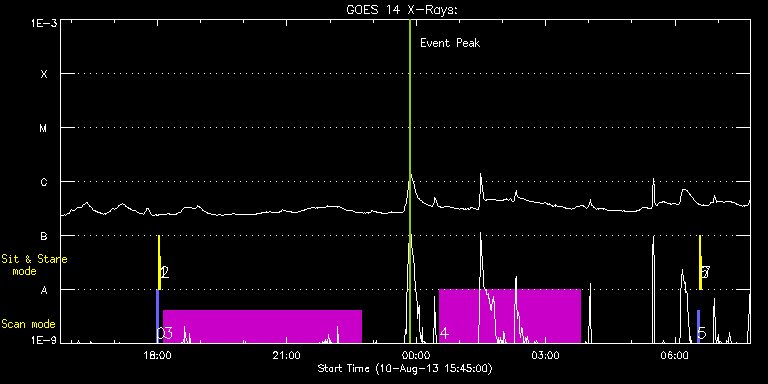 EIS Observation timeline overlay to GOES-Xray curve Code 1" 2" 40" 266" EIS Observations list for this event: STUDY ACRONYM ID DATE OBSERVED DESCRIPTION NOAA# TARGET 0 PRY_slot_contextLITE | 35550 | 2013/08/10 17:58:11 | EIS-AIA alignment | | Active Region TIMELINE ID DATE OBSERVED FITS FILE XCEN (+W/-E) YCEN (+N/-S) DUR ----------------------------------------------------------------------------------------------------------------- 35550 | 2013/08/10 17:58:11.000 | eis_l0_20130810_175811.fits.gz | -15.37 | -0.50 | 2m56s 1 Alignment_266 | 35551 | 2013/08/10 18:01:25 | EIS-AIA alignment | | Quiet Sun TIMELINE ID DATE OBSERVED FITS FILE XCEN (+W/-E) YCEN (+N/-S) DUR ----------------------------------------------------------------------------------------------------------------- 35551 | 2013/08/10 18:01:25.000 | eis_l0_20130810_180125.fits.gz | -132.49 | -0.50 | 1m22s 2 XRT_synop_AIA | 35552 | 2013/08/10 18:03:33 | EIS-AIA alignment | | Quiet Sun TIMELINE ID DATE OBSERVED FITS FILE XCEN (+W/-E) YCEN (+N/-S) DUR ----------------------------------------------------------------------------------------------------------------- 35552 | 2013/08/10 18:03:33.000 | eis_l0_20130810_180333.fits.gz | -132.49 | -0.50 | 10s 3 SK_CH_DIAG_320x384 | 35544 | 2013/08/10 18:08:34 | HOP 81. Polar monitoring. South pole. | | Coronal Hole TIMELINE ID DATE OBSERVED FITS FILE XCEN (+W/-E) YCEN (+N/-S) DUR ----------------------------------------------------------------------------------------------------------------- 35544 | 2013/08/10 18:08:34.000 | eis_l0_20130810_180834.fits.gz | -13.95 | -927.47 | 4h34m46s 4 SYNOP006 | 35543 | 2013/08/11 00:32:41 | EIS sensitivity monitoring. | | Quiet Sun TIMELINE ID DATE OBSERVED FITS FILE XCEN (+W/-E) YCEN (+N/-S) DUR ----------------------------------------------------------------------------------------------------------------- 35543 | 2013/08/11 00:32:41.000 | eis_l0_20130811_003241.fits.gz | 80.39 | -6.35 | 3h15m32s 5 PRY_slot_contextLITE | 35553 | 2013/08/11 06:31:04 | EIS-AIA alignment | | Active Region TIMELINE ID DATE OBSERVED FITS FILE XCEN (+W/-E) YCEN (+N/-S) DUR ----------------------------------------------------------------------------------------------------------------- 35553 | 2013/08/11 06:31:04.000 | eis_l0_20130811_063104.fits.gz | -15.37 | -0.42 | 2m56s 6 Alignment_266 | 35554 | 2013/08/11 06:34:19 | EIS-AIA alignment | | Quiet Sun TIMELINE ID DATE OBSERVED FITS FILE XCEN (+W/-E) YCEN (+N/-S) DUR ----------------------------------------------------------------------------------------------------------------- 35554 | 2013/08/11 06:34:19.000 | eis_l0_20130811_063419.fits.gz | -132.57 | -0.50 | 1m22s 7 XRT_synop_AIA | 35555 | 2013/08/11 06:36:26 | EIS-AIA alignment | | Quiet Sun TIMELINE ID DATE OBSERVED FITS FILE XCEN (+W/-E) YCEN (+N/-S) DUR ----------------------------------------------------------------------------------------------------------------- 35555 | 2013/08/11 06:36:26.000 | eis_l0_20130811_063626.fits.gz | -132.57 | -0.42 | 10s : Check study information : Download file : View thumbnails For this event, also check for: