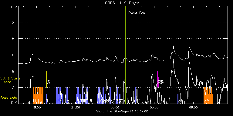 EIS Observation timeline overlay to GOES-Xray curve Code 1" 2" 40" 266" EIS Observations list for this event: STUDY ACRONYM ID DATE OBSERVED DESCRIPTION NOAA# TARGET 0 HH_Flare_162x152 | 36084 | 2013/09/03 17:44:43 | HOP236 - Collaboration with IRIS-SST o | | Flare TIMELINE ID DATE OBSERVED FITS FILE XCEN (+W/-E) YCEN (+N/-S) DUR ----------------------------------------------------------------------------------------------------------------- 36084 | 2013/09/03 17:44:43.000 | eis_l0_20130903_174443.fits.gz | 311.14 | 94.43 | 4m11s 36084 | 2013/09/03 17:48:56.000 | eis_l0_20130903_174856.fits.gz | 311.84 | 94.28 | 4m11s 36084 | 2013/09/03 17:53:10.000 | eis_l0_20130903_175310.fits.gz | 312.38 | 94.51 | 4m11s 36084 | 2013/09/03 17:57:23.000 | eis_l0_20130903_175723.fits.gz | 313.00 | 94.58 | 4m11s 36084 | 2013/09/03 18:01:37.000 | eis_l0_20130903_180137.fits.gz | 313.54 | 94.66 | 4m11s 36084 | 2013/09/03 18:05:51.000 | eis_l0_20130903_180551.fits.gz | 314.23 | 94.58 | 4m10s 36084 | 2013/09/03 18:10:04.000 | eis_l0_20130903_181004.fits.gz | 314.85 | 94.58 | 4m11s 36084 | 2013/09/03 18:14:18.000 | eis_l0_20130903_181418.fits.gz | 315.39 | 94.51 | 4m10s 36084 | 2013/09/03 18:18:31.000 | eis_l0_20130903_181831.fits.gz | 315.93 | 94.66 | 4m11s 36084 | 2013/09/03 18:22:44.000 | eis_l0_20130903_182244.fits.gz | 316.55 | 94.74 | 4m11s 36084 | 2013/09/03 18:26:58.000 | eis_l0_20130903_182658.fits.gz | 317.17 | 94.66 | 4m11s 1 PRY_slot_contextLITE | 36073 | 2013/09/03 18:43:20 | EIS-AIA alignment | 1836 | Active Region TIMELINE ID DATE OBSERVED FITS FILE XCEN (+W/-E) YCEN (+N/-S) DUR ----------------------------------------------------------------------------------------------------------------- 36073 | 2013/09/03 18:43:20.000 | eis_l0_20130903_184320.fits.gz | -15.37 | -0.50 | 2m56s 2 Alignment_266 | 36074 | 2013/09/03 18:46:34 | EIS-AIA alignment | | Quiet Sun TIMELINE ID DATE OBSERVED FITS FILE XCEN (+W/-E) YCEN (+N/-S) DUR ----------------------------------------------------------------------------------------------------------------- 36074 | 2013/09/03 18:46:34.000 | eis_l0_20130903_184634.fits.gz | -132.57 | -0.42 | 1m22s 3 XRT_synop_AIA | 36075 | 2013/09/03 18:48:41 | EIS-AIA alignment | | Quiet Sun TIMELINE ID DATE OBSERVED FITS FILE XCEN (+W/-E) YCEN (+N/-S) DUR ----------------------------------------------------------------------------------------------------------------- 36075 | 2013/09/03 18:48:41.000 | eis_l0_20130903_184841.fits.gz | -132.57 | -0.35 | 10s 4 full_sun_slot_scan_2 | 36047 | 2013/09/03 19:31:24 | HOP130 full sun slot scan (1/15) | | Quiet Sun TIMELINE ID DATE OBSERVED FITS FILE XCEN (+W/-E) YCEN (+N/-S) DUR ----------------------------------------------------------------------------------------------------------------- 36047 | 2013/09/03 19:31:24.000 | eis_l0_20130903_193124.fits.gz | 920.72 | -286.35 | 5m27s 5 full_sun_slot_scan_2 | 36048 | 2013/09/03 19:41:13 | HOP130 full sun slot scan (2/15) | | Quiet Sun TIMELINE ID DATE OBSERVED FITS FILE XCEN (+W/-E) YCEN (+N/-S) DUR ----------------------------------------------------------------------------------------------------------------- 36048 | 2013/09/03 19:41:13.000 | eis_l0_20130903_194113.fits.gz | 452.68 | 185.50 | 5m27s 6 full_sun_slot_scan_2 | 36049 | 2013/09/03 19:46:45 | HOP130 full sun slot scan (2/15) | 1835 | Quiet Sun TIMELINE ID DATE OBSERVED FITS FILE XCEN (+W/-E) YCEN (+N/-S) DUR ----------------------------------------------------------------------------------------------------------------- 36049 | 2013/09/03 19:46:45.000 | eis_l0_20130903_194645.fits.gz | 452.68 | -286.42 | 5m27s 7 full_sun_slot_scan_2 | 36050 | 2013/09/03 19:57:14 | HOP130 full sun slot scan (3/15) | 1836 | Quiet Sun TIMELINE ID DATE OBSERVED FITS FILE XCEN (+W/-E) YCEN (+N/-S) DUR ----------------------------------------------------------------------------------------------------------------- 36050 | 2013/09/03 19:57:14.000 | eis_l0_20130903_195714.fits.gz | -15.29 | 185.50 | 5m27s 8 full_sun_slot_scan_2 | 36053 | 2013/09/03 20:18:45 | HOP130 full sun slot scan (4/15) | | Quiet Sun TIMELINE ID DATE OBSERVED FITS FILE XCEN (+W/-E) YCEN (+N/-S) DUR ----------------------------------------------------------------------------------------------------------------- 36053 | 2013/09/03 20:18:45.000 | eis_l0_20130903_201845.fits.gz | -483.18 | -286.42 | 5m27s 9 full_sun_slot_scan_2 | 36054 | 2013/09/03 21:02:43 | HOP130 full sun slot scan (5/15) | | Quiet Sun TIMELINE ID DATE OBSERVED FITS FILE XCEN (+W/-E) YCEN (+N/-S) DUR ----------------------------------------------------------------------------------------------------------------- 36054 | 2013/09/03 21:02:43.000 | eis_l0_20130903_210243.fits.gz | -9884.69 | -9777.20 | 5m28s 10 full_sun_slot_scan_2 | 36055 | 2013/09/03 21:08:16 | HOP130 full sun slot scan (5/15) | | Quiet Sun TIMELINE ID DATE OBSERVED FITS FILE XCEN (+W/-E) YCEN (+N/-S) DUR ----------------------------------------------------------------------------------------------------------------- 36055 | 2013/09/03 21:08:16.000 | eis_l0_20130903_210816.fits.gz | -9884.69 | -10249.20 | 5m27s 11 full_sun_slot_scan_2 | 36056 | 2013/09/03 21:18:43 | HOP130 full sun slot scan (6/15) | | Quiet Sun TIMELINE ID DATE OBSERVED FITS FILE XCEN (+W/-E) YCEN (+N/-S) DUR ----------------------------------------------------------------------------------------------------------------- 36056 | 2013/09/03 21:18:43.000 | eis_l0_20130903_211843.fits.gz | 799.83 | 655.78 | 5m27s 12 full_sun_slot_scan_2 | 36057 | 2013/09/03 21:28:43 | HOP130 full sun slot scan (7/15) | | Quiet Sun TIMELINE ID DATE OBSERVED FITS FILE XCEN (+W/-E) YCEN (+N/-S) DUR ----------------------------------------------------------------------------------------------------------------- 36057 | 2013/09/03 21:28:43.000 | eis_l0_20130903_212843.fits.gz | 395.74 | 1032.75 | 5m27s 13 full_sun_slot_scan_2 | 36059 | 2013/09/03 21:44:43 | HOP130 full sun slot scan (8/15) | | Quiet Sun TIMELINE ID