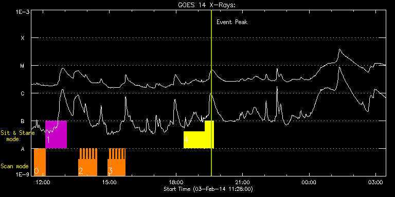 EIS Observation timeline overlay to GOES-Xray curve Code 1" 2" 40" 266" EIS Observations list for this event: STUDY ACRONYM ID DATE OBSERVED DESCRIPTION NOAA# TARGET 0 Atlas_30 | 38470 | 2014/02/03 11:35:40 | AR 11967 obs (Focused mode obs) | 1967 | Quiet Sun TIMELINE ID DATE OBSERVED FITS FILE XCEN (+W/-E) YCEN (+N/-S) DUR ----------------------------------------------------------------------------------------------------------------- 38470 | 2014/02/03 11:35:40.000 | eis_l0_20140203_113540.fits.gz | 40.08 | -138.15 | 31m38s 1 HPW021_VEL_001x512v1 | 38471 | 2014/02/03 12:07:36 | AR 11967 obs (Focused mode obs) | | Active Region TIMELINE ID DATE OBSERVED FITS FILE XCEN (+W/-E) YCEN (+N/-S) DUR ----------------------------------------------------------------------------------------------------------------- 38471 | 2014/02/03 12:07:36.000 | eis_l0_20140203_120736.fits.gz | 45.43 | -138.00 | 56m43s 2 HH_Flare_162x152 | 38555 | 2014/02/03 13:35:35 | AR11967 obs | 1967 | Flare TIMELINE ID DATE OBSERVED FITS FILE XCEN (+W/-E) YCEN (+N/-S) DUR ----------------------------------------------------------------------------------------------------------------- 38555 | 2014/02/03 13:35:35.000 | eis_l0_20140203_133535.fits.gz | 57.74 | -138.23 | 4m11s 38555 | 2014/02/03 13:39:49.000 | eis_l0_20140203_133949.fits.gz | 58.35 | -138.23 | 4m10s 38555 | 2014/02/03 13:44:02.000 | eis_l0_20140203_134402.fits.gz | 59.05 | -138.15 | 4m11s 38555 | 2014/02/03 13:48:15.000 | eis_l0_20140203_134815.fits.gz | 59.67 | -138.15 | 4m11s 38555 | 2014/02/03 13:52:29.000 | eis_l0_20140203_135229.fits.gz | 60.36 | -138.23 | 4m10s 38555 | 2014/02/03 13:56:42.000 | eis_l0_20140203_135642.fits.gz | 60.83 | -138.00 | 4m11s 38555 | 2014/02/03 14:00:55.000 | eis_l0_20140203_140055.fits.gz | 61.60 | -138.23 | 4m11s 38555 | 2014/02/03 14:05:09.000 | eis_l0_20140203_140509.fits.gz | 62.22 | -138.31 | 4m11s 38555 | 2014/02/03 14:09:23.000 | eis_l0_20140203_140923.fits.gz | 62.83 | -138.15 | 4m10s 38555 | 2014/02/03 14:13:36.000 | eis_l0_20140203_141336.fits.gz | 63.53 | -138.15 | 4m11s 38555 | 2014/02/03 14:17:49.000 | eis_l0_20140203_141749.fits.gz | 64.07 | -138.08 | 4m11s 38555 | 2014/02/03 14:22:03.000 | eis_l0_20140203_142203.fits.gz | 64.77 | -138.08 | 4m10s 3 HH_Flare_162x152 | 38564 | 2014/02/03 14:55:26 | AR11967 obs | | Flare TIMELINE ID DATE OBSERVED FITS FILE XCEN (+W/-E) YCEN (+N/-S) DUR ----------------------------------------------------------------------------------------------------------------- 38564 | 2014/02/03 14:55:26.000 | eis_l0_20140203_145526.fits.gz | 69.86 | -138.15 | 4m10s 38564 | 2014/02/03 14:59:39.000 | eis_l0_20140203_145939.fits.gz | 70.48 | -138.31 | 4m10s 38564 | 2014/02/03 15:03:52.000 | eis_l0_20140203_150352.fits.gz | 71.18 | -138.08 | 4m11s 38564 | 2014/02/03 15:08:06.000 | eis_l0_20140203_150806.fits.gz | 71.79 | -138.15 | 4m10s 38564 | 2014/02/03 15:12:19.000 | eis_l0_20140203_151219.fits.gz | 72.41 | -138.23 | 4m11s 38564 | 2014/02/03 15:16:33.000 | eis_l0_20140203_151633.fits.gz | 73.03 | -138.31 | 4m10s 38564 | 2014/02/03 15:20:46.000 | eis_l0_20140203_152046.fits.gz | 73.73 | -138.08 | 4m11s 38564 | 2014/02/03 15:24:59.000 | eis_l0_20140203_152459.fits.gz | 74.34 | -138.23 | 4m11s 38564 | 2014/02/03 15:29:13.000 | eis_l0_20140203_152913.fits.gz | 74.88 | -138.15 | 4m10s 38564 | 2014/02/03 15:33:26.000 | eis_l0_20140203_153326.fits.gz | 75.58 | -138.15 | 4m11s 38564 | 2014/02/03 15:37:40.000 | eis_l0_20140203_153740.fits.gz | 76.28 | -138.39 | 4m10s 38564 | 2014/02/03 15:41:53.000 | eis_l0_20140203_154153.fits.gz | 76.89 | -138.23 | 1m22s 4 Flare266_Hunter01 | 38563 | 2014/02/03 18:21:05 | EIS-FT obs (AR11967) | 1967 | Flare TIMELINE ID DATE OBSERVED FITS FILE XCEN (+W/-E) YCEN (+N/-S) DUR ----------------------------------------------------------------------------------------------------------------- 38563 | 2014/02/03 18:21:05.000 | eis_l0_20140203_182105.fits.gz | -26.27 | -118.30 | 56m22s 38563 | 2014/02/03 19:18:20.000 | eis_l0_20140203_191820.fits.gz | -17.62 | -118.46 | 22m58s : Check study information : Download file : View thumbnails For this event, also check for: