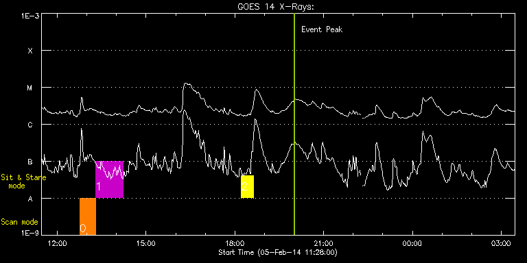 EIS Observation timeline overlay to GOES-Xray curve Code 1" 2" 40" 266" EIS Observations list for this event: STUDY ACRONYM ID DATE OBSERVED DESCRIPTION NOAA# TARGET 0 Atlas_30 | 38478 | 2014/02/05 12:45:34 | AR 11967 obs (Focused mode obs) | | Quiet Sun TIMELINE ID DATE OBSERVED FITS FILE XCEN (+W/-E) YCEN (+N/-S) DUR ----------------------------------------------------------------------------------------------------------------- 38478 | 2014/02/05 12:45:34.000 | eis_l0_20140205_124534.fits.gz | 472.20 | -129.43 | 31m39s 1 HPW021_VEL_001x512v1 | 38479 | 2014/02/05 13:17:31 | AR 11967 obs (Focused mode obs) | | Active Region TIMELINE ID DATE OBSERVED FITS FILE XCEN (+W/-E) YCEN (+N/-S) DUR ----------------------------------------------------------------------------------------------------------------- 38479 | 2014/02/05 13:17:31.000 | eis_l0_20140205_131731.fits.gz | 476.86 | -129.74 | 56m42s 2 Flare266_Hunter01 | 38567 | 2014/02/05 18:13:20 | EIS-FT obs (AR11967) | 1967 | Flare TIMELINE ID DATE OBSERVED FITS FILE XCEN (+W/-E) YCEN (+N/-S) DUR ----------------------------------------------------------------------------------------------------------------- 38567 | 2014/02/05 18:13:20.000 | eis_l0_20140205_181320.fits.gz | 382.83 | -132.13 | 23m56s : Check study information : Download file : View thumbnails For this event, also check for: