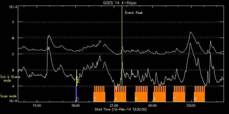 EIS Observation timeline overlay to GOES-Xray curve Code 1" 2" 40" 266" EIS Observations list for this event: STUDY ACRONYM ID DATE OBSERVED DESCRIPTION NOAA# TARGET 0 PRY_slot_contextLITE | 38652 | 2014/02/13 18:01:20 | Change of EIS pointing and alignment w | 1974 | Active Region TIMELINE ID DATE OBSERVED FITS FILE XCEN (+W/-E) YCEN (+N/-S) DUR ----------------------------------------------------------------------------------------------------------------- 38652 | 2014/02/13 18:01:20.000 | eis_l0_20140213_180120.fits.gz | -15.29 | -0.42 | 2m56s 1 Alignment_266 | 38653 | 2014/02/13 18:04:35 | Change of EIS pointing and alignment w | | Quiet Sun TIMELINE ID DATE OBSERVED FITS FILE XCEN (+W/-E) YCEN (+N/-S) DUR ----------------------------------------------------------------------------------------------------------------- 38653 | 2014/02/13 18:04:35.000 | eis_l0_20140213_180435.fits.gz | -132.64 | -0.50 | 1m22s 2 XRT_synop_AIA | 38654 | 2014/02/13 18:07:09 | Change of EIS pointing and alignment w | | Quiet Sun TIMELINE ID DATE OBSERVED FITS FILE XCEN (+W/-E) YCEN (+N/-S) DUR ----------------------------------------------------------------------------------------------------------------- 38654 | 2014/02/13 18:07:09.000 | eis_l0_20140213_180709.fits.gz | -132.49 | -0.58 | 10s 3 HH_Flare_162x152 | 38660 | 2014/02/13 19:23:50 | Flare mode observations. | | Flare TIMELINE ID DATE OBSERVED FITS FILE XCEN (+W/-E) YCEN (+N/-S) DUR ----------------------------------------------------------------------------------------------------------------- 38660 | 2014/02/13 19:23:50.000 | eis_l0_20140213_192350.fits.gz | 322.46 | -93.98 | 4m10s 38660 | 2014/02/13 19:28:03.000 | eis_l0_20140213_192803.fits.gz | 323.00 | -94.14 | 4m11s 38660 | 2014/02/13 19:32:17.000 | eis_l0_20140213_193217.fits.gz | 323.69 | -94.21 | 4m11s 38660 | 2014/02/13 19:36:30.000 | eis_l0_20140213_193630.fits.gz | 324.31 | -94.14 | 4m11s 38660 | 2014/02/13 19:40:44.000 | eis_l0_20140213_194044.fits.gz | 324.85 | -94.14 | 4m10s 38660 | 2014/02/13 19:44:57.000 | eis_l0_20140213_194457.fits.gz | 325.47 | -94.14 | 4m11s 38660 | 2014/02/13 19:49:11.000 | eis_l0_20140213_194911.fits.gz | 326.09 | -94.44 | 4m11s 38660 | 2014/02/13 19:53:24.000 | eis_l0_20140213_195324.fits.gz | 326.71 | -94.21 | 4m11s 38660 | 2014/02/13 19:57:38.000 | eis_l0_20140213_195738.fits.gz | 327.40 | -94.44 | 4m10s 38660 | 2014/02/13 20:01:51.000 | eis_l0_20140213_200151.fits.gz | 327.94 | -94.37 | 4m11s 38660 | 2014/02/13 20:06:05.000 | eis_l0_20140213_200605.fits.gz | 328.48 | -94.21 | 4m10s 38660 | 2014/02/13 20:10:18.000 | eis_l0_20140213_201018.fits.gz | 329.26 | -94.37 | 4m11s 38660 | 2014/02/13 20:14:31.000 | eis_l0_20140213_201431.fits.gz | 329.72 | -94.52 | 4m11s 4 HH_Flare_162x152 | 38661 | 2014/02/13 21:01:14 | Flare mode observations. | | Flare TIMELINE ID DATE OBSERVED FITS FILE XCEN (+W/-E) YCEN (+N/-S) DUR ----------------------------------------------------------------------------------------------------------------- 38661 | 2014/02/13 21:01:14.000 | eis_l0_20140213_210114.fits.gz | 336.36 | -94.68 | 4m11s 38661 | 2014/02/13 21:05:28.000 | eis_l0_20140213_210528.fits.gz | 336.98 | -94.68 | 4m11s 38661 | 2014/02/13 21:09:41.000 | eis_l0_20140213_210941.fits.gz | 337.68 | -94.60 | 4m11s 38661 | 2014/02/13 21:13:54.000 | eis_l0_20140213_211354.fits.gz | 338.22 | -94.83 | 4m11s 38661 | 2014/02/13 21:18:08.000 | eis_l0_20140213_211808.fits.gz | 338.76 | -94.68 | 4m11s 38661 | 2014/02/13 21:22:21.000 | eis_l0_20140213_212221.fits.gz | 339.45 | -94.75 | 4m11s 38661 | 2014/02/13 21:26:35.000 | eis_l0_20140213_212635.fits.gz | 340.07 | -94.83 | 4m11s 38661 | 2014/02/13 21:30:48.000 | eis_l0_20140213_213048.fits.gz | 340.61 | -94.91 | 4m11s 38661 | 2014/02/13 21:35:01.000 | eis_l0_20140213_213501.fits.gz | 341.23 | -94.91 | 4m11s 38661 | 2014/02/13 21:39:15.000 | eis_l0_20140213_213915.fits.gz | 341.85 | -94.91 | 4m11s 38661 | 2014/02/13 21:43:29.000 | eis_l0_20140213_214329.fits.gz | 342.39 | -94.75 | 4m10s 38661 | 2014/02/13 21:47:42.000 | eis_l0_20140213_214742.fits.gz | 343.08 | -94.83 | 4m11s 38661 | 2014/02/13 21:51:55.000 | eis_l0_20140213_215155.fits.gz | 343.62 | -95.06 | 4m11s 5 HH_Flare_162x152 | 38662 | 2014/02/13 22:36:43 | Flare mode observations. | | Flare TIMELINE ID DATE OBSERVED FITS FILE XCEN (+W/-E) YCEN (+N/-S) DUR ----------------------------------------------------------------------------------------------------------------- 38662 | 2014/02/13 22:36:43.000 | eis_l0_20140213_223643.fits.gz | 349.96 | -95.22 | 4m11s 38662 | 2014/02/13 22:40:56.000 | eis_l0_20140213_224056.fits.gz | 350.58 | -95.29 | 4m11s 38662 | 2014/02/13 22:45:10.000 | eis_l0_20140213_224510.fits.gz | 351.19 | -95.22 | 4m10s 38662 | 2014/02/13 22:49:23.000 | eis_l0_20140213_224923.fits.gz | 351.73 | -95.29 | 4m11s 38662 | 2014/02/13 22:53:37.000 | eis_l0_20140213_225337.fits.gz | 352.35 | -95.29 | 4m10s 38662 | 2014/02/13 22:57:50.000 | eis_l0_20140213_225750.fits.gz | 352.97 | -95.45 | 4m10s 38662 | 2014/02/13 23:02:02.000 | eis_l0_20140213_230202.fits.gz | 353.51 | -95.29 | 4m11s 38662 | 2014/02/13 23:06:16.000 | eis_l0_20140213_230616.fits.gz | 354.21 | -95.37 | 4m11s 38662 | 2014/02/13 23:10:30.000 | eis_l0_20140213_231030.fits.gz | 354.82 | -95.53 | 4m10s 38662 | 2014/02/13 23:14:43.000 | eis_l0_20140213_231443.fits.gz | 355.36 | -95.45 | 4m10s 38662 | 2014/02/13 23:18:56.000 | eis_l0_20140213_231856.fits.gz | 355.91 | -95.45 | 4m11s 38662 | 2014/02/13 23:23:10.000 | eis_l0_20140213_232310.fits.gz | 356.52 | -95.29 | 4m11s 38662 | 2014/02/13 23:27:23.000 | eis_l0_20140213_232723.fits.gz | 357.14 | -95.45 | 4m11s 38662 | 2014/02/13 23:31:37.000 | eis_l0_20140213_233137.fits.gz | 357.84 | -95.68 | 4m10s 6 HH_Flare_162x152 | 38663 | 2014/02/14 00:01:43 | Flare mode observations. | | Flare TIMELINE ID DATE OBSERVED FITS FILE XCEN (+W/-E) YCEN (+N/-S) DUR ----------------------------------------------------------------------------------------------------------------- 3