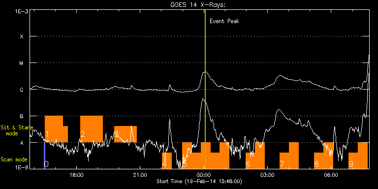 EIS Observation timeline overlay to GOES-Xray curve Code 1" 2" 40" 266" EIS Observations list for this event: STUDY ACRONYM ID DATE OBSERVED DESCRIPTION NOAA# TARGET 0 PRY_slot_contextLITE | 38784 | 2014/02/19 16:28:19 | Slot context for spicule observations | | Active Region TIMELINE ID DATE OBSERVED FITS FILE XCEN (+W/-E) YCEN (+N/-S) DUR ----------------------------------------------------------------------------------------------------------------- 38784 | 2014/02/19 16:28:19.000 | eis_l0_20140219_162819.fits.gz | -9878.95 | -9943.20 | 2m57s 1 vhh_slowar_sas_1h6m | 38785 | 2014/02/19 16:31:40 | Spicule observations with IRIS. | | Active Region TIMELINE ID DATE OBSERVED FITS FILE XCEN (+W/-E) YCEN (+N/-S) DUR ----------------------------------------------------------------------------------------------------------------- 38785 | 2014/02/19 16:31:40.000 | eis_l0_20140219_163140.fits.gz | -9854.98 | -9943.20 | 49m44s 38785 | 2014/02/19 16:48:57.000 | eis_l0_20140219_164857.fits.gz | -9854.98 | -9943.20 | 45m32s 2 vhh_slowar_sas_1h6m | 38786 | 2014/02/19 18:10:39 | Spicule observations with IRIS. | | Active Region TIMELINE ID DATE OBSERVED FITS FILE XCEN (+W/-E) YCEN (+N/-S) DUR ----------------------------------------------------------------------------------------------------------------- 38786 | 2014/02/19 18:10:39.000 | eis_l0_20140219_181039.fits.gz | -9854.98 | -9943.20 | 1h2m49s 3 vhh_slowar_sas_1h6m | 38787 | 2014/02/19 19:47:08 | Spicule observations with IRIS. | | Active Region TIMELINE ID DATE OBSERVED FITS FILE XCEN (+W/-E) YCEN (+N/-S) DUR ----------------------------------------------------------------------------------------------------------------- 38787 | 2014/02/19 19:47:08.000 | eis_l0_20140219_194708.fits.gz | -9854.98 | -9943.20 | 1h2m50s 4 PRY_footpoints_lite | 38772 | 2014/02/19 22:02:39 | Hot plasma properties in active region | | Active Region TIMELINE ID DATE OBSERVED FITS FILE XCEN (+W/-E) YCEN (+N/-S) DUR ----------------------------------------------------------------------------------------------------------------- 38772 | 2014/02/19 22:02:39.000 | eis_l0_20140219_220239.fits.gz | 610.67 | -72.19 | 26m22s 5 PRY_footpoints_lite | 38773 | 2014/02/19 22:59:13 | Hot plasma properties in active region | | Active Region TIMELINE ID DATE OBSERVED FITS FILE XCEN (+W/-E) YCEN (+N/-S) DUR ----------------------------------------------------------------------------------------------------------------- 38773 | 2014/02/19 22:59:13.000 | eis_l0_20140219_225913.fits.gz | 617.32 | -72.89 | 26m22s 38773 | 2014/02/19 23:25:38.000 | eis_l0_20140219_232538.fits.gz | 620.41 | -73.27 | 26m23s 38773 | 2014/02/19 23:52:04.000 | eis_l0_20140219_235204.fits.gz | 623.58 | -73.82 | 26m22s 38773 | 2014/02/20 00:18:29.000 | eis_l0_20140220_001829.fits.gz | 626.59 | -73.82 | 26m23s 38773 | 2014/02/20 00:44:55.000 | eis_l0_20140220_004455.fits.gz | 629.68 | -74.28 | 26m22s 6 PRY_footpoints_lite | 38774 | 2014/02/20 01:58:12 | Hot plasma properties in active region | 1977 | Active Region TIMELINE ID DATE OBSERVED FITS FILE XCEN (+W/-E) YCEN (+N/-S) DUR ----------------------------------------------------------------------------------------------------------------- 38774 | 2014/02/20 01:58:12.000 | eis_l0_20140220_015812.fits.gz | 638.17 | -75.05 | 26m23s 38774 | 2014/02/20 02:24:38.000 | eis_l0_20140220_022438.fits.gz | 641.19 | -75.36 | 26m22s 7 PRY_footpoints_lite | 38775 | 2014/02/20 03:35:13 | Hot plasma properties in active region | 1977 | Active Region TIMELINE ID DATE OBSERVED FITS FILE XCEN (+W/-E) YCEN (+N/-S) DUR ----------------------------------------------------------------------------------------------------------------- 38775 | 2014/02/20 03:35:13.000 | eis_l0_20140220_033513.fits.gz | 649.22 | -76.36 | 26m22s 38775 | 2014/02/20 04:01:38.000 | eis_l0_20140220_040138.fits.gz | 652.16 | -76.60 | 26m22s 8 PRY_footpoints_lite | 38776 | 2014/02/20 05:12:42 | Hot plasma properties in active region | 1977 | Active Region TIMELINE ID DATE OBSERVED FITS FILE XCEN (+W/-E) YCEN (+N/-S) DUR ----------------------------------------------------------------------------------------------------------------- 38776 | 2014/02/20 05:12:42.000 | eis_l0_20140220_051242.fits.gz | 660.11 | -77.45 | 26m22s 38776 | 2014/02/20 05:39:07.000 | eis_l0_20140220_053907.fits.gz | 663.13 | -77.75 | 26m23s 9 PRY_footpoints_lite | 38777 | 2014/02/20 06:50:12 | Hot plasma properties in active region | 1977 | Active Region TIMELINE ID DATE OBSERVED FITS FILE XCEN (+W/-E) YCEN (+N/-S) DUR ----------------------------------------------------------------------------------------------------------------- 38777 | 2014/02/20 06:50:12.000 | eis_l0_20140220_065012.fits.gz | 670.93 | -78.60 | 26m22s 38777 | 2014/02/20 07:16:38.000 | eis_l0_20140220_071638.fits.gz | 673.86 | -79.07 | 26m22s : Check study information : Download file : View thumbnails For this event, also check for: