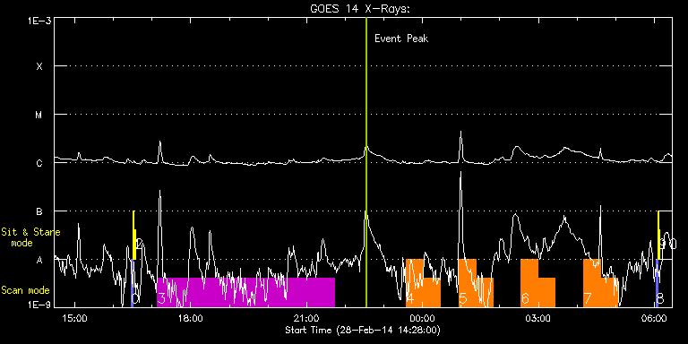 EIS Observation timeline overlay to GOES-Xray curve Code 1" 2" 40" 266" EIS Observations list for this event: STUDY ACRONYM ID DATE OBSERVED DESCRIPTION NOAA# TARGET 0 PRY_slot_contextLITE | 38898 | 2014/02/28 16:27:19 | Synoptic observations | 1987 | Active Region TIMELINE ID DATE OBSERVED FITS FILE XCEN (+W/-E) YCEN (+N/-S) DUR ----------------------------------------------------------------------------------------------------------------- 38898 | 2014/02/28 16:27:19.000 | eis_l0_20140228_162719.fits.gz | -15.21 | -0.42 | 2m57s 1 Alignment_266 | 38899 | 2014/02/28 16:30:57 | Synoptic observations | 1992 | Quiet Sun TIMELINE ID DATE OBSERVED FITS FILE XCEN (+W/-E) YCEN (+N/-S) DUR ----------------------------------------------------------------------------------------------------------------- 38899 | 2014/02/28 16:30:57.000 | eis_l0_20140228_163057.fits.gz | -132.49 | -0.42 | 1m22s 2 XRT_synop_AIA | 38900 | 2014/02/28 16:33:46 | Synoptic observations | 1992 | Quiet Sun TIMELINE ID DATE OBSERVED FITS FILE XCEN (+W/-E) YCEN (+N/-S) DUR ----------------------------------------------------------------------------------------------------------------- 38900 | 2014/02/28 16:33:46.000 | eis_l0_20140228_163346.fits.gz | -132.57 | -0.50 | 10s 3 SK_CH_DIAG_320x384 | 38912 | 2014/02/28 17:08:03 | HOP 206 | | Coronal Hole TIMELINE ID DATE OBSERVED FITS FILE XCEN (+W/-E) YCEN (+N/-S) DUR ----------------------------------------------------------------------------------------------------------------- 38912 | 2014/02/28 17:08:03.000 | eis_l0_20140228_170803.fits.gz | 0.27 | -920.37 | 4h35m37s 4 PRY_footpoints_lite | 38917 | 2014/02/28 23:34:26 | HOP 246 | | Active Region TIMELINE ID DATE OBSERVED FITS FILE XCEN (+W/-E) YCEN (+N/-S) DUR ----------------------------------------------------------------------------------------------------------------- 38917 | 2014/02/28 23:34:26.000 | eis_l0_20140228_233426.fits.gz | -412.38 | -139.78 | 26m23s 38917 | 2014/03/01 00:00:52.000 | eis_l0_20140301_000052.fits.gz | -408.60 | -139.78 | 26m22s 5 PRY_footpoints_lite | 38914 | 2014/03/01 00:56:43 | HOP 246 | 1990 | Active Region TIMELINE ID DATE OBSERVED FITS FILE XCEN (+W/-E) YCEN (+N/-S) DUR ----------------------------------------------------------------------------------------------------------------- 38914 | 2014/03/01 00:56:43.000 | eis_l0_20140301_005643.fits.gz | -401.03 | -139.08 | 26m21s 38914 | 2014/03/01 01:23:07.000 | eis_l0_20140301_012307.fits.gz | -397.39 | -139.08 | 26m23s 6 PRY_footpoints_lite | 38915 | 2014/03/01 02:33:10 | HOP 246 | 1990 | Active Region TIMELINE ID DATE OBSERVED FITS FILE XCEN (+W/-E) YCEN (+N/-S) DUR ----------------------------------------------------------------------------------------------------------------- 38915 | 2014/03/01 02:33:10.000 | eis_l0_20140301_023310.fits.gz | -387.89 | -138.39 | 26m22s 38915 | 2014/03/01 02:59:35.000 | eis_l0_20140301_025935.fits.gz | -384.26 | -138.23 | 26m23s 7 PRY_footpoints_lite | 38916 | 2014/03/01 04:10:09 | HOP 246 | 1990 | Active Region TIMELINE ID DATE OBSERVED FITS FILE XCEN (+W/-E) YCEN (+N/-S) DUR ----------------------------------------------------------------------------------------------------------------- 38916 | 2014/03/01 04:10:09.000 | eis_l0_20140301_041009.fits.gz | -374.61 | -137.69 | 26m22s 38916 | 2014/03/01 04:36:35.000 | eis_l0_20140301_043635.fits.gz | -370.90 | -137.46 | 26m22s 8 PRY_slot_contextLITE | 38901 | 2014/03/01 06:02:19 | Synoptic observations | 1992 | Active Region TIMELINE ID DATE OBSERVED FITS FILE XCEN (+W/-E) YCEN (+N/-S) DUR ----------------------------------------------------------------------------------------------------------------- 38901 | 2014/03/01 06:02:19.000 | eis_l0_20140301_060219.fits.gz | -15.21 | -0.42 | 2m57s 9 Alignment_266 | 38902 | 2014/03/01 06:05:57 | Synoptic observations | 1989 | Quiet Sun TIMELINE ID DATE OBSERVED FITS FILE XCEN (+W/-E) YCEN (+N/-S) DUR ----------------------------------------------------------------------------------------------------------------- 38902 | 2014/03/01 06:05:57.000 | eis_l0_20140301_060557.fits.gz | -132.49 | -0.42 | 1m22s 10 XRT_synop_AIA | 38903 | 2014/03/01 06:08:46 | Synoptic observations | 1989 | Quiet Sun TIMELINE ID DATE OBSERVED FITS FILE XCEN (+W/-E) YCEN (+N/-S) DUR ----------------------------------------------------------------------------------------------------------------- 38903 | 2014/03/01 06:08:46.000 | eis_l0_20140301_060846.fits.gz | -132.49 | -0.50 | 10s : Check study information : Download file : View thumbnails For this event, also check for: