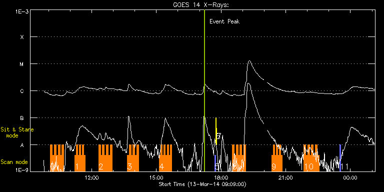 EIS Observation timeline overlay to GOES-Xray curve Code 1" 2" 40" 266" EIS Observations list for this event: STUDY ACRONYM ID DATE OBSERVED DESCRIPTION NOAA# TARGET 0 HH_Flare+AR_180x152 | 39163 | 2014/03/13 10:05:13 | AR19996 raster scan obs at NW-limb | 1996 | Flare TIMELINE ID DATE OBSERVED FITS FILE XCEN (+W/-E) YCEN (+N/-S) DUR ----------------------------------------------------------------------------------------------------------------- 39163 | 2014/03/13 10:05:13.000 | eis_l0_20140313_100513.fits.gz | 981.24 | 311.28 | 5m18s 39163 | 2014/03/13 10:10:34.000 | eis_l0_20140313_101034.fits.gz | 981.24 | 311.28 | 5m18s 39163 | 2014/03/13 10:15:54.000 | eis_l0_20140313_101554.fits.gz | 981.17 | 311.35 | 5m18s 39163 | 2014/03/13 10:21:15.000 | eis_l0_20140313_102115.fits.gz | 981.17 | 311.35 | 5m18s 39163 | 2014/03/13 10:26:36.000 | eis_l0_20140313_102636.fits.gz | 981.24 | 311.35 | 5m18s 39163 | 2014/03/13 10:31:56.000 | eis_l0_20140313_103156.fits.gz | 981.17 | 311.35 | 5m18s 39163 | 2014/03/13 10:37:17.000 | eis_l0_20140313_103717.fits.gz | 981.17 | 311.35 | 5m18s 1 HH_Flare_162x152 | 39158 | 2014/03/13 11:12:53 | AR19996 raster scan obs at NW-limb | 1996 | Flare TIMELINE ID DATE OBSERVED FITS FILE XCEN (+W/-E) YCEN (+N/-S) DUR ----------------------------------------------------------------------------------------------------------------- 39158 | 2014/03/13 11:12:53.000 | eis_l0_20140313_111253.fits.gz | 982.66 | 311.43 | 4m11s 39158 | 2014/03/13 11:17:07.000 | eis_l0_20140313_111707.fits.gz | 982.74 | 311.51 | 4m10s 39158 | 2014/03/13 11:21:20.000 | eis_l0_20140313_112120.fits.gz | 982.66 | 311.51 | 4m11s 39158 | 2014/03/13 11:25:34.000 | eis_l0_20140313_112534.fits.gz | 982.74 | 311.43 | 4m10s 39158 | 2014/03/13 11:29:47.000 | eis_l0_20140313_112947.fits.gz | 982.59 | 311.28 | 4m10s 39158 | 2014/03/13 11:34:00.000 | eis_l0_20140313_113400.fits.gz | 982.66 | 311.35 | 4m11s 39158 | 2014/03/13 11:38:14.000 | eis_l0_20140313_113814.fits.gz | 982.59 | 311.35 | 4m10s 2 HH_Flare+AR_180x152 | 39166 | 2014/03/13 12:19:14 | AR19996 raster scan obs at NW-limb | 1996 | Flare TIMELINE ID DATE OBSERVED FITS FILE XCEN (+W/-E) YCEN (+N/-S) DUR ----------------------------------------------------------------------------------------------------------------- 39166 | 2014/03/13 12:19:14.000 | eis_l0_20140313_121914.fits.gz | 981.24 | 311.43 | 5m18s 39166 | 2014/03/13 12:24:35.000 | eis_l0_20140313_122435.fits.gz | 981.24 | 311.28 | 5m18s 39166 | 2014/03/13 12:29:56.000 | eis_l0_20140313_122956.fits.gz | 981.17 | 311.28 | 5m18s 39166 | 2014/03/13 12:35:16.000 | eis_l0_20140313_123516.fits.gz | 981.09 | 311.43 | 5m18s 39166 | 2014/03/13 12:40:36.000 | eis_l0_20140313_124036.fits.gz | 981.24 | 311.51 | 5m18s 39166 | 2014/03/13 12:45:57.000 | eis_l0_20140313_124557.fits.gz | 981.24 | 311.43 | 5m18s 39166 | 2014/03/13 12:51:18.000 | eis_l0_20140313_125118.fits.gz | 981.17 | 311.28 | 5m17s 3 HH_Flare+AR_180x152 | 39150 | 2014/03/13 13:38:50 | AR19996 raster scan obs at NW-limb | 1996 | Flare TIMELINE ID DATE OBSERVED FITS FILE XCEN (+W/-E) YCEN (+N/-S) DUR ----------------------------------------------------------------------------------------------------------------- 39150 | 2014/03/13 13:38:50.000 | eis_l0_20140313_133850.fits.gz | 981.17 | 311.28 | 5m18s 39150 | 2014/03/13 13:44:11.000 | eis_l0_20140313_134411.fits.gz | 981.17 | 311.35 | 5m18s 39150 | 2014/03/13 13:49:32.000 | eis_l0_20140313_134932.fits.gz | 981.17 | 311.35 | 5m18s 39150 | 2014/03/13 13:54:53.000 | eis_l0_20140313_135453.fits.gz | 981.17 | 311.35 | 5m17s 39150 | 2014/03/13 14:00:13.000 | eis_l0_20140313_140013.fits.gz | 981.17 | 311.35 | 5m18s 39150 | 2014/03/13 14:05:34.000 | eis_l0_20140313_140534.fits.gz | 981.24 | 311.43 | 5m17s 4 HH_Flare_162x152 | 39160 | 2014/03/13 15:08:24 | AR19996 raster scan obs at NW-limb | 1996 | Flare TIMELINE ID DATE OBSERVED FITS FILE XCEN (+W/-E) YCEN (+N/-S) DUR ----------------------------------------------------------------------------------------------------------------- 39160 | 2014/03/13 15:08:24.000 | eis_l0_20140313_150824.fits.gz | 982.66 | 311.35 | 4m10s 39160 | 2014/03/13 15:12:37.000 | eis_l0_20140313_151237.fits.gz | 982.74 | 311.35 | 4m11s 39160 | 2014/03/13 15:16:51.000 | eis_l0_20140313_151651.fits.gz | 982.74 | 311.28 | 4m10s 39160 | 2014/03/13 15:21:04.000 | eis_l0_20140313_152104.fits.gz | 982.74 | 311.28 | 4m11s 39160 | 2014/03/13 15:25:18.000 | eis_l0_20140313_152518.fits.gz | 982.74 | 311.35 | 4m10s 39160 | 2014/03/13 15:29:31.000 | eis_l0_20140313_152931.fits.gz | 982.59 | 311.35 | 4m11s 39160 | 2014/03/13 15:33:45.000 | eis_l0_20140313_153345.fits.gz | 982.66 | 311.35 | 4m10s 39160 | 2014/03/13 15:37:58.000 | eis_l0_20140313_153758.fits.gz | 982.74 | 311.51 | 4m11s 5 PRY_slot_contextLITE | 39109 | 2014/03/13 17:42:20 | EIS-AIA alignment | 2002 | Active Region TIMELINE ID DATE OBSERVED FITS FILE XCEN (+W/-E) YCEN (+N/-S) DUR ----------------------------------------------------------------------------------------------------------------- 39109 | 2014/03/13 17:42:20.000 | eis_l0_20140313_174220.fits.gz | -15.21 | -0.27 | 2m56s 6 Alignment_266 | 39110 | 2014/03/13 17:45:35 | EIS-AIA alignment | 2002 | Quiet Sun TIMELINE ID DATE OBSERVED FITS FILE XCEN (+W/-E) YCEN (+N/-S) DUR ----------------------------------------------------------------------------------------------------------------- 39110 | 2014/03/13 17:45:35.000 | eis_l0_20140313_174535.fits.gz | -132.49 | -0.35 | 1m22s 7 XRT_synop_AIA | 39111 | 2014/03/13 17:48:09 | EIS-AIA alignment | 2002 | Quiet Sun TIMELINE ID DATE OBSERVED FITS FILE XCEN (+W/-E) YCEN (+N/-S) DUR ----------------------------------------------------------------------------------------------------------------- 39111 | 2014/03/13 17:48:09.000 | eis_l0_20140313_174809.fits.gz | -132.57 | -0.58 | 10s 8 HH_Flare+AR_180x152 | 39152 | 2014/03/13 18:31:06 | AR19996 raster scan obs at NW-limb | 1996 | Flare TIMELINE ID DATE OBSERVED FITS FILE XCEN (+W/-E) YCEN (