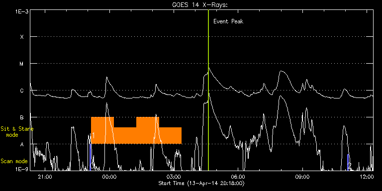 EIS Observation timeline overlay to GOES-Xray curve Code 1" 2" 40" 266" EIS Observations list for this event: STUDY ACRONYM ID DATE OBSERVED DESCRIPTION NOAA# TARGET 0 PRY_slot_contextLITE | 39649 | 2014/04/13 23:05:26 | IHOP 249 | | Active Region TIMELINE ID DATE OBSERVED FITS FILE XCEN (+W/-E) YCEN (+N/-S) DUR ----------------------------------------------------------------------------------------------------------------- 39649 | 2014/04/13 23:05:26.000 | eis_l0_20140413_230526.fits.gz | -21.20 | 919.37 | 2m57s 1 vhh_slowar_sas_1h6m | 39650 | 2014/04/13 23:09:33 | IHOP 249 | | Active Region TIMELINE ID DATE OBSERVED FITS FILE XCEN (+W/-E) YCEN (+N/-S) DUR ----------------------------------------------------------------------------------------------------------------- 39650 | 2014/04/13 23:09:33.000 | eis_l0_20140413_230933.fits.gz | -6.71 | 999.45 | 1h2m50s 39650 | 2014/04/14 00:12:26.000 | eis_l0_20140414_001226.fits.gz | -6.71 | 999.37 | 1h2m51s 39650 | 2014/04/14 01:15:20.000 | eis_l0_20140414_011520.fits.gz | -6.63 | 999.29 | 1h2m51s 39650 | 2014/04/14 02:18:14.000 | eis_l0_20140414_021814.fits.gz | -6.63 | 999.52 | 1h2m50s 2 PRY_slot_context_v3 | 39651 | 2014/04/14 11:05:19 | AR12032 observations | 2032 | Active Region TIMELINE ID DATE OBSERVED FITS FILE XCEN (+W/-E) YCEN (+N/-S) DUR ----------------------------------------------------------------------------------------------------------------- 39651 | 2014/04/14 11:05:19.000 | eis_l0_20140414_110519.fits.gz | 13.72 | 350.51 | 2m57s : Check study information : Download file : View thumbnails For this event, also check for: