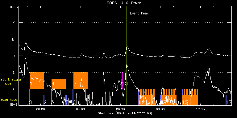 EIS Observation timeline overlay to GOES-Xray curve Code 1" 2" 40" 266" EIS Observations list for this event: STUDY ACRONYM ID DATE OBSERVED DESCRIPTION NOAA# TARGET 0 PRY_slot_context_v3 | 40286 | 2014/05/06 23:07:20 | HOP 248 - coronal rain diagnostics | 2047 | Active Region TIMELINE ID DATE OBSERVED FITS FILE XCEN (+W/-E) YCEN (+N/-S) DUR ----------------------------------------------------------------------------------------------------------------- 40286 | 2014/05/06 23:07:20.000 | eis_l0_20140506_230720.fits.gz | 906.66 | -186.59 | 2m57s 1 vhh_slowar_sas_1h6m | 40287 | 2014/05/06 23:10:42 | HOP 248 - coronal rain diagnostics | | Active Region TIMELINE ID DATE OBSERVED FITS FILE XCEN (+W/-E) YCEN (+N/-S) DUR ----------------------------------------------------------------------------------------------------------------- 40287 | 2014/05/06 23:10:42.000 | eis_l0_20140506_231042.fits.gz | 956.34 | -179.67 | 1h2m49s 2 PRY_slot_context_v3 | 40288 | 2014/05/07 00:13:42 | HOP 248 - coronal rain diagnostics | 2047 | Active Region TIMELINE ID DATE OBSERVED FITS FILE XCEN (+W/-E) YCEN (+N/-S) DUR ----------------------------------------------------------------------------------------------------------------- 40288 | 2014/05/07 00:13:42.000 | eis_l0_20140507_001342.fits.gz | 906.66 | -186.43 | 2m57s 3 PRY_slot_context_v3 | 40289 | 2014/05/07 00:46:42 | HOP 248 - coronal rain diagnostics | 2047 | Active Region TIMELINE ID DATE OBSERVED FITS FILE XCEN (+W/-E) YCEN (+N/-S) DUR ----------------------------------------------------------------------------------------------------------------- 40289 | 2014/05/07 00:46:42.000 | eis_l0_20140507_004642.fits.gz | 906.66 | -186.51 | 2m56s 4 vhh_slowar_sas_1h6m | 40290 | 2014/05/07 00:50:03 | HOP 248 - coronal rain diagnostics | | Active Region TIMELINE ID DATE OBSERVED FITS FILE XCEN (+W/-E) YCEN (+N/-S) DUR ----------------------------------------------------------------------------------------------------------------- 40290 | 2014/05/07 00:50:03.000 | eis_l0_20140507_005003.fits.gz | 956.34 | -179.67 | 1h2m49s 5 PRY_slot_context_v3 | 40291 | 2014/05/07 01:53:03 | HOP 248 - coronal rain diagnostics | 2047 | Active Region TIMELINE ID DATE OBSERVED FITS FILE XCEN (+W/-E) YCEN (+N/-S) DUR ----------------------------------------------------------------------------------------------------------------- 40291 | 2014/05/07 01:53:03.000 | eis_l0_20140507_015303.fits.gz | 906.66 | -186.51 | 2m57s 6 PRY_slot_context_v3 | 40292 | 2014/05/07 02:24:41 | HOP 248 - coronal rain diagnostics | 2047 | Active Region TIMELINE ID DATE OBSERVED FITS FILE XCEN (+W/-E) YCEN (+N/-S) DUR ----------------------------------------------------------------------------------------------------------------- 40292 | 2014/05/07 02:24:41.000 | eis_l0_20140507_022441.fits.gz | 906.66 | -186.28 | 2m56s 7 vhh_slowar_sas_1h6m | 40293 | 2014/05/07 02:28:02 | HOP 248 - coronal rain diagnostics | | Active Region TIMELINE ID DATE OBSERVED FITS FILE XCEN (+W/-E) YCEN (+N/-S) DUR ----------------------------------------------------------------------------------------------------------------- 40293 | 2014/05/07 02:28:02.000 | eis_l0_20140507_022802.fits.gz | 956.34 | -179.51 | 1h2m49s 8 PRY_slot_context_v3 | 40294 | 2014/05/07 03:31:03 | HOP 248 - coronal rain diagnostics | 2047 | Active Region TIMELINE ID DATE OBSERVED FITS FILE XCEN (+W/-E) YCEN (+N/-S) DUR ----------------------------------------------------------------------------------------------------------------- 40294 | 2014/05/07 03:31:03.000 | eis_l0_20140507_033103.fits.gz | 906.74 | -186.74 | 2m56s 9 regcal071 | 40280 | 2014/05/07 06:02:12 | Dark exposures, CCD bottom rows (100s | | Engineering TIMELINE ID DATE OBSERVED FITS FILE XCEN (+W/-E) YCEN (+N/-S) DUR ----------------------------------------------------------------------------------------------------------------- 40280 | 2014/05/07 06:02:12.000 | eis_l0_20140507_060212.fits.gz | 14.51 | -305.27 | 3m22s 10 regcal072 | 40281 | 2014/05/07 06:06:00 | Dark exposures, top CCD rows (100s exp | | Engineering TIMELINE ID DATE OBSERVED FITS FILE XCEN (+W/-E) YCEN (+N/-S) DUR ----------------------------------------------------------------------------------------------------------------- 40281 | 2014/05/07 06:06:00.000 | eis_l0_20140507_060600.fits.gz | 14.59 | 205.58 | 3m22s 11 PRY_slot_context_v3 | 40295 | 2014/05/07 07:19:13 | | 2052 | Active Region TIMELINE ID DATE OBSERVED FITS FILE XCEN (+W/-E) YCEN (+N/-S) DUR ----------------------------------------------------------------------------------------------------------------- 40295 | 2014/05/07 07:19:13.000 | eis_l0_20140507_071913.fits.gz | -108.37 | 13.48 | 2m57s 12 Cor_Hole_Jet_v1 | 40296 | 2014/05/07 07:22:35 | Hinode - La Palma joint observation (q | | Quiet Sun TIMELINE ID DATE OBSERVED FITS FILE XCEN (+W/-E) YCEN (+N/-S) DUR ----------------------------------------------------------------------------------------------------------------- 40296 | 2014/05/07 07:22:35.000 | eis_l0_20140507_072235.fits.gz | -91.85 | 14.79 | 5m47s 40296 | 2014/05/07 07:28:25.000 | eis_l0_20140507_072825.fits.gz | -90.92 | 14.79 | 5m46s 40296 | 2014/05/07 07:34:14.000 | eis_l0_20140507_073414.fits.gz | -90.07 | 14.79 | 5m47s 40296 | 2014/05/07 07:40:04.000 | eis_l0_20140507_074004.fits.gz | -89.14 | 14.56 | 5m46s 40296 | 2014/05/07 07:45:53.000 | eis_l0_20140507_074553.fits.gz | -88.21 | 14.79 | 5m47s 40296 | 2014/05/07 07:51:43.000 | eis_l0_20140507_075143.fits.gz | -87.36 | 14.64 | 5m47s 40296 | 2014/05/07 07:57:33.000 | eis_l0_20140507_075733.fits.gz | -86.44 | 14.64 | 5m46s 40296 | 2014/05/07 08:03:22.000 | eis_l0_20140507_080322.fits.gz | -85.67 | 14.56 | 5m47s 40296 | 2014/05/07 08:09:12.000 | eis_l0_20140507_080912.fits.gz | -84.66 | 14.71 | 5m47s 40296 | 2014/05/07 08:15:02.000 | eis_l0_20140507_081502.fits.gz | -83.73 | 14.71 | 5m47s 40296 | 2014/05/07 08:20:52.000 | eis_l0_20140507_082052.fits.gz | -82.81 | 14.56 | 5m47s 40296 | 2014/05/07 08:26: