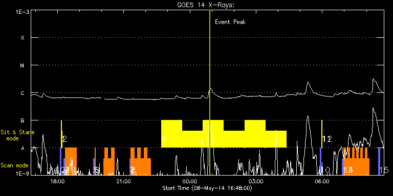 EIS Observation timeline overlay to GOES-Xray curve Code 1" 2" 40" 266" EIS Observations list for this event: STUDY ACRONYM ID DATE OBSERVED DESCRIPTION NOAA# TARGET 0 PRY_slot_contextLITE | 40312 | 2014/05/08 18:07:20 | EIS-AIA alignment study | 2053 | Active Region TIMELINE ID DATE OBSERVED FITS FILE XCEN (+W/-E) YCEN (+N/-S) DUR ----------------------------------------------------------------------------------------------------------------- 40312 | 2014/05/08 18:07:20.000 | eis_l0_20140508_180720.fits.gz | -15.21 | -0.35 | 2m56s 1 Alignment_266 | 40313 | 2014/05/08 18:10:35 | EIS-AIA alignment study | | Quiet Sun TIMELINE ID DATE OBSERVED FITS FILE XCEN (+W/-E) YCEN (+N/-S) DUR ----------------------------------------------------------------------------------------------------------------- 40313 | 2014/05/08 18:10:35.000 | eis_l0_20140508_181035.fits.gz | -132.57 | -0.42 | 1m22s 2 XRT_synop_AIA | 40314 | 2014/05/08 18:13:09 | EIS-AIA alignment study | | Quiet Sun TIMELINE ID DATE OBSERVED FITS FILE XCEN (+W/-E) YCEN (+N/-S) DUR ----------------------------------------------------------------------------------------------------------------- 40314 | 2014/05/08 18:13:09.000 | eis_l0_20140508_181309.fits.gz | -132.57 | -0.50 | 10s 3 PRY_slot_context_v3 | 40361 | 2014/05/08 18:17:27 | | 2049 | Active Region TIMELINE ID DATE OBSERVED FITS FILE XCEN (+W/-E) YCEN (+N/-S) DUR ----------------------------------------------------------------------------------------------------------------- 40361 | 2014/05/08 18:17:27.000 | eis_l0_20140508_181727.fits.gz | 874.68 | -304.32 | 2m56s 4 Atlas_30 | 40362 | 2014/05/08 18:20:49 | EIS spectral atlas - active region at | | Quiet Sun TIMELINE ID DATE OBSERVED FITS FILE XCEN (+W/-E) YCEN (+N/-S) DUR ----------------------------------------------------------------------------------------------------------------- 40362 | 2014/05/08 18:20:49.000 | eis_l0_20140508_182049.fits.gz | 943.58 | -312.24 | 31m38s 5 PRY_slot_context_v3 | 40357 | 2014/05/08 19:38:20 | | 2049 | Active Region TIMELINE ID DATE OBSERVED FITS FILE XCEN (+W/-E) YCEN (+N/-S) DUR ----------------------------------------------------------------------------------------------------------------- 40357 | 2014/05/08 19:38:20.000 | eis_l0_20140508_193820.fits.gz | 874.68 | -304.32 | 2m56s 6 FlareResponse01 | 40358 | 2014/05/08 19:41:42 | AR/flare observation | | Flare TIMELINE ID DATE OBSERVED FITS FILE XCEN (+W/-E) YCEN (+N/-S) DUR ----------------------------------------------------------------------------------------------------------------- 40358 | 2014/05/08 19:41:42.000 | eis_l0_20140508_194142.fits.gz | 969.04 | -289.32 | 1m38s 40358 | 2014/05/08 20:05:25.000 | eis_l0_20140508_200525.fits.gz | 968.96 | -289.39 | 2m59s 40358 | 2014/05/08 20:08:27.000 | eis_l0_20140508_200827.fits.gz | 968.96 | -289.39 | 8m52s 40358 | 2014/05/08 20:17:22.000 | eis_l0_20140508_201722.fits.gz | 968.96 | -289.32 | 8m52s 40358 | 2014/05/08 20:26:17.000 | eis_l0_20140508_202617.fits.gz | 969.04 | -289.32 | 8m52s 7 PRY_slot_context_v3 | 40359 | 2014/05/08 21:16:20 | | 2049 | Active Region TIMELINE ID DATE OBSERVED FITS FILE XCEN (+W/-E) YCEN (+N/-S) DUR ----------------------------------------------------------------------------------------------------------------- 40359 | 2014/05/08 21:16:20.000 | eis_l0_20140508_211620.fits.gz | 874.60 | -304.24 | 2m56s 8 FlareResponse01 | 40360 | 2014/05/08 21:19:42 | AR/flare observation | | Flare TIMELINE ID DATE OBSERVED FITS FILE XCEN (+W/-E) YCEN (+N/-S) DUR ----------------------------------------------------------------------------------------------------------------- 40360 | 2014/05/08 21:19:42.000 | eis_l0_20140508_211942.fits.gz | 969.04 | -289.32 | 8m52s 40360 | 2014/05/08 21:28:37.000 | eis_l0_20140508_212837.fits.gz | 969.04 | -289.24 | 8m52s 40360 | 2014/05/08 21:37:32.000 | eis_l0_20140508_213732.fits.gz | 968.96 | -289.24 | 8m52s 40360 | 2014/05/08 21:46:27.000 | eis_l0_20140508_214627.fits.gz | 968.96 | -289.16 | 8m52s 40360 | 2014/05/08 21:55:22.000 | eis_l0_20140508_215522.fits.gz | 968.89 | -289.24 | 8m52s 40360 | 2014/05/08 22:04:17.000 | eis_l0_20140508_220417.fits.gz | 968.96 | -289.16 | 8m52s 9 Flare266_Hunter01 | 40354 | 2014/05/08 22:42:34 | HOP 244 - supra-arcade plasma | | Flare TIMELINE ID DATE OBSERVED FITS FILE XCEN (+W/-E) YCEN (+N/-S) DUR ----------------------------------------------------------------------------------------------------------------- 40354 | 2014/05/08 22:42:34.000 | eis_l0_20140508_224234.fits.gz | 757.33 | -304.16 | 55m49s 40354 | 2014/05/08 23:39:14.000 | eis_l0_20140508_233914.fits.gz | 757.33 | -304.24 | 55m50s 40354 | 2014/05/09 00:35:56.000 | eis_l0_20140509_003556.fits.gz | 757.41 | -304.16 | 55m49s 40354 | 2014/05/09 01:32:37.000 | eis_l0_20140509_013237.fits.gz | 757.41 | -304.32 | 55m49s 40354 | 2014/05/09 02:29:17.000 | eis_l0_20140509_022917.fits.gz | 757.41 | -304.32 | 55m50s 40354 | 2014/05/09 03:25:58.000 | eis_l0_20140509_032558.fits.gz | 757.33 | -304.32 | 55m50s 10 PRY_slot_contextLITE | 40315 | 2014/05/09 05:54:27 | EIS-AIA alignment study | 2054 | Active Region TIMELINE ID DATE OBSERVED FITS FILE XCEN (+W/-E) YCEN (+N/-S) DUR ----------------------------------------------------------------------------------------------------------------- 40315 | 2014/05/09 05:54:27.000 | eis_l0_20140509_055427.fits.gz | -15.29 | -0.42 | 2m56s 11 Alignment_266 | 40316 | 2014/05/09 05:57:42 | EIS-AIA alignment study | 2054 | Quiet Sun TIMELINE ID DATE OBSERVED FITS FILE XCEN (+W/-E) YCEN (+N/-S) DUR ----------------------------------------------------------------------------------------------------------------- 40316 | 2014/05/09 05:57:42.000 | eis_l0_20140509_055742.fits.gz | -132.57 | -0.58 | 1m22s 12 XRT_synop_AIA | 40317 | 2014/05/09 05:59:49 | EIS-AIA alignment study | 2054 | Quiet Sun TIMELINE ID DATE OBSERVED FITS FILE XCEN (+W/-E) YCEN (+N/-S) DUR -----------------------------------------------------------------------------