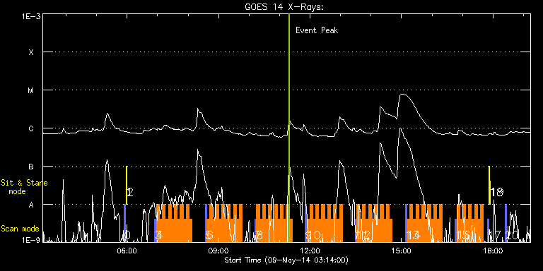 EIS Observation timeline overlay to GOES-Xray curve Code 1" 2" 40" 266" EIS Observations list for this event: STUDY ACRONYM ID DATE OBSERVED DESCRIPTION NOAA# TARGET 0 PRY_slot_contextLITE | 40315 | 2014/05/09 05:54:27 | EIS-AIA alignment study | 2054 | Active Region TIMELINE ID DATE OBSERVED FITS FILE XCEN (+W/-E) YCEN (+N/-S) DUR ----------------------------------------------------------------------------------------------------------------- 40315 | 2014/05/09 05:54:27.000 | eis_l0_20140509_055427.fits.gz | -15.29 | -0.42 | 2m56s 1 Alignment_266 | 40316 | 2014/05/09 05:57:42 | EIS-AIA alignment study | 2054 | Quiet Sun TIMELINE ID DATE OBSERVED FITS FILE XCEN (+W/-E) YCEN (+N/-S) DUR ----------------------------------------------------------------------------------------------------------------- 40316 | 2014/05/09 05:57:42.000 | eis_l0_20140509_055742.fits.gz | -132.57 | -0.58 | 1m22s 2 XRT_synop_AIA | 40317 | 2014/05/09 05:59:49 | EIS-AIA alignment study | 2054 | Quiet Sun TIMELINE ID DATE OBSERVED FITS FILE XCEN (+W/-E) YCEN (+N/-S) DUR ----------------------------------------------------------------------------------------------------------------- 40317 | 2014/05/09 05:59:49.000 | eis_l0_20140509_055949.fits.gz | -132.64 | -0.42 | 10s 3 PRY_slot_context_v3 | 40334 | 2014/05/09 06:54:27 | | 2054 | Active Region TIMELINE ID DATE OBSERVED FITS FILE XCEN (+W/-E) YCEN (+N/-S) DUR ----------------------------------------------------------------------------------------------------------------- 40334 | 2014/05/09 06:54:27.000 | eis_l0_20140509_065427.fits.gz | -35.92 | 0.81 | 2m56s 4 Cor_Hole_Jet_v1 | 40335 | 2014/05/09 06:57:48 | Hinode - La Palma joint observation (q | | Quiet Sun TIMELINE ID DATE OBSERVED FITS FILE XCEN (+W/-E) YCEN (+N/-S) DUR ----------------------------------------------------------------------------------------------------------------- 40335 | 2014/05/09 06:57:48.000 | eis_l0_20140509_065748.fits.gz | -21.63 | 0.81 | 5m47s 40335 | 2014/05/09 07:03:38.000 | eis_l0_20140509_070338.fits.gz | -20.71 | 0.89 | 5m47s 40335 | 2014/05/09 07:09:28.000 | eis_l0_20140509_070928.fits.gz | -19.86 | 0.66 | 5m47s 40335 | 2014/05/09 07:15:17.000 | eis_l0_20140509_071517.fits.gz | -18.93 | 0.81 | 5m47s 40335 | 2014/05/09 07:21:07.000 | eis_l0_20140509_072107.fits.gz | -18.00 | 0.50 | 5m47s 40335 | 2014/05/09 07:26:57.000 | eis_l0_20140509_072657.fits.gz | -17.15 | 0.74 | 5m46s 40335 | 2014/05/09 07:32:46.000 | eis_l0_20140509_073246.fits.gz | -16.30 | 0.50 | 5m47s 40335 | 2014/05/09 07:38:36.000 | eis_l0_20140509_073836.fits.gz | -15.30 | 0.66 | 5m46s 40335 | 2014/05/09 07:44:25.000 | eis_l0_20140509_074425.fits.gz | -14.45 | 0.50 | 5m47s 40335 | 2014/05/09 07:50:15.000 | eis_l0_20140509_075015.fits.gz | -13.52 | 0.58 | 5m46s 40335 | 2014/05/09 07:56:04.000 | eis_l0_20140509_075604.fits.gz | -12.67 | 0.50 | 5m47s 40335 | 2014/05/09 08:01:54.000 | eis_l0_20140509_080154.fits.gz | -11.75 | 0.58 | 5m46s 5 PRY_slot_context_v3 | 40336 | 2014/05/09 08:33:20 | | 2054 | Active Region TIMELINE ID DATE OBSERVED FITS FILE XCEN (+W/-E) YCEN (+N/-S) DUR ----------------------------------------------------------------------------------------------------------------- 40336 | 2014/05/09 08:33:20.000 | eis_l0_20140509_083320.fits.gz | -20.70 | 0.74 | 2m57s 6 Cor_Hole_Jet_v1 | 40337 | 2014/05/09 08:36:42 | Hinode - La Palma joint observation (q | | Quiet Sun TIMELINE ID DATE OBSERVED FITS FILE XCEN (+W/-E) YCEN (+N/-S) DUR ----------------------------------------------------------------------------------------------------------------- 40337 | 2014/05/09 08:36:42.000 | eis_l0_20140509_083642.fits.gz | -6.49 | 0.66 | 5m47s 40337 | 2014/05/09 08:42:32.000 | eis_l0_20140509_084232.fits.gz | -5.49 | 0.66 | 5m47s 40337 | 2014/05/09 08:48:22.000 | eis_l0_20140509_084822.fits.gz | -4.64 | 0.58 | 5m47s 40337 | 2014/05/09 08:54:11.000 | eis_l0_20140509_085411.fits.gz | -3.71 | 0.58 | 5m47s 40337 | 2014/05/09 09:00:01.000 | eis_l0_20140509_090001.fits.gz | -2.79 | 0.50 | 5m48s 40337 | 2014/05/09 09:05:51.000 | eis_l0_20140509_090551.fits.gz | -1.94 | 0.58 | 5m47s 40337 | 2014/05/09 09:11:41.000 | eis_l0_20140509_091141.fits.gz | -1.09 | 0.43 | 5m47s 40337 | 2014/05/09 09:17:31.000 | eis_l0_20140509_091731.fits.gz | -0.08 | 0.50 | 5m47s 40337 | 2014/05/09 09:23:20.000 | eis_l0_20140509_092320.fits.gz | 0.77 | 0.50 | 5m47s 40337 | 2014/05/09 09:29:10.000 | eis_l0_20140509_092910.fits.gz | 1.77 | 0.58 | 5m47s 40337 | 2014/05/09 09:35:00.000 | eis_l0_20140509_093500.fits.gz | 2.55 | 0.43 | 5m47s 40337 | 2014/05/09 09:40:50.000 | eis_l0_20140509_094050.fits.gz | 3.47 | 0.43 | 5m15s 7 PRY_slot_context_v3 | 40338 | 2014/05/09 10:11:21 | | | Active Region TIMELINE ID DATE OBSERVED FITS FILE XCEN (+W/-E) YCEN (+N/-S) DUR ----------------------------------------------------------------------------------------------------------------- 40338 | 2014/05/09 10:11:21.000 | eis_l0_20140509_101121.fits.gz | 78.64 | -594.77 | 2m56s 8 Cor_Hole_Jet_v1 | 40339 | 2014/05/09 10:14:42 | IRIS-EIS coronal hole jet observation | | Quiet Sun TIMELINE ID DATE OBSERVED FITS FILE XCEN (+W/-E) YCEN (+N/-S) DUR ----------------------------------------------------------------------------------------------------------------- 40339 | 2014/05/09 10:14:42.000 | eis_l0_20140509_101442.fits.gz | 99.18 | -543.92 | 5m47s 40339 | 2014/05/09 10:20:32.000 | eis_l0_20140509_102032.fits.gz | 99.80 | -543.92 | 5m47s 40339 | 2014/05/09 10:26:22.000 | eis_l0_20140509_102622.fits.gz | 100.42 | -544.15 | 5m47s 40339 | 2014/05/09 10:32:12.000 | eis_l0_20140509_103212.fits.gz | 100.96 | -544.00 | 5m47s 40339 | 2014/05/09 10:38:01.000 | eis_l0_20140509_103801.fits.gz | 101.65 | -544.08 | 5m48s 40339 | 2014/05/09 10:43:52.000 | eis_l0_20140509_104352.fits.gz | 102.19 | -544.15 | 5m47s 40339 | 2014/05/09 10:49:42.000 | eis_l0_20140509_104942.fits.gz | 102.81 | -544.08 | 5m46s 40339 | 2014/05/09 10:55:31.000 | eis_l0_20140509_105531.fits.gz | 103.43 | -544.15 | 5m47s 403