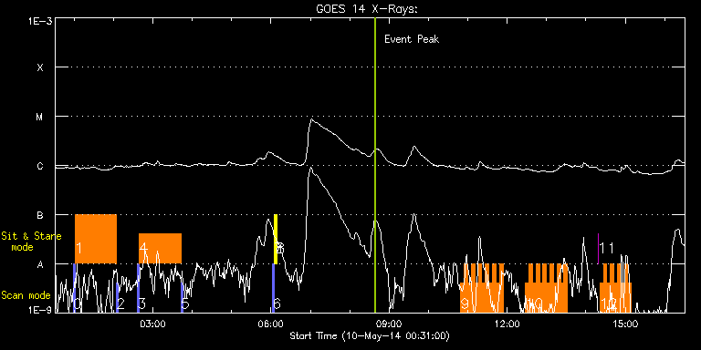 EIS Observation timeline overlay to GOES-Xray curve Code 1" 2" 40" 266" EIS Observations list for this event: STUDY ACRONYM ID DATE OBSERVED DESCRIPTION NOAA# TARGET 0 PRY_slot_context_v3 | 40328 | 2014/05/10 00:58:11 | HOP 249 - spicule evolution | | Active Region TIMELINE ID DATE OBSERVED FITS FILE XCEN (+W/-E) YCEN (+N/-S) DUR ----------------------------------------------------------------------------------------------------------------- 40328 | 2014/05/10 00:58:11.000 | eis_l0_20140510_005811.fits.gz | -30.35 | -945.47 | 2m56s 1 vhh_slowar_sas_1h6m | 40329 | 2014/05/10 01:01:32 | HOP 249 - spicule evolution | | Active Region TIMELINE ID DATE OBSERVED FITS FILE XCEN (+W/-E) YCEN (+N/-S) DUR ----------------------------------------------------------------------------------------------------------------- 40329 | 2014/05/10 01:01:32.000 | eis_l0_20140510_010132.fits.gz | -25.60 | -893.47 | 1h2m50s 2 PRY_slot_context_v3 | 40330 | 2014/05/10 02:04:33 | HOP 249 - spicule evolution | | Active Region TIMELINE ID DATE OBSERVED FITS FILE XCEN (+W/-E) YCEN (+N/-S) DUR ----------------------------------------------------------------------------------------------------------------- 40330 | 2014/05/10 02:04:33.000 | eis_l0_20140510_020433.fits.gz | -30.35 | -945.47 | 2m57s 3 PRY_slot_context_v3 | 40331 | 2014/05/10 02:36:14 | HOP 249 - spicule evolution | | Active Region TIMELINE ID DATE OBSERVED FITS FILE XCEN (+W/-E) YCEN (+N/-S) DUR ----------------------------------------------------------------------------------------------------------------- 40331 | 2014/05/10 02:36:14.000 | eis_l0_20140510_023614.fits.gz | -30.43 | -945.39 | 2m56s 4 vhh_slowar_sas_1h6m | 40332 | 2014/05/10 02:39:35 | HOP 249 - spicule evolution | | Active Region TIMELINE ID DATE OBSERVED FITS FILE XCEN (+W/-E) YCEN (+N/-S) DUR ----------------------------------------------------------------------------------------------------------------- 40332 | 2014/05/10 02:39:35.000 | eis_l0_20140510_023935.fits.gz | -25.60 | -893.55 | 1h2m50s 5 PRY_slot_context_v3 | 40333 | 2014/05/10 03:42:36 | HOP 249 - spicule evolution | | Active Region TIMELINE ID DATE OBSERVED FITS FILE XCEN (+W/-E) YCEN (+N/-S) DUR ----------------------------------------------------------------------------------------------------------------- 40333 | 2014/05/10 03:42:36.000 | eis_l0_20140510_034236.fits.gz | -30.35 | -945.55 | 2m56s 6 PRY_slot_contextLITE | 40321 | 2014/05/10 06:02:13 | EIS-AIA alignment study | 2054 | Active Region TIMELINE ID DATE OBSERVED FITS FILE XCEN (+W/-E) YCEN (+N/-S) DUR ----------------------------------------------------------------------------------------------------------------- 40321 | 2014/05/10 06:02:13.000 | eis_l0_20140510_060213.fits.gz | -15.14 | -0.50 | 2m56s 7 Alignment_266 | 40322 | 2014/05/10 06:05:27 | EIS-AIA alignment study | | Quiet Sun TIMELINE ID DATE OBSERVED FITS FILE XCEN (+W/-E) YCEN (+N/-S) DUR ----------------------------------------------------------------------------------------------------------------- 40322 | 2014/05/10 06:05:27.000 | eis_l0_20140510_060527.fits.gz | -132.41 | -0.50 | 1m22s 8 XRT_synop_AIA | 40323 | 2014/05/10 06:07:35 | EIS-AIA alignment study | | Quiet Sun TIMELINE ID DATE OBSERVED FITS FILE XCEN (+W/-E) YCEN (+N/-S) DUR ----------------------------------------------------------------------------------------------------------------- 40323 | 2014/05/10 06:07:35.000 | eis_l0_20140510_060735.fits.gz | -132.49 | -0.42 | 10s 40323 | 2014/05/10 06:07:50.000 | eis_l0_20140510_060750.fits.gz | -132.57 | -0.42 | 10s 40323 | 2014/05/10 06:08:05.000 | eis_l0_20140510_060805.fits.gz | -132.57 | -0.35 | 10s 40323 | 2014/05/10 06:08:21.000 | eis_l0_20140510_060821.fits.gz | -132.49 | -0.42 | 10s 9 HH_Flare+AR_180x152 | 40389 | 2014/05/10 10:49:20 | Flare Study | 2056 | Flare TIMELINE ID DATE OBSERVED FITS FILE XCEN (+W/-E) YCEN (+N/-S) DUR ----------------------------------------------------------------------------------------------------------------- 40389 | 2014/05/10 10:49:20.000 | eis_l0_20140510_104920.fits.gz | -406.49 | 97.37 | 5m18s 40389 | 2014/05/10 10:54:40.000 | eis_l0_20140510_105440.fits.gz | -405.64 | 97.45 | 5m19s 40389 | 2014/05/10 11:00:01.000 | eis_l0_20140510_110001.fits.gz | -404.87 | 97.45 | 5m18s 40389 | 2014/05/10 11:05:22.000 | eis_l0_20140510_110522.fits.gz | -404.09 | 97.30 | 5m18s 40389 | 2014/05/10 11:10:43.000 | eis_l0_20140510_111043.fits.gz | -403.40 | 97.37 | 5m18s 40389 | 2014/05/10 11:16:04.000 | eis_l0_20140510_111604.fits.gz | -402.55 | 97.30 | 5m18s 40389 | 2014/05/10 11:21:24.000 | eis_l0_20140510_112124.fits.gz | -401.93 | 97.30 | 5m18s 40389 | 2014/05/10 11:26:45.000 | eis_l0_20140510_112645.fits.gz | -401.23 | 97.37 | 5m18s 40389 | 2014/05/10 11:32:06.000 | eis_l0_20140510_113206.fits.gz | -400.39 | 97.45 | 5m18s 40389 | 2014/05/10 11:37:27.000 | eis_l0_20140510_113727.fits.gz | -399.69 | 97.37 | 5m18s 40389 | 2014/05/10 11:42:48.000 | eis_l0_20140510_114248.fits.gz | -398.84 | 97.45 | 5m18s 40389 | 2014/05/10 11:48:08.000 | eis_l0_20140510_114808.fits.gz | -398.07 | 97.53 | 5m18s 10 HH_Flare+AR_180x152 | 40390 | 2014/05/10 12:27:44 | Flare Study | 2056 | Flare TIMELINE ID DATE OBSERVED FITS FILE XCEN (+W/-E) YCEN (+N/-S) DUR ----------------------------------------------------------------------------------------------------------------- 40390 | 2014/05/10 12:27:44.000 | eis_l0_20140510_122744.fits.gz | -406.31 | 97.76 | 5m18s 40390 | 2014/05/10 12:33:05.000 | eis_l0_20140510_123305.fits.gz | -405.62 | 97.76 | 5m18s 40390 | 2014/05/10 12:38:25.000 | eis_l0_20140510_123825.fits.gz | -404.77 | 97.60 | 5m18s 40390 | 2014/05/10 12:43:46.000 | eis_l0_20140510_124346.fits.gz | -404.07 | 97.60 | 5m19s 40390 | 2014/05/10 12:49:07.000 | eis_l0_20140510_124907.fits.gz | -403.30 | 97.60 | 5m18s 40390 | 2014/05/10 12:54:28.000 | eis_l0_20140510_125428.fits.gz | -402.53 | 97.60 | 5m18s 40390 | 2014/05/10 12:59:49.000 | eis_l0_20140510_125949.fits.gz | -401.75 | 97.60 | 5