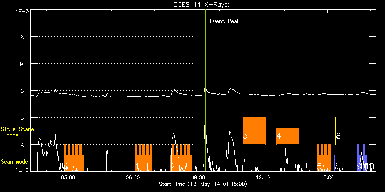 EIS Observation timeline overlay to GOES-Xray curve Code 1" 2" 40" 266" EIS Observations list for this event: STUDY ACRONYM ID DATE OBSERVED DESCRIPTION NOAA# TARGET 0 HH_Flare+AR_180x152 | 40409 | 2014/05/13 02:48:42 | Flare Study | 2056 | Flare TIMELINE ID DATE OBSERVED FITS FILE XCEN (+W/-E) YCEN (+N/-S) DUR ----------------------------------------------------------------------------------------------------------------- 40409 | 2014/05/13 02:48:42.000 | eis_l0_20140513_024842.fits.gz | 128.87 | 117.22 | 5m17s 40409 | 2014/05/13 02:54:02.000 | eis_l0_20140513_025402.fits.gz | 129.80 | 117.22 | 5m17s 40409 | 2014/05/13 02:59:22.000 | eis_l0_20140513_025922.fits.gz | 130.49 | 117.22 | 5m18s 40409 | 2014/05/13 03:04:43.000 | eis_l0_20140513_030443.fits.gz | 131.34 | 117.07 | 5m18s 40409 | 2014/05/13 03:10:03.000 | eis_l0_20140513_031003.fits.gz | 132.19 | 117.15 | 5m18s 40409 | 2014/05/13 03:15:24.000 | eis_l0_20140513_031524.fits.gz | 133.04 | 116.99 | 5m18s 40409 | 2014/05/13 03:20:45.000 | eis_l0_20140513_032045.fits.gz | 133.81 | 117.07 | 5m18s 40409 | 2014/05/13 03:26:06.000 | eis_l0_20140513_032606.fits.gz | 134.51 | 116.92 | 5m17s 40409 | 2014/05/13 03:31:26.000 | eis_l0_20140513_033126.fits.gz | 135.36 | 116.99 | 5m18s 40409 | 2014/05/13 03:36:47.000 | eis_l0_20140513_033647.fits.gz | 136.13 | 116.99 | 5m17s 1 HH_Flare+AR_180x152 | 40407 | 2014/05/13 06:05:42 | Flare Study | 2056 | Flare TIMELINE ID DATE OBSERVED FITS FILE XCEN (+W/-E) YCEN (+N/-S) DUR ----------------------------------------------------------------------------------------------------------------- 40407 | 2014/05/13 06:05:42.000 | eis_l0_20140513_060542.fits.gz | 158.76 | 116.84 | 5m18s 40407 | 2014/05/13 06:11:03.000 | eis_l0_20140513_061103.fits.gz | 159.61 | 116.61 | 5m17s 40407 | 2014/05/13 06:16:23.000 | eis_l0_20140513_061623.fits.gz | 160.46 | 116.53 | 5m18s 40407 | 2014/05/13 06:21:44.000 | eis_l0_20140513_062144.fits.gz | 161.31 | 116.53 | 5m17s 40407 | 2014/05/13 06:27:04.000 | eis_l0_20140513_062704.fits.gz | 162.01 | 116.68 | 5m18s 40407 | 2014/05/13 06:32:25.000 | eis_l0_20140513_063225.fits.gz | 162.93 | 116.53 | 5m18s 40407 | 2014/05/13 06:37:46.000 | eis_l0_20140513_063746.fits.gz | 163.63 | 116.53 | 5m18s 40407 | 2014/05/13 06:43:07.000 | eis_l0_20140513_064307.fits.gz | 164.40 | 116.53 | 5m17s 40407 | 2014/05/13 06:48:27.000 | eis_l0_20140513_064827.fits.gz | 165.25 | 116.45 | 5m19s 2 HH_Flare+AR_180x152 | 40419 | 2014/05/13 07:44:12 | Flare Study | 2056 | Flare TIMELINE ID DATE OBSERVED FITS FILE XCEN (+W/-E) YCEN (+N/-S) DUR ----------------------------------------------------------------------------------------------------------------- 40419 | 2014/05/13 07:44:12.000 | eis_l0_20140513_074412.fits.gz | 173.67 | 116.38 | 5m18s 40419 | 2014/05/13 07:49:33.000 | eis_l0_20140513_074933.fits.gz | 174.45 | 116.38 | 5m17s 40419 | 2014/05/13 07:54:53.000 | eis_l0_20140513_075453.fits.gz | 175.37 | 116.45 | 5m18s 40419 | 2014/05/13 08:00:13.000 | eis_l0_20140513_080013.fits.gz | 176.14 | 116.30 | 5m19s 40419 | 2014/05/13 08:05:35.000 | eis_l0_20140513_080535.fits.gz | 176.99 | 116.22 | 5m18s 40419 | 2014/05/13 08:10:55.000 | eis_l0_20140513_081055.fits.gz | 177.77 | 116.22 | 5m19s 40419 | 2014/05/13 08:16:17.000 | eis_l0_20140513_081617.fits.gz | 178.69 | 116.22 | 5m18s 40419 | 2014/05/13 08:21:38.000 | eis_l0_20140513_082138.fits.gz | 179.39 | 116.30 | 5m17s 40419 | 2014/05/13 08:26:58.000 | eis_l0_20140513_082658.fits.gz | 180.08 | 116.30 | 5m18s 40419 | 2014/05/13 08:32:19.000 | eis_l0_20140513_083219.fits.gz | 180.93 | 116.30 | 5m18s 40419 | 2014/05/13 08:37:40.000 | eis_l0_20140513_083740.fits.gz | 181.78 | 116.14 | 5m19s 3 vhh_slowar_sas_1h6m | 40422 | 2014/05/13 11:04:14 | IHOP249 | | Active Region TIMELINE ID DATE OBSERVED FITS FILE XCEN (+W/-E) YCEN (+N/-S) DUR ----------------------------------------------------------------------------------------------------------------- 40422 | 2014/05/13 11:04:14.000 | eis_l0_20140513_110414.fits.gz | 600.83 | -780.53 | 1h2m49s 4 vhh_slowar_sas_1h6m | 40425 | 2014/05/13 12:38:14 | IHOP249 | | Active Region TIMELINE ID DATE OBSERVED FITS FILE XCEN (+W/-E) YCEN (+N/-S) DUR ----------------------------------------------------------------------------------------------------------------- 40425 | 2014/05/13 12:38:14.000 | eis_l0_20140513_123814.fits.gz | 600.75 | -780.37 | 1h2m48s 5 HH_Flare+AR_180x152 | 40451 | 2014/05/13 14:30:44 | Flare study | | Flare TIMELINE ID DATE OBSERVED FITS FILE XCEN (+W/-E) YCEN (+N/-S) DUR ----------------------------------------------------------------------------------------------------------------- 40451 | 2014/05/13 14:30:44.000 | eis_l0_20140513_143044.fits.gz | 241.76 | 135.22 | 5m17s 40451 | 2014/05/13 14:36:04.000 | eis_l0_20140513_143604.fits.gz | 242.46 | 135.14 | 5m19s 40451 | 2014/05/13 14:41:26.000 | eis_l0_20140513_144126.fits.gz | 243.15 | 135.22 | 5m17s 40451 | 2014/05/13 14:46:46.000 | eis_l0_20140513_144646.fits.gz | 244.00 | 135.06 | 5m19s 40451 | 2014/05/13 14:52:07.000 | eis_l0_20140513_145207.fits.gz | 244.85 | 135.06 | 5m18s 40451 | 2014/05/13 14:57:28.000 | eis_l0_20140513_145728.fits.gz | 245.55 | 134.99 | 5m18s 40451 | 2014/05/13 15:02:49.000 | eis_l0_20140513_150249.fits.gz | 246.40 | 135.06 | 5m18s 6 PRY_slot_contextLITE | 40423 | 2014/05/13 15:18:21 | PRY_slotcontextLITE | 2056 | Active Region TIMELINE ID DATE OBSERVED FITS FILE XCEN (+W/-E) YCEN (+N/-S) DUR ----------------------------------------------------------------------------------------------------------------- 40423 | 2014/05/13 15:18:21.000 | eis_l0_20140513_151821.fits.gz | -15.21 | -0.50 | 2m56s 7 Alignment_266 | 40424 | 2014/05/13 15:21:37 | Alignment_266 | 2058 | Quiet Sun TIMELINE ID DATE OBSERVED FITS FILE XCEN (+W/-E) YCEN (+N/-S) DUR ----------------------------------------------------------------------------------------------------------------- 40424 | 2014/05/13 15:21:37.000 | eis_l0_20140513_152137.fits.gz | -132.57 | -0.50 | 1m22s 