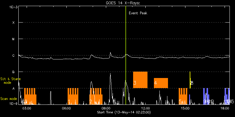 EIS Observation timeline overlay to GOES-Xray curve Code 1" 2" 40" 266" EIS Observations list for this event: STUDY ACRONYM ID DATE OBSERVED DESCRIPTION NOAA# TARGET 0 HH_Flare+AR_180x152 | 40409 | 2014/05/13 02:48:42 | Flare Study | 2056 | Flare TIMELINE ID DATE OBSERVED FITS FILE XCEN (+W/-E) YCEN (+N/-S) DUR ----------------------------------------------------------------------------------------------------------------- 40409 | 2014/05/13 02:48:42.000 | eis_l0_20140513_024842.fits.gz | 128.87 | 117.22 | 5m17s 40409 | 2014/05/13 02:54:02.000 | eis_l0_20140513_025402.fits.gz | 129.80 | 117.22 | 5m17s 40409 | 2014/05/13 02:59:22.000 | eis_l0_20140513_025922.fits.gz | 130.49 | 117.22 | 5m18s 40409 | 2014/05/13 03:04:43.000 | eis_l0_20140513_030443.fits.gz | 131.34 | 117.07 | 5m18s 40409 | 2014/05/13 03:10:03.000 | eis_l0_20140513_031003.fits.gz | 132.19 | 117.15 | 5m18s 40409 | 2014/05/13 03:15:24.000 | eis_l0_20140513_031524.fits.gz | 133.04 | 116.99 | 5m18s 40409 | 2014/05/13 03:20:45.000 | eis_l0_20140513_032045.fits.gz | 133.81 | 117.07 | 5m18s 40409 | 2014/05/13 03:26:06.000 | eis_l0_20140513_032606.fits.gz | 134.51 | 116.92 | 5m17s 40409 | 2014/05/13 03:31:26.000 | eis_l0_20140513_033126.fits.gz | 135.36 | 116.99 | 5m18s 40409 | 2014/05/13 03:36:47.000 | eis_l0_20140513_033647.fits.gz | 136.13 | 116.99 | 5m17s 1 HH_Flare+AR_180x152 | 40407 | 2014/05/13 06:05:42 | Flare Study | 2056 | Flare TIMELINE ID DATE OBSERVED FITS FILE XCEN (+W/-E) YCEN (+N/-S) DUR ----------------------------------------------------------------------------------------------------------------- 40407 | 2014/05/13 06:05:42.000 | eis_l0_20140513_060542.fits.gz | 158.76 | 116.84 | 5m18s 40407 | 2014/05/13 06:11:03.000 | eis_l0_20140513_061103.fits.gz | 159.61 | 116.61 | 5m17s 40407 | 2014/05/13 06:16:23.000 | eis_l0_20140513_061623.fits.gz | 160.46 | 116.53 | 5m18s 40407 | 2014/05/13 06:21:44.000 | eis_l0_20140513_062144.fits.gz | 161.31 | 116.53 | 5m17s 40407 | 2014/05/13 06:27:04.000 | eis_l0_20140513_062704.fits.gz | 162.01 | 116.68 | 5m18s 40407 | 2014/05/13 06:32:25.000 | eis_l0_20140513_063225.fits.gz | 162.93 | 116.53 | 5m18s 40407 | 2014/05/13 06:37:46.000 | eis_l0_20140513_063746.fits.gz | 163.63 | 116.53 | 5m18s 40407 | 2014/05/13 06:43:07.000 | eis_l0_20140513_064307.fits.gz | 164.40 | 116.53 | 5m17s 40407 | 2014/05/13 06:48:27.000 | eis_l0_20140513_064827.fits.gz | 165.25 | 116.45 | 5m19s 2 HH_Flare+AR_180x152 | 40419 | 2014/05/13 07:44:12 | Flare Study | 2056 | Flare TIMELINE ID DATE OBSERVED FITS FILE XCEN (+W/-E) YCEN (+N/-S) DUR ----------------------------------------------------------------------------------------------------------------- 40419 | 2014/05/13 07:44:12.000 | eis_l0_20140513_074412.fits.gz | 173.67 | 116.38 | 5m18s 40419 | 2014/05/13 07:49:33.000 | eis_l0_20140513_074933.fits.gz | 174.45 | 116.38 | 5m17s 40419 | 2014/05/13 07:54:53.000 | eis_l0_20140513_075453.fits.gz | 175.37 | 116.45 | 5m18s 40419 | 2014/05/13 08:00:13.000 | eis_l0_20140513_080013.fits.gz | 176.14 | 116.30 | 5m19s 40419 | 2014/05/13 08:05:35.000 | eis_l0_20140513_080535.fits.gz | 176.99 | 116.22 | 5m18s 40419 | 2014/05/13 08:10:55.000 | eis_l0_20140513_081055.fits.gz | 177.77 | 116.22 | 5m19s 40419 | 2014/05/13 08:16:17.000 | eis_l0_20140513_081617.fits.gz | 178.69 | 116.22 | 5m18s 40419 | 2014/05/13 08:21:38.000 | eis_l0_20140513_082138.fits.gz | 179.39 | 116.30 | 5m17s 40419 | 2014/05/13 08:26:58.000 | eis_l0_20140513_082658.fits.gz | 180.08 | 116.30 | 5m18s 40419 | 2014/05/13 08:32:19.000 | eis_l0_20140513_083219.fits.gz | 180.93 | 116.30 | 5m18s 40419 | 2014/05/13 08:37:40.000 | eis_l0_20140513_083740.fits.gz | 181.78 | 116.14 | 5m19s 3 vhh_slowar_sas_1h6m | 40422 | 2014/05/13 11:04:14 | IHOP249 | | Active Region TIMELINE ID DATE OBSERVED FITS FILE XCEN (+W/-E) YCEN (+N/-S) DUR ----------------------------------------------------------------------------------------------------------------- 40422 | 2014/05/13 11:04:14.000 | eis_l0_20140513_110414.fits.gz | 600.83 | -780.53 | 1h2m49s 4 vhh_slowar_sas_1h6m | 40425 | 2014/05/13 12:38:14 | IHOP249 | | Active Region TIMELINE ID DATE OBSERVED FITS FILE XCEN (+W/-E) YCEN (+N/-S) DUR ----------------------------------------------------------------------------------------------------------------- 40425 | 2014/05/13 12:38:14.000 | eis_l0_20140513_123814.fits.gz | 600.75 | -780.37 | 1h2m48s 5 HH_Flare+AR_180x152 | 40451 | 2014/05/13 14:30:44 | Flare study | | Flare TIMELINE ID DATE OBSERVED FITS FILE XCEN (+W/-E) YCEN (+N/-S) DUR ----------------------------------------------------------------------------------------------------------------- 40451 | 2014/05/13 14:30:44.000 | eis_l0_20140513_143044.fits.gz | 241.76 | 135.22 | 5m17s 40451 | 2014/05/13 14:36:04.000 | eis_l0_20140513_143604.fits.gz | 242.46 | 135.14 | 5m19s 40451 | 2014/05/13 14:41:26.000 | eis_l0_20140513_144126.fits.gz | 243.15 | 135.22 | 5m17s 40451 | 2014/05/13 14:46:46.000 | eis_l0_20140513_144646.fits.gz | 244.00 | 135.06 | 5m19s 40451 | 2014/05/13 14:52:07.000 | eis_l0_20140513_145207.fits.gz | 244.85 | 135.06 | 5m18s 40451 | 2014/05/13 14:57:28.000 | eis_l0_20140513_145728.fits.gz | 245.55 | 134.99 | 5m18s 40451 | 2014/05/13 15:02:49.000 | eis_l0_20140513_150249.fits.gz | 246.40 | 135.06 | 5m18s 6 PRY_slot_contextLITE | 40423 | 2014/05/13 15:18:21 | PRY_slotcontextLITE | 2056 | Active Region TIMELINE ID DATE OBSERVED FITS FILE XCEN (+W/-E) YCEN (+N/-S) DUR ----------------------------------------------------------------------------------------------------------------- 40423 | 2014/05/13 15:18:21.000 | eis_l0_20140513_151821.fits.gz | -15.21 | -0.50 | 2m56s 7 Alignment_266 | 40424 | 2014/05/13 15:21:37 | Alignment_266 | 2058 | Quiet Sun TIMELINE ID DATE OBSERVED FITS FILE XCEN (+W/-E) YCEN (+N/-S) DUR ----------------------------------------------------------------------------------------------------------------- 40424 | 2014/05/13 15:21:37.000 | eis_l0_20140513_152137.fits.gz | -132.57 | -0.50 | 1m22s 