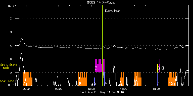 EIS Observation timeline overlay to GOES-Xray curve Code 1" 2" 40" 266" EIS Observations list for this event: STUDY ACRONYM ID DATE OBSERVED DESCRIPTION NOAA# TARGET 0 HH_Flare+AR_180x152 | 40461 | 2014/05/15 05:40:13 | Flare study | 2056 | Flare TIMELINE ID DATE OBSERVED FITS FILE XCEN (+W/-E) YCEN (+N/-S) DUR ----------------------------------------------------------------------------------------------------------------- 40461 | 2014/05/15 05:40:13.000 | eis_l0_20140515_054013.fits.gz | 607.52 | 105.94 | 5m18s 40461 | 2014/05/15 05:45:33.000 | eis_l0_20140515_054533.fits.gz | 608.21 | 105.79 | 5m18s 40461 | 2014/05/15 05:50:54.000 | eis_l0_20140515_055054.fits.gz | 608.91 | 105.79 | 5m19s 40461 | 2014/05/15 05:56:16.000 | eis_l0_20140515_055616.fits.gz | 609.60 | 105.79 | 5m17s 40461 | 2014/05/15 06:01:36.000 | eis_l0_20140515_060136.fits.gz | 610.22 | 105.71 | 5m18s 40461 | 2014/05/15 06:06:57.000 | eis_l0_20140515_060657.fits.gz | 610.92 | 105.63 | 5m18s 40461 | 2014/05/15 06:12:18.000 | eis_l0_20140515_061218.fits.gz | 611.54 | 105.56 | 5m17s 40461 | 2014/05/15 06:17:38.000 | eis_l0_20140515_061738.fits.gz | 612.15 | 105.63 | 5m18s 40461 | 2014/05/15 06:22:58.000 | eis_l0_20140515_062258.fits.gz | 612.85 | 105.48 | 5m18s 40461 | 2014/05/15 06:28:19.000 | eis_l0_20140515_062819.fits.gz | 613.47 | 105.48 | 5m18s 1 HH_Flare+AR_180x152 | 40501 | 2014/05/15 10:48:13 | Flare study | 2060 | Flare TIMELINE ID DATE OBSERVED FITS FILE XCEN (+W/-E) YCEN (+N/-S) DUR ----------------------------------------------------------------------------------------------------------------- 40501 | 2014/05/15 10:48:13.000 | eis_l0_20140515_104813.fits.gz | 108.17 | -258.45 | 5m18s 40501 | 2014/05/15 10:53:34.000 | eis_l0_20140515_105334.fits.gz | 109.02 | -258.52 | 5m18s 40501 | 2014/05/15 10:58:55.000 | eis_l0_20140515_105855.fits.gz | 109.71 | -258.60 | 5m18s 40501 | 2014/05/15 11:04:16.000 | eis_l0_20140515_110416.fits.gz | 110.48 | -258.75 | 5m18s 40501 | 2014/05/15 11:09:37.000 | eis_l0_20140515_110937.fits.gz | 111.26 | -258.68 | 5m19s 40501 | 2014/05/15 11:14:58.000 | eis_l0_20140515_111458.fits.gz | 112.11 | -258.68 | 5m18s 40501 | 2014/05/15 11:20:19.000 | eis_l0_20140515_112019.fits.gz | 112.80 | -258.75 | 5m17s 40501 | 2014/05/15 11:25:39.000 | eis_l0_20140515_112539.fits.gz | 113.65 | -258.68 | 5m18s 40501 | 2014/05/15 11:31:00.000 | eis_l0_20140515_113100.fits.gz | 114.27 | -258.83 | 5m18s 2 PRY_slot_contextLITE | 40538 | 2014/05/15 12:16:21 | HOP247 | 2058 | Active Region TIMELINE ID DATE OBSERVED FITS FILE XCEN (+W/-E) YCEN (+N/-S) DUR ----------------------------------------------------------------------------------------------------------------- 40538 | 2014/05/15 12:16:21.000 | eis_l0_20140515_121621.fits.gz | 107.92 | -225.45 | 2m56s 3 High_cadence_AR_dens | 40539 | 2014/05/15 12:19:28 | HOP247 | | Active Region TIMELINE ID DATE OBSERVED FITS FILE XCEN (+W/-E) YCEN (+N/-S) DUR ----------------------------------------------------------------------------------------------------------------- 40539 | 2014/05/15 12:19:28.000 | eis_l0_20140515_121928.fits.gz | 136.26 | -258.83 | 10m42s 40539 | 2014/05/15 12:30:12.000 | eis_l0_20140515_123012.fits.gz | 137.88 | -258.91 | 10m42s 40539 | 2014/05/15 12:40:56.000 | eis_l0_20140515_124056.fits.gz | 139.43 | -258.91 | 10m43s 40539 | 2014/05/15 12:51:41.000 | eis_l0_20140515_125141.fits.gz | 140.97 | -258.91 | 10m43s 40539 | 2014/05/15 13:02:26.000 | eis_l0_20140515_130226.fits.gz | 142.52 | -258.91 | 10m44s 4 PRY_slot_contextLITE | 40540 | 2014/05/15 13:13:35 | HOP247 | 2058 | Active Region TIMELINE ID DATE OBSERVED FITS FILE XCEN (+W/-E) YCEN (+N/-S) DUR ----------------------------------------------------------------------------------------------------------------- 40540 | 2014/05/15 13:13:35.000 | eis_l0_20140515_131335.fits.gz | 116.19 | -225.99 | 2m56s 5 HH_Flare+AR_180x152 | 40503 | 2014/05/15 14:38:34 | Flare study | 2056 | Flare TIMELINE ID DATE OBSERVED FITS FILE XCEN (+W/-E) YCEN (+N/-S) DUR ----------------------------------------------------------------------------------------------------------------- 40503 | 2014/05/15 14:38:34.000 | eis_l0_20140515_143834.fits.gz | 653.59 | 92.65 | 5m19s 40503 | 2014/05/15 14:43:55.000 | eis_l0_20140515_144355.fits.gz | 654.14 | 92.73 | 5m18s 40503 | 2014/05/15 14:49:16.000 | eis_l0_20140515_144916.fits.gz | 654.83 | 92.81 | 5m18s 40503 | 2014/05/15 14:54:37.000 | eis_l0_20140515_145437.fits.gz | 655.37 | 92.73 | 5m18s 6 HH_Flare+AR_180x152 | 40504 | 2014/05/15 15:55:10 | Flare study | | Flare TIMELINE ID DATE OBSERVED FITS FILE XCEN (+W/-E) YCEN (+N/-S) DUR ----------------------------------------------------------------------------------------------------------------- 40504 | 2014/05/15 15:55:10.000 | eis_l0_20140515_155510.fits.gz | 662.09 | 92.27 | 5m18s 40504 | 2014/05/15 16:00:30.000 | eis_l0_20140515_160030.fits.gz | 662.63 | 92.34 | 5m19s 40504 | 2014/05/15 16:05:52.000 | eis_l0_20140515_160552.fits.gz | 663.17 | 92.27 | 5m17s 40504 | 2014/05/15 16:11:12.000 | eis_l0_20140515_161112.fits.gz | 663.79 | 92.27 | 5m17s 40504 | 2014/05/15 16:16:32.000 | eis_l0_20140515_161632.fits.gz | 664.41 | 92.19 | 5m18s 40504 | 2014/05/15 16:21:53.000 | eis_l0_20140515_162153.fits.gz | 664.95 | 92.19 | 3m42s 40504 | 2014/05/15 16:25:04.000 | eis_l0_20140515_162504.fits.gz | 665.34 | 92.19 | 2m6s 40504 | 2014/05/15 16:27:13.000 | eis_l0_20140515_162713.fits.gz | 665.57 | 92.11 | 5m18s 40504 | 2014/05/15 16:32:34.000 | eis_l0_20140515_163234.fits.gz | 666.18 | 92.19 | 5m18s 7 PRY_slot_contextLITE | 40517 | 2014/05/15 18:03:21 | PRY_slot_contextLITE | 2058 | Active Region TIMELINE ID DATE OBSERVED FITS FILE XCEN (+W/-E) YCEN (+N/-S) DUR ----------------------------------------------------------------------------------------------------------------- 40517 | 2014/05/15 18:03:21.000 | eis_l0_20140515_180321.fits.gz | -15.29 | -0.58 | 2m56s 8 Alignment_266 | 40518 | 2014/05/15 18:06:36 | Alignment_266 | | Quiet Sun TIME