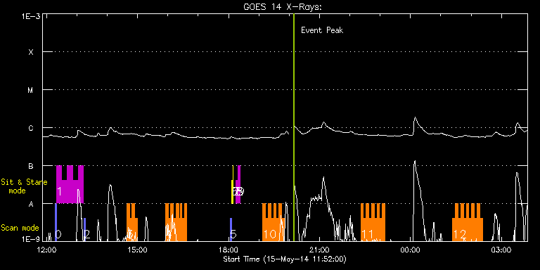 EIS Observation timeline overlay to GOES-Xray curve Code 1" 2" 40" 266" EIS Observations list for this event: STUDY ACRONYM ID DATE OBSERVED DESCRIPTION NOAA# TARGET 0 PRY_slot_contextLITE | 40538 | 2014/05/15 12:16:21 | HOP247 | 2058 | Active Region TIMELINE ID DATE OBSERVED FITS FILE XCEN (+W/-E) YCEN (+N/-S) DUR ----------------------------------------------------------------------------------------------------------------- 40538 | 2014/05/15 12:16:21.000 | eis_l0_20140515_121621.fits.gz | 107.92 | -225.45 | 2m56s 1 High_cadence_AR_dens | 40539 | 2014/05/15 12:19:28 | HOP247 | | Active Region TIMELINE ID DATE OBSERVED FITS FILE XCEN (+W/-E) YCEN (+N/-S) DUR ----------------------------------------------------------------------------------------------------------------- 40539 | 2014/05/15 12:19:28.000 | eis_l0_20140515_121928.fits.gz | 136.26 | -258.83 | 10m42s 40539 | 2014/05/15 12:30:12.000 | eis_l0_20140515_123012.fits.gz | 137.88 | -258.91 | 10m42s 40539 | 2014/05/15 12:40:56.000 | eis_l0_20140515_124056.fits.gz | 139.43 | -258.91 | 10m43s 40539 | 2014/05/15 12:51:41.000 | eis_l0_20140515_125141.fits.gz | 140.97 | -258.91 | 10m43s 40539 | 2014/05/15 13:02:26.000 | eis_l0_20140515_130226.fits.gz | 142.52 | -258.91 | 10m44s 2 PRY_slot_contextLITE | 40540 | 2014/05/15 13:13:35 | HOP247 | 2058 | Active Region TIMELINE ID DATE OBSERVED FITS FILE XCEN (+W/-E) YCEN (+N/-S) DUR ----------------------------------------------------------------------------------------------------------------- 40540 | 2014/05/15 13:13:35.000 | eis_l0_20140515_131335.fits.gz | 116.19 | -225.99 | 2m56s 3 HH_Flare+AR_180x152 | 40503 | 2014/05/15 14:38:34 | Flare study | 2056 | Flare TIMELINE ID DATE OBSERVED FITS FILE XCEN (+W/-E) YCEN (+N/-S) DUR ----------------------------------------------------------------------------------------------------------------- 40503 | 2014/05/15 14:38:34.000 | eis_l0_20140515_143834.fits.gz | 653.59 | 92.65 | 5m19s 40503 | 2014/05/15 14:43:55.000 | eis_l0_20140515_144355.fits.gz | 654.14 | 92.73 | 5m18s 40503 | 2014/05/15 14:49:16.000 | eis_l0_20140515_144916.fits.gz | 654.83 | 92.81 | 5m18s 40503 | 2014/05/15 14:54:37.000 | eis_l0_20140515_145437.fits.gz | 655.37 | 92.73 | 5m18s 4 HH_Flare+AR_180x152 | 40504 | 2014/05/15 15:55:10 | Flare study | | Flare TIMELINE ID DATE OBSERVED FITS FILE XCEN (+W/-E) YCEN (+N/-S) DUR ----------------------------------------------------------------------------------------------------------------- 40504 | 2014/05/15 15:55:10.000 | eis_l0_20140515_155510.fits.gz | 662.09 | 92.27 | 5m18s 40504 | 2014/05/15 16:00:30.000 | eis_l0_20140515_160030.fits.gz | 662.63 | 92.34 | 5m19s 40504 | 2014/05/15 16:05:52.000 | eis_l0_20140515_160552.fits.gz | 663.17 | 92.27 | 5m17s 40504 | 2014/05/15 16:11:12.000 | eis_l0_20140515_161112.fits.gz | 663.79 | 92.27 | 5m17s 40504 | 2014/05/15 16:16:32.000 | eis_l0_20140515_161632.fits.gz | 664.41 | 92.19 | 5m18s 40504 | 2014/05/15 16:21:53.000 | eis_l0_20140515_162153.fits.gz | 664.95 | 92.19 | 3m42s 40504 | 2014/05/15 16:25:04.000 | eis_l0_20140515_162504.fits.gz | 665.34 | 92.19 | 2m6s 40504 | 2014/05/15 16:27:13.000 | eis_l0_20140515_162713.fits.gz | 665.57 | 92.11 | 5m18s 40504 | 2014/05/15 16:32:34.000 | eis_l0_20140515_163234.fits.gz | 666.18 | 92.19 | 5m18s 5 PRY_slot_contextLITE | 40517 | 2014/05/15 18:03:21 | PRY_slot_contextLITE | 2058 | Active Region TIMELINE ID DATE OBSERVED FITS FILE XCEN (+W/-E) YCEN (+N/-S) DUR ----------------------------------------------------------------------------------------------------------------- 40517 | 2014/05/15 18:03:21.000 | eis_l0_20140515_180321.fits.gz | -15.29 | -0.58 | 2m56s 6 Alignment_266 | 40518 | 2014/05/15 18:06:36 | Alignment_266 | | Quiet Sun TIMELINE ID DATE OBSERVED FITS FILE XCEN (+W/-E) YCEN (+N/-S) DUR ----------------------------------------------------------------------------------------------------------------- 40518 | 2014/05/15 18:06:36.000 | eis_l0_20140515_180636.fits.gz | -132.49 | -0.50 | 1m22s 7 XRT_synop_AIA | 40519 | 2014/05/15 18:08:43 | XRT_synop_AIA | | Quiet Sun TIMELINE ID DATE OBSERVED FITS FILE XCEN (+W/-E) YCEN (+N/-S) DUR ----------------------------------------------------------------------------------------------------------------- 40519 | 2014/05/15 18:08:43.000 | eis_l0_20140515_180843.fits.gz | -132.57 | -0.50 | 10s 8 regcal071 | 40499 | 2014/05/15 18:15:12 | Dark exposures, CCD bottom rows (100s | | Engineering TIMELINE ID DATE OBSERVED FITS FILE XCEN (+W/-E) YCEN (+N/-S) DUR ----------------------------------------------------------------------------------------------------------------- 40499 | 2014/05/15 18:15:12.000 | eis_l0_20140515_181512.fits.gz | 14.51 | -305.58 | 3m21s 9 regcal072 | 40500 | 2014/05/15 18:19:00 | Dark exposures, top CCD rows (100s exp | | Engineering TIMELINE ID DATE OBSERVED FITS FILE XCEN (+W/-E) YCEN (+N/-S) DUR ----------------------------------------------------------------------------------------------------------------- 40500 | 2014/05/15 18:19:00.000 | eis_l0_20140515_181900.fits.gz | 14.51 | 205.58 | 3m22s 10 HH_Flare+AR_180x152 | 40506 | 2014/05/15 19:07:50 | Flare study | | Flare TIMELINE ID DATE OBSERVED FITS FILE XCEN (+W/-E) YCEN (+N/-S) DUR ----------------------------------------------------------------------------------------------------------------- 40506 | 2014/05/15 19:07:50.000 | eis_l0_20140515_190750.fits.gz | 682.87 | 91.11 | 5m17s 40506 | 2014/05/15 19:13:10.000 | eis_l0_20140515_191310.fits.gz | 683.33 | 91.11 | 5m19s 40506 | 2014/05/15 19:18:32.000 | eis_l0_20140515_191832.fits.gz | 683.95 | 91.11 | 5m17s 40506 | 2014/05/15 19:23:52.000 | eis_l0_20140515_192352.fits.gz | 684.57 | 91.03 | 5m17s 40506 | 2014/05/15 19:29:12.000 | eis_l0_20140515_192912.fits.gz | 685.11 | 91.11 | 5m18s 40506 | 2014/05/15 19:34:33.000 | eis_l0_20140515_193433.fits.gz | 685.73 | 90.95 | 5m18s 40506 | 2014/05/15 19:39:54.000 | eis_l0_20140515_193954.fits.gz | 686.19 | 90.88 | 5m18s 40506 | 2014/05/15 19:4